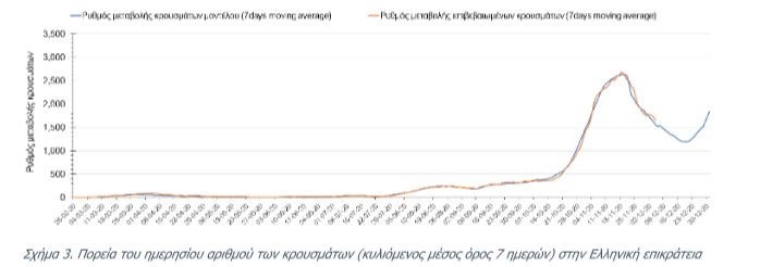 “Ο υψηλός αριθμός των θανάτων σε συνδυασμό με την παρατηρούμενη μείωση των επιβεβαιωμένων κρουσμάτων σε σχέση με την προηγούμενη εβδομάδα μπορεί να ερμηνευθεί από το γεγονός ότι έγινε πιο συνεπής εφαρμογή του lockdown μετά τις 17-18 Νοεμβρίου, περίπου 10 μέρες μετά την ανακοίνωση του. O ρυθμός αύξησης των θανάτων έχει αρχίσει να κάμπτεται, και σήμερα είναι η πρώτη μέρα που αλλάζει η κλίση της καμπύλης του κυλιόμενου μέσου όρου των 7 ημερών, γεγονός που συνάδει και με τις προβλέψεις του μοντέλου. Εντούτοις, παρόλο που τα σημερινά μηνύματα για το σύνολο της χώρας είναι αισιόδοξα, σε συγκεκριμένες περιοχές όπως η Ημαθία (42 κρούσματα σήμερα), η Πέλλα (58 κρούσματα σήμερα), η Ξάνθη (44 κρούσματα σήμερα), η Καρδίτσα (43 κρούσματα σήμερα) και το Κιλκίς (40 κρούσματα σήμερα) δεν ακολουθείται η ίδια πορεία και άρα χρειάζεται προσοχή στην τήρηση των μέτρων.
