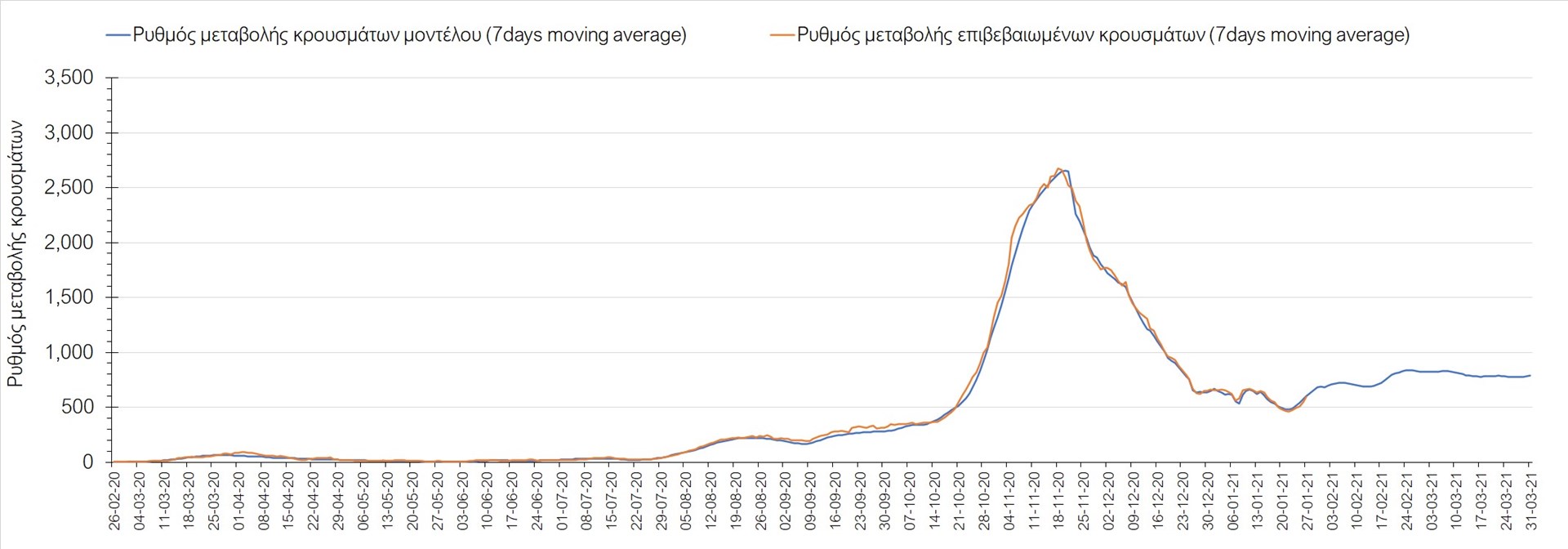 Σχήμα 4. Πορεία του ημερησίου αριθμού των κρουσμάτων (κυλιόμενος μέσος όρος 7 ημερών) στην Αττική