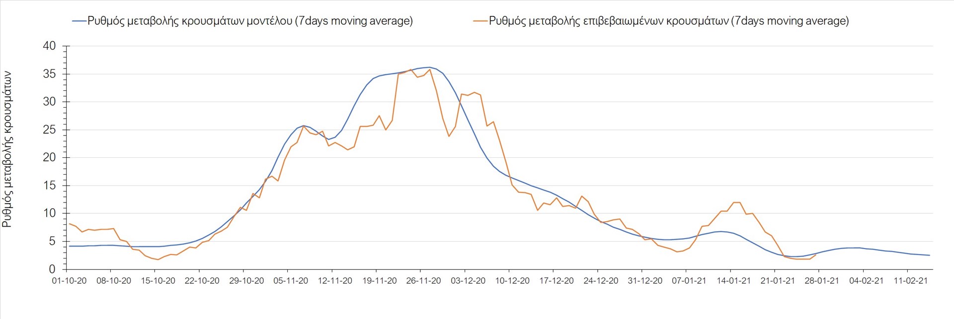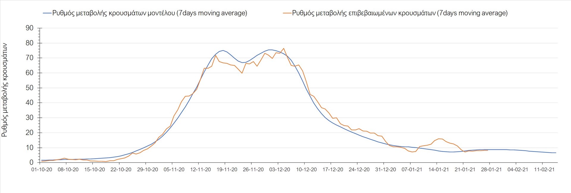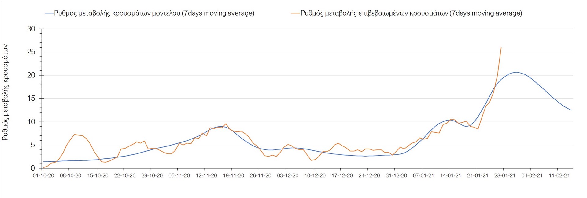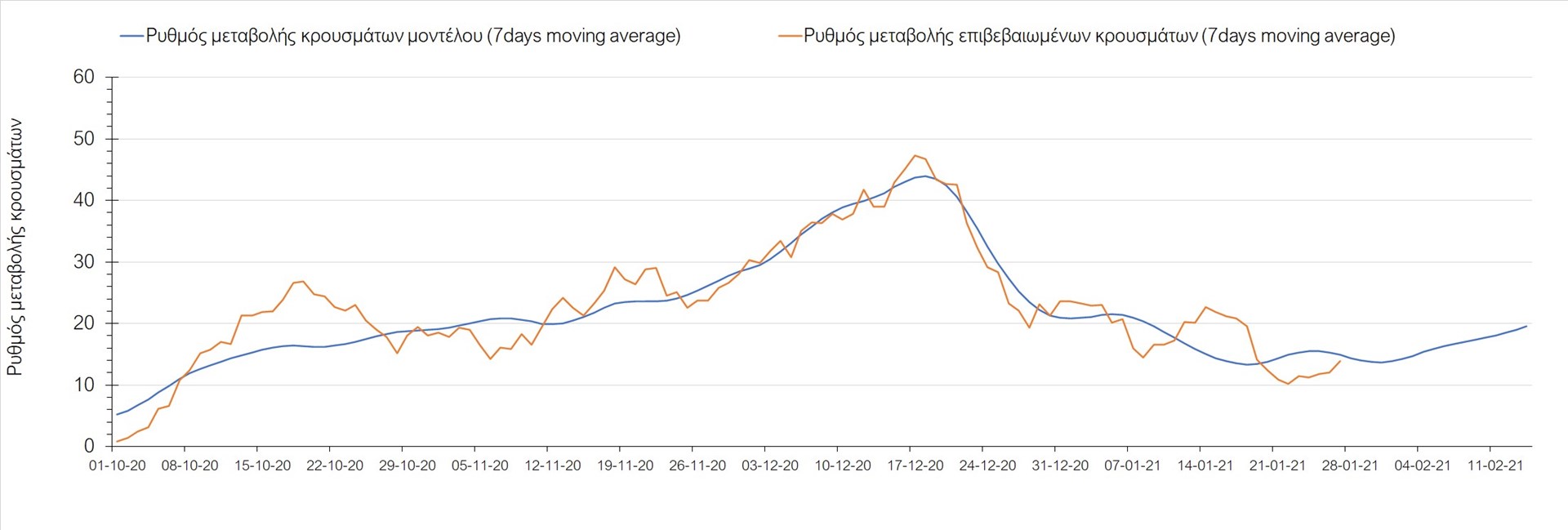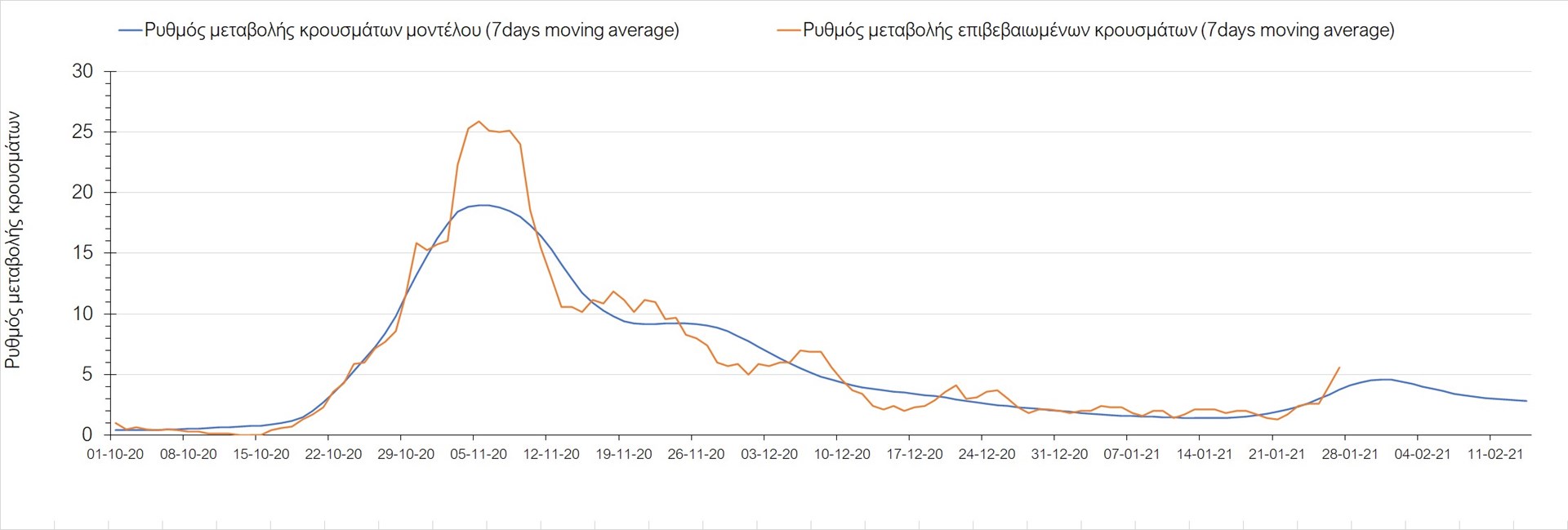Όπως φαίνεται από το διάγραμμα, από τις 8 Ιανουαρίου έχουμε μια αύξηση κρουσμάτων μέχρι τις 11 Ιανουαρίου η οποία οφείλεται στη μείωση της περιστολής που σημειώθηκε στις γιορτές. Από τις 11 μέχρι τις 18 Ιανουαρίου προβλεπόταν μια μείωση κρουσμάτων λόγω της εφαρμογής του lockdown που είναι σε ισχύ και αυτήν την εβδομάδα και η οποία όντως παρατηρήθηκε. Εντούτοις, όπως είχαμε προβλέψει, από τις 23 Ιανουαρίου και έπειτα διαφαίνεται αύξηση στον κυλιόμενο μέσο όρο των κρουσμάτων, η οποία δυστυχώς είναι υψηλότερη από την αναμενόμενη.