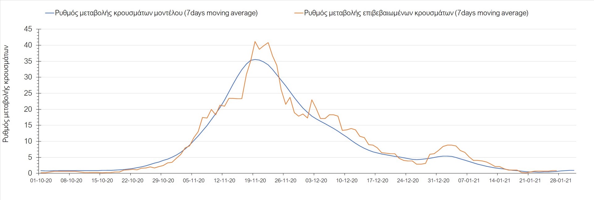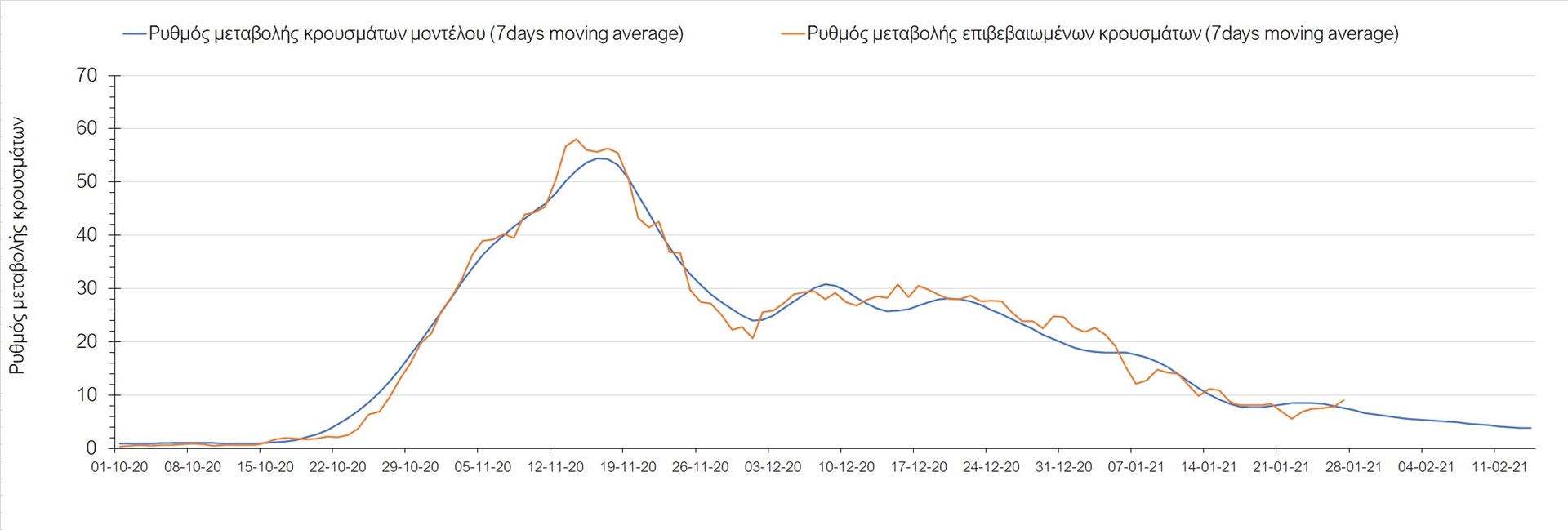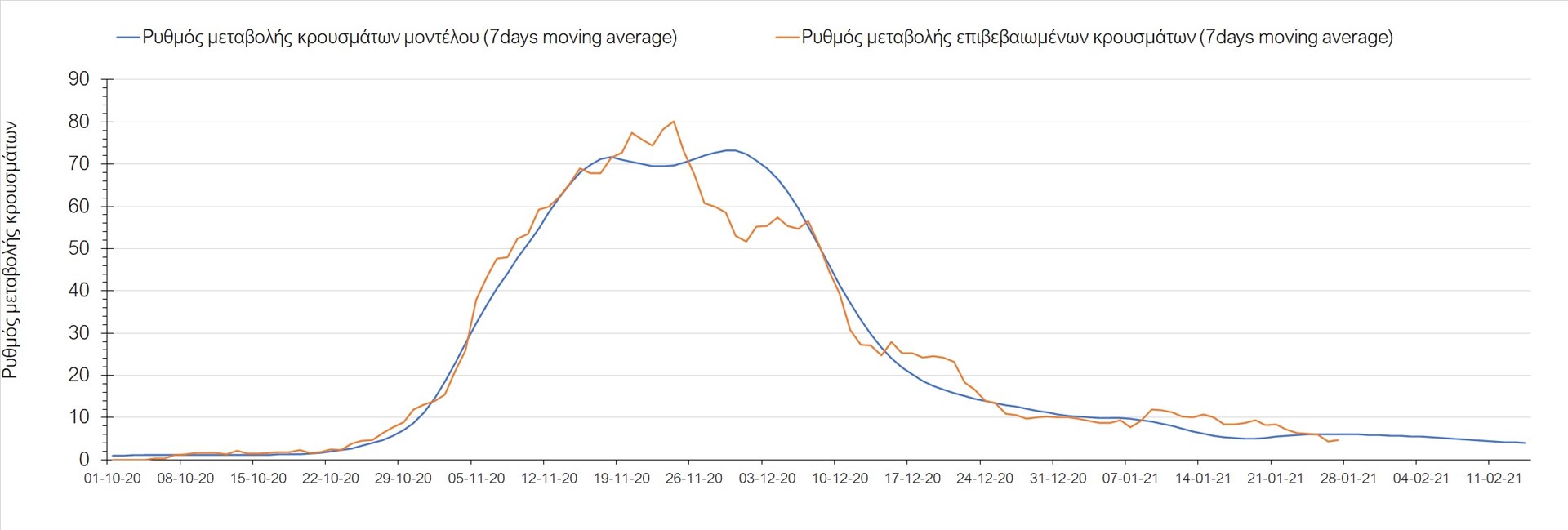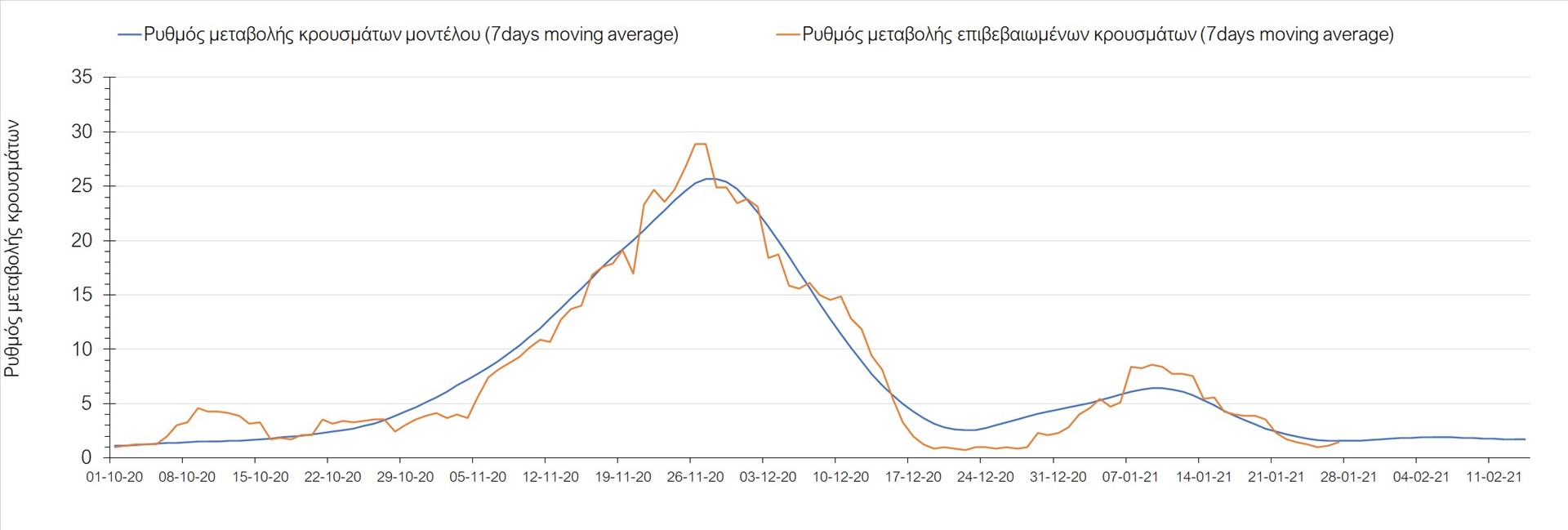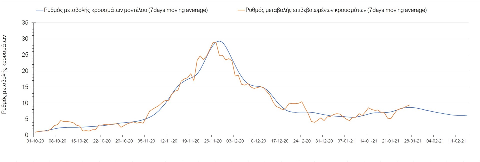 Όπως φαίνεται από το διάγραμμα, από τις 8 Ιανουαρίου έχουμε μια αύξηση κρουσμάτων μέχρι τις 11 Ιανουαρίου η οποία οφείλεται στη μείωση της περιστολής που σημειώθηκε στις γιορτές. Από τις 11 μέχρι τις 18 Ιανουαρίου προβλεπόταν μια μείωση κρουσμάτων λόγω της εφαρμογής του lockdown που είναι σε ισχύ και αυτήν την εβδομάδα και η οποία όντως παρατηρήθηκε. Εντούτοις, όπως είχαμε προβλέψει, από τις 23 Ιανουαρίου και έπειτα διαφαίνεται αύξηση στον κυλιόμενο μέσο όρο των κρουσμάτων, η οποία δυστυχώς είναι υψηλότερη από την αναμενόμενη.