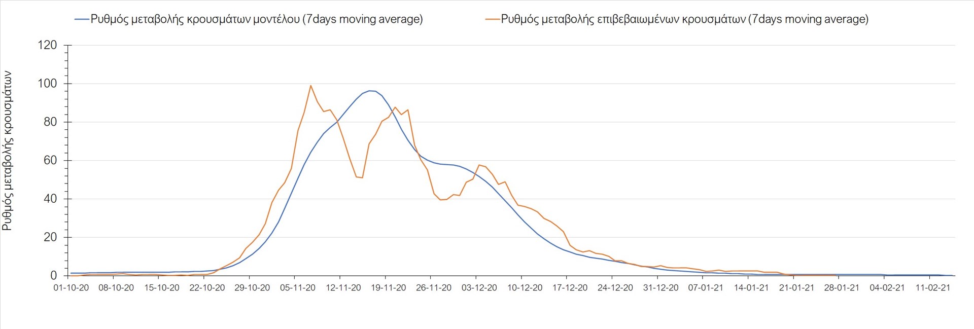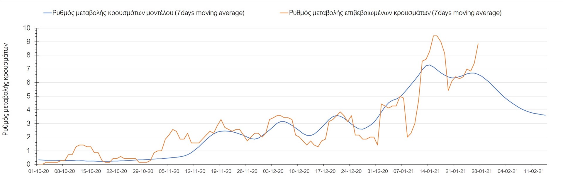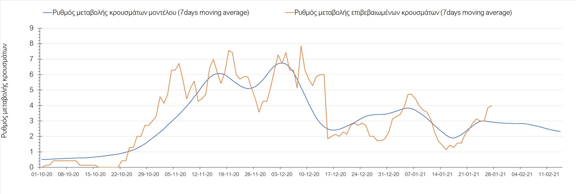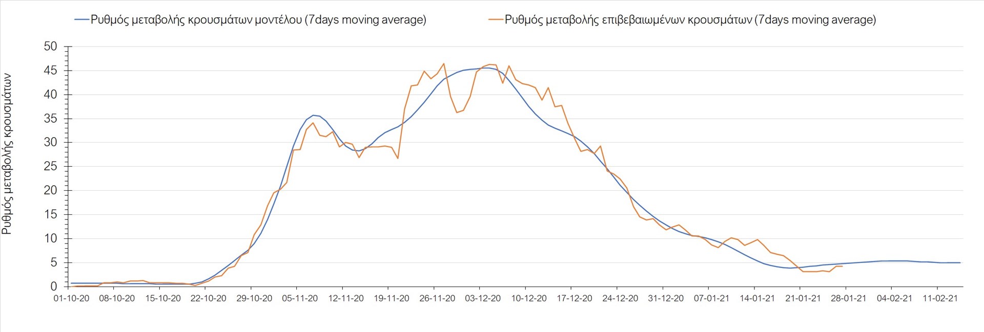 Όπως φαίνεται από το διάγραμμα, από τις 8 Ιανουαρίου έχουμε μια αύξηση κρουσμάτων μέχρι τις 11 Ιανουαρίου η οποία οφείλεται στη μείωση της περιστολής που σημειώθηκε στις γιορτές. Από τις 11 μέχρι τις 18 Ιανουαρίου προβλεπόταν μια μείωση κρουσμάτων λόγω της εφαρμογής του lockdown που είναι σε ισχύ και αυτήν την εβδομάδα και η οποία όντως παρατηρήθηκε. Εντούτοις, όπως είχαμε προβλέψει, από τις 23 Ιανουαρίου και έπειτα διαφαίνεται αύξηση στον κυλιόμενο μέσο όρο των κρουσμάτων, η οποία δυστυχώς είναι υψηλότερη από την αναμενόμενη.