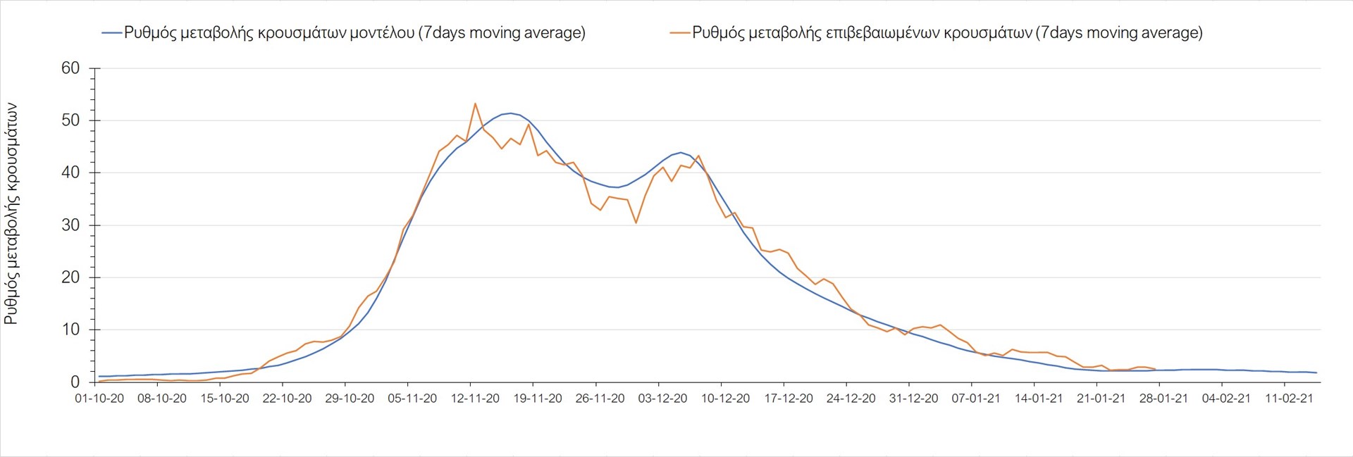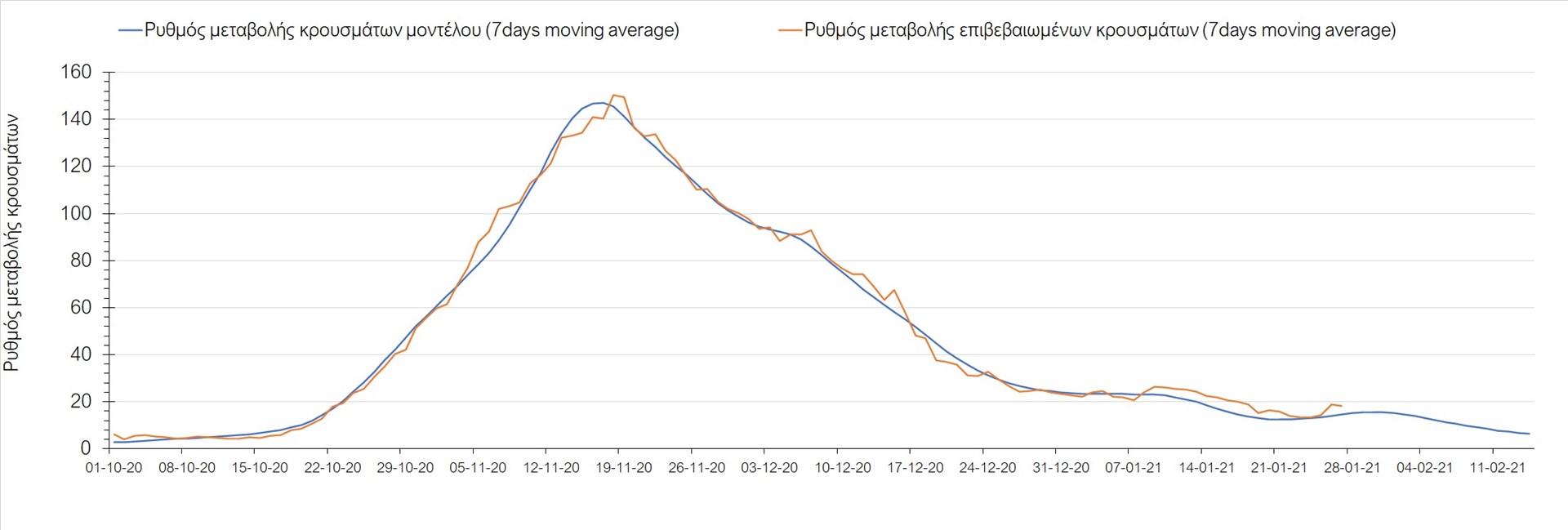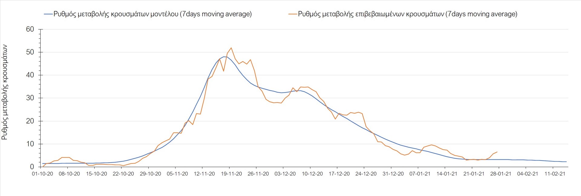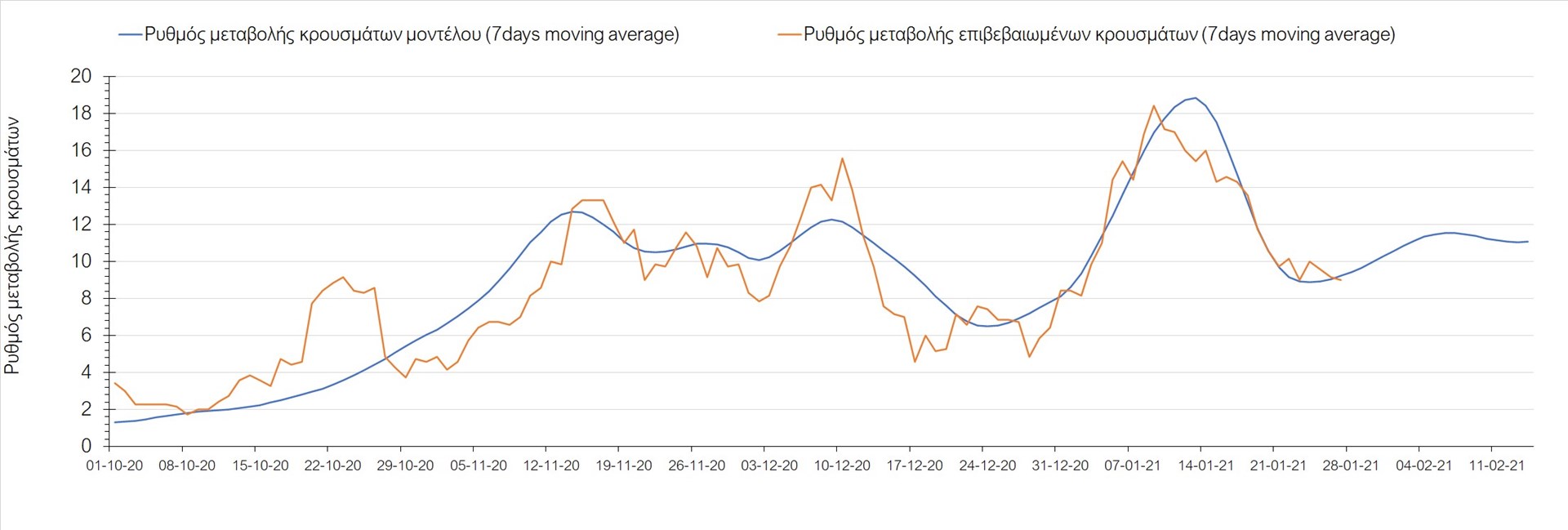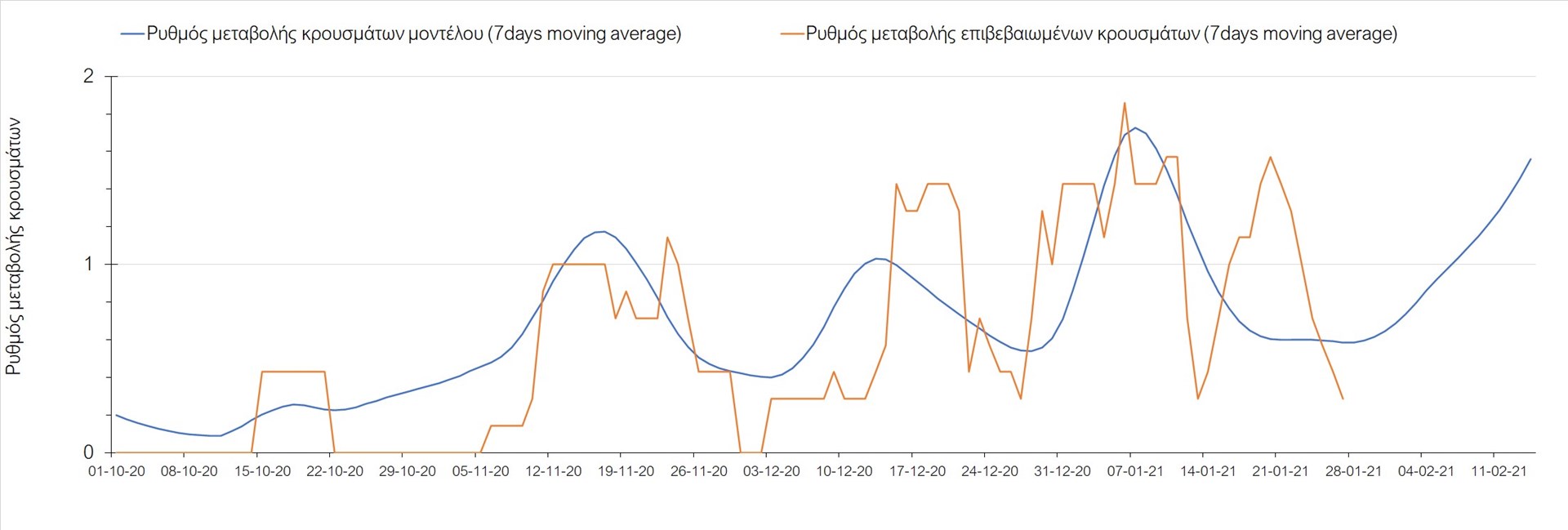 Όπως φαίνεται από το διάγραμμα, από τις 8 Ιανουαρίου έχουμε μια αύξηση κρουσμάτων μέχρι τις 11 Ιανουαρίου η οποία οφείλεται στη μείωση της περιστολής που σημειώθηκε στις γιορτές. Από τις 11 μέχρι τις 18 Ιανουαρίου προβλεπόταν μια μείωση κρουσμάτων λόγω της εφαρμογής του lockdown που είναι σε ισχύ και αυτήν την εβδομάδα και η οποία όντως παρατηρήθηκε. Εντούτοις, όπως είχαμε προβλέψει, από τις 23 Ιανουαρίου και έπειτα διαφαίνεται αύξηση στον κυλιόμενο μέσο όρο των κρουσμάτων, η οποία δυστυχώς είναι υψηλότερη από την αναμενόμενη.