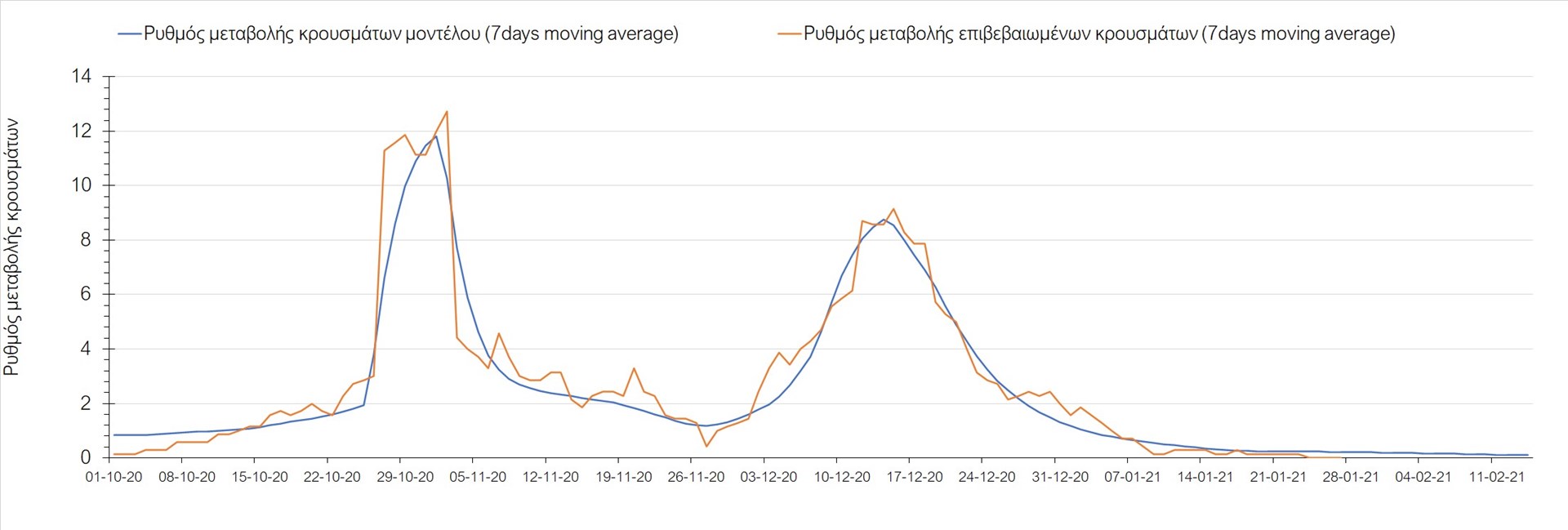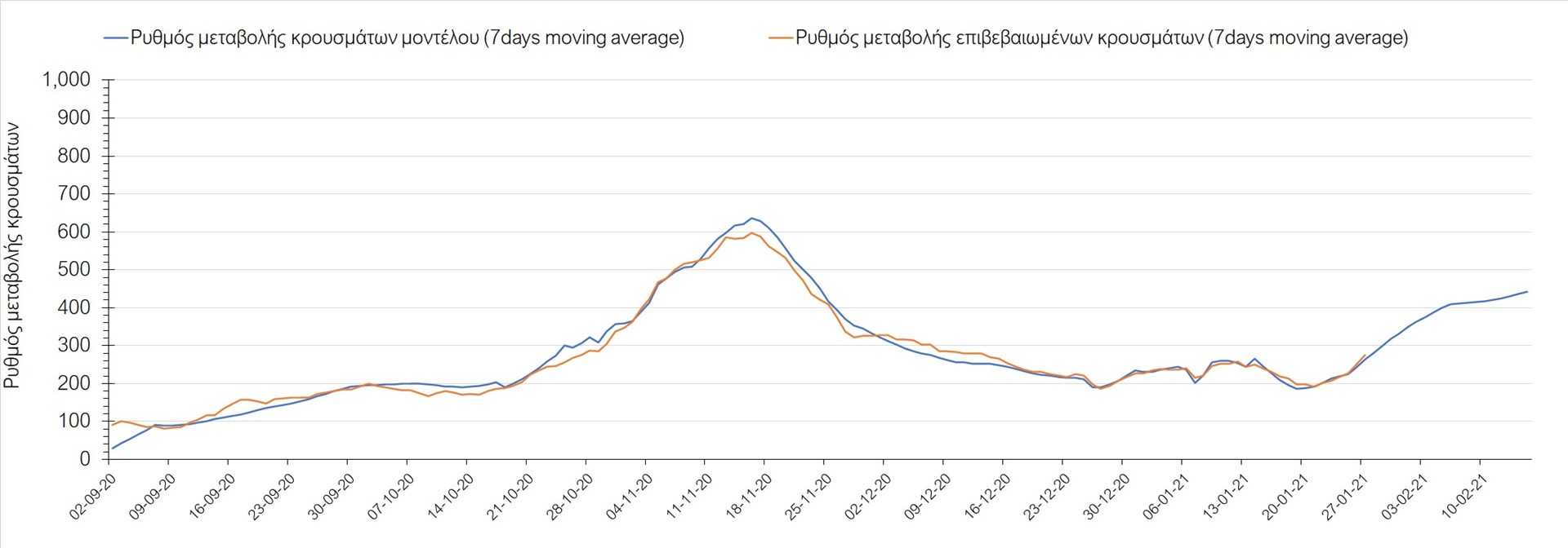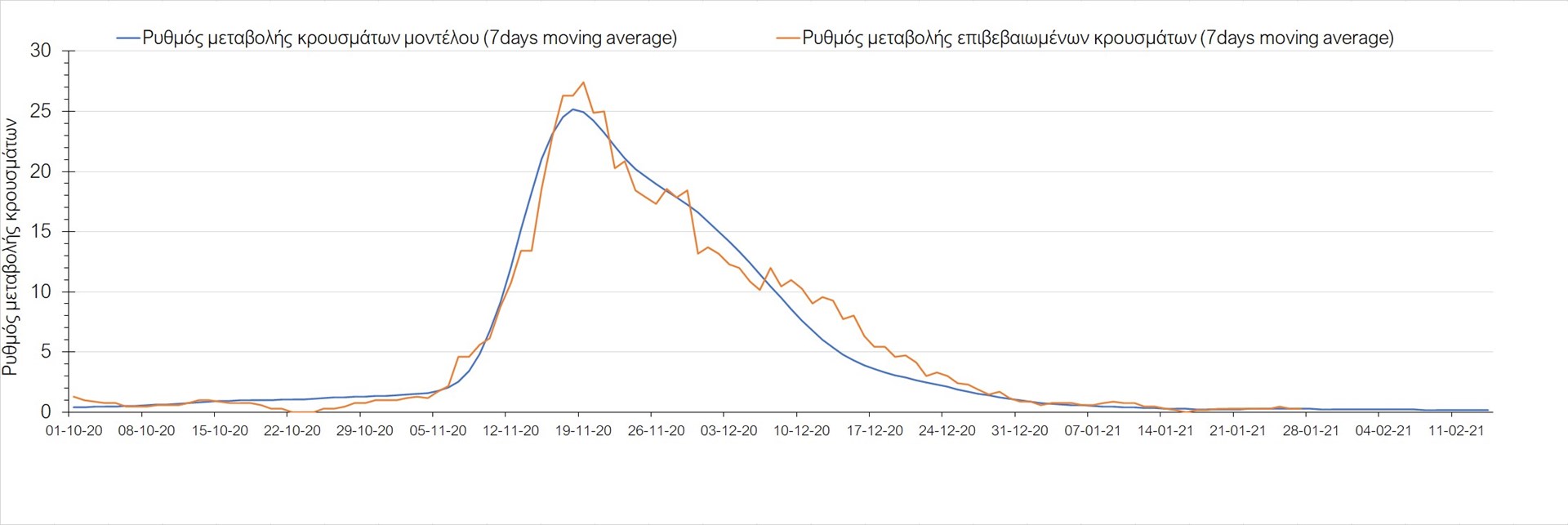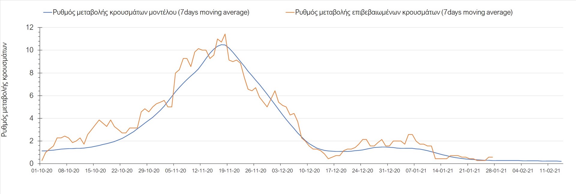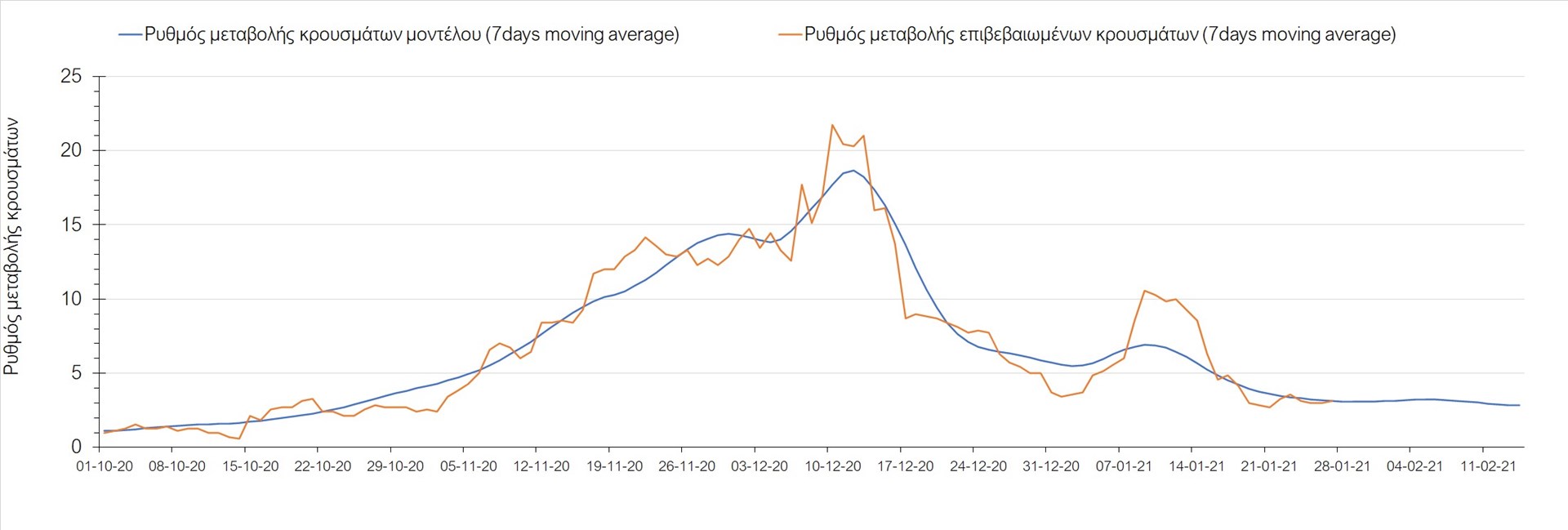 Όπως φαίνεται από το διάγραμμα, από τις 8 Ιανουαρίου έχουμε μια αύξηση κρουσμάτων μέχρι τις 11 Ιανουαρίου η οποία οφείλεται στη μείωση της περιστολής που σημειώθηκε στις γιορτές. Από τις 11 μέχρι τις 18 Ιανουαρίου προβλεπόταν μια μείωση κρουσμάτων λόγω της εφαρμογής του lockdown που είναι σε ισχύ και αυτήν την εβδομάδα και η οποία όντως παρατηρήθηκε. Εντούτοις, όπως είχαμε προβλέψει, από τις 23 Ιανουαρίου και έπειτα διαφαίνεται αύξηση στον κυλιόμενο μέσο όρο των κρουσμάτων, η οποία δυστυχώς είναι υψηλότερη από την αναμενόμενη.