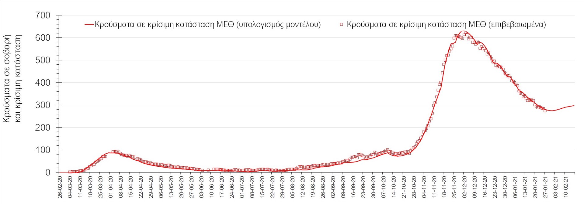 Όσον αφορά στους ασθενείς σε κρίσιμη κατάσταση (διασωληνωμένοι σε ΜΕΘ), την Τετάρτη ο αριθμός μειώθηκε ελαφρά σε σχέση με την Τρίτη (274 από 283), και παραμένει στα αναμενόμενα επίπεδα. Η καμπύλη εξέλιξης του αριθμού των ασθενών που χρειάζονται διασωλήνωση φαίνεται να ακολουθεί αργά την πορεία που διαφαίνονταν και από την υπολογιστική πλατφόρμα CORE, όπως αυτή παρουσιάζεται στο Σχήμα 1, ενώ μια εκτίμηση για την πορεία των θανάτων παρουσιάζεται στο Σχήμα 2.