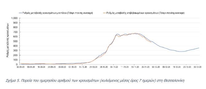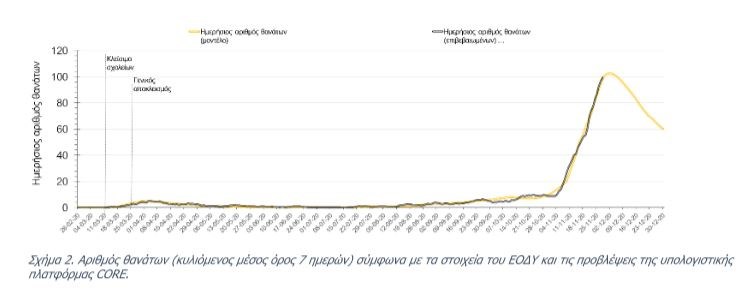 Την Τρίτη ο αριθμός των θανάτων (111) πάλι ανήλθε σε πολύ υψηλά επίπεδα, υποδηλώνοντας ότι μέχρι και πριν 2 εβδομάδες, ο ρυθμός μετάδοσης της νόσου ήταν υψηλός, λόγω της πλημμελούς εφαρμογής του lockdown τις πρώτες 10 ημέρες της εφαρμογής του και από τη συνέχιση της λειτουργίας των Δημοτικών σχολείων και την γενικότερα αυξημένη κοινωνική κινητικότητα των γονέων που συνάδει με τη συνοδεία των νεαρών παιδιών από και προς το σχολείο σε συνδυασμό με την χαμηλή εφαρμογή της τηλεργασίας, η οποία αυξάνει περαιτέρω την πιθανότητα μετάδοσης του SARS-CoV-2 από τους εργαζόμενους ενήλικες. Ο υψηλός αριθμός των θανάτων σε συνδυασμό με την παρατηρούμενη μείωση των επιβεβαιωμένων κρουσμάτων σε σχέση με την προηγούμενη εβδομάδα μπορεί να ερμηνευθεί από το γεγονός ότι έγινε πιο συνεπής εφαρμογή του lockdown μετά τις 17-18 Νοεμβρίου, περίπου 10 μέρες μετά την ανακοίνωση του.