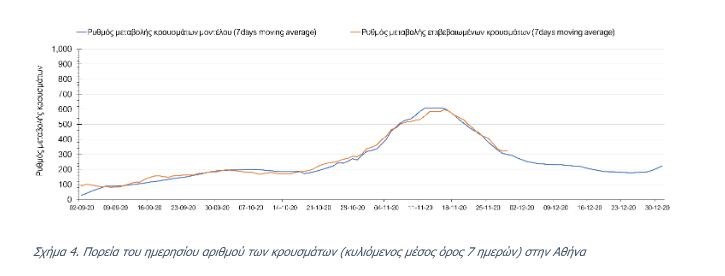 Η πορεία της μέσης εβδομαδιαίας τιμής των κρουσμάτων όπως έχουν καταγραφεί από τον ΕΟΔΥ και η αναμενόμενη πορεία αυτών στην περίπτωση ανοίγματος των εμπορικών καταστημάτων στις 14 Δεκεμβρίου όπως προδιαγράφεται από την υπολογιστική πλατφόρμα CORE για την Ελληνική επικράτεια, αποτυπώνονται στο Σχήμα 3.