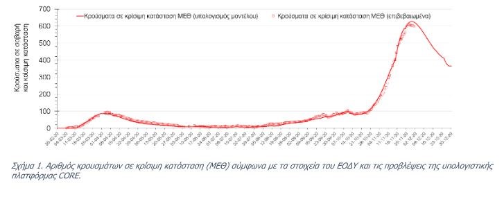 Επιπλέον, και σήμερα επιβεβαιώθηκε η πρόβλεψη της υπολογιστικής πλατφόρμας CORE, ότι με βάση τη συνολική επιδημιολογική εικόνα στη χώρα, έχει παρέλθει πριν η κορύφωση του ημερήσιου αριθμού ασθενών που βρίσκονται σε κρίσιμη κατάσταση (διασωληνωμένοι σε ΜΕΘ). Την Τρίτη ο συνολικός αριθμός μειώθηκε κατά 4 άτομα, όμως αυτό έχει συνδυαστεί με 26 θανάτους περισσότερους από χθες, οπότε με βάση τα όχι ενθαρρυντικά σημερινά δεδομένα, δεν θα πρέπει να αποκλείσουμε μια αύξηση των ασθενών που χρήζουν διασωλήνωση τις επόμενες ημέρες. Η πορεία του αριθμού των ασθενών σε κρίσιμη κατάσταση (διασωληνωμένοι σε ΜΕΘ) για τις επόμενες ημέρες πανελλαδικά παρουσιάζεται στο Σχήμα 1 , ενώ μια εκτίμηση για την πορεία των θανάτων παρουσιάζεται στο Σχήμα 2 . Η εκτίμηση αυτή θα επαναεπικαιροποιηθεί στις επόμενες ημέρες, ιδιαίτερα μετά τα όχι ενθαρρυντικά σημερινά αποτελέσματα.