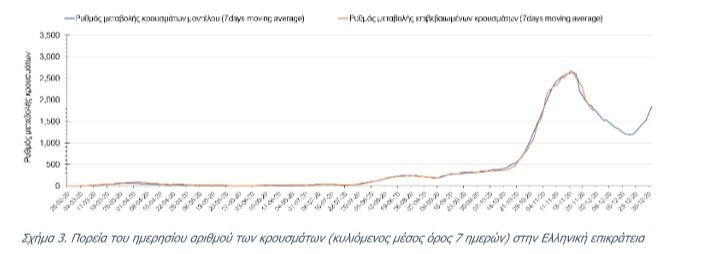 Η πορεία της μέσης εβδομαδιαίας τιμής των κρουσμάτων όπως έχουν καταγραφεί από τον ΕΟΔΥ και η αναμενόμενη πορεία αυτών στην περίπτωση ανοίγματος των εμπορικών καταστημάτων στις 14 Δεκεμβρίου όπως προδιαγράφεται από την υπολογιστική πλατφόρμα CORE για την Ελληνική επικράτεια, αποτυπώνονται στο Σχήμα 3.