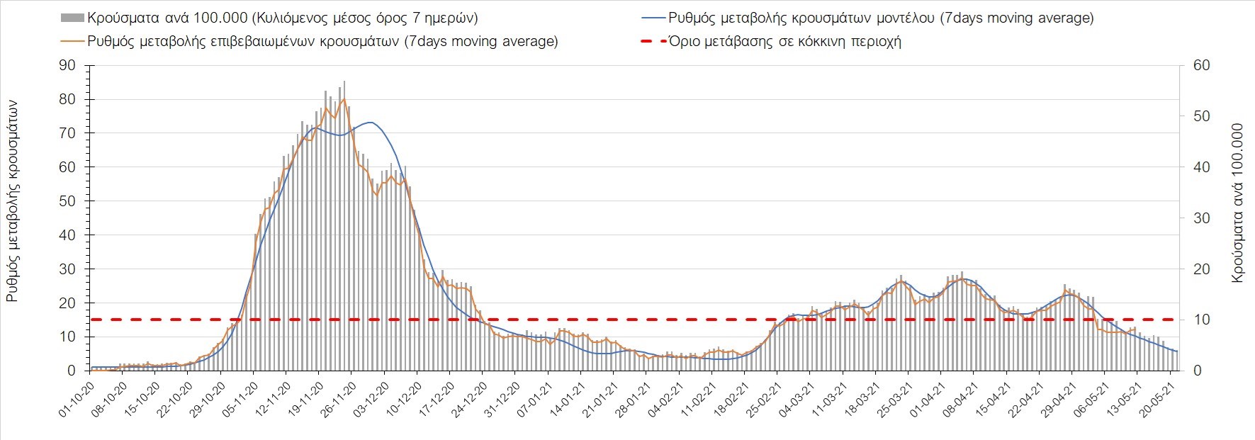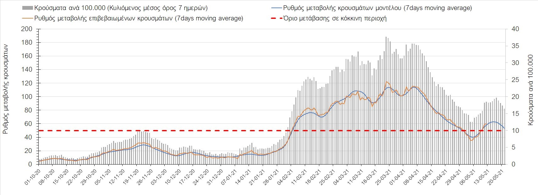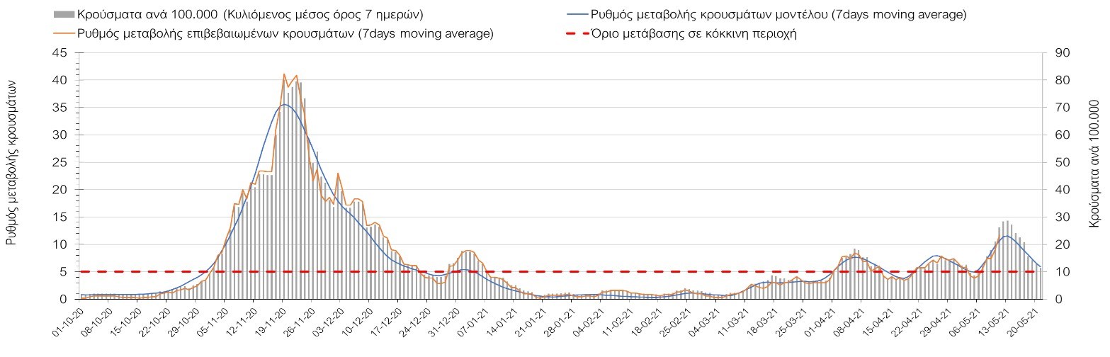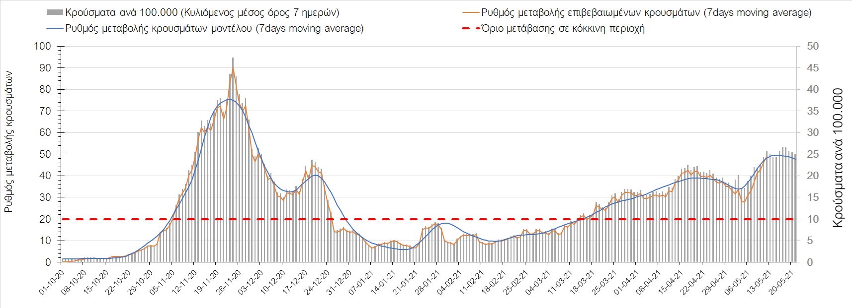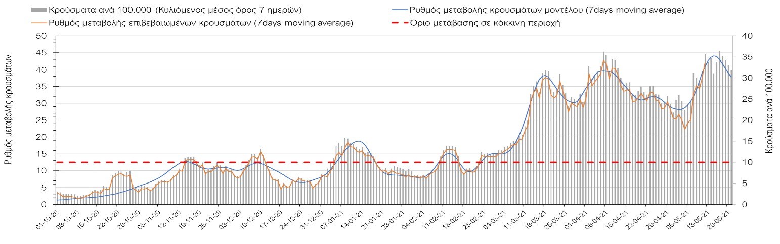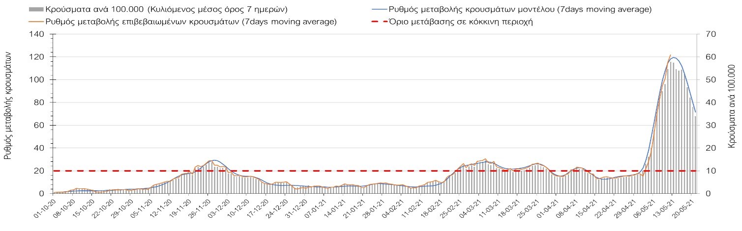 Σχήμα 44. Πορεία του ημερησίου αριθμού των κρουσμάτων (κυλιόμενος μέσος όρος 7 ημερών) στον ΈβροΣτο Ηράκλειο, όπου εντοπίστηκαν 59 κρούσματα την Τετάρτη, παρατηρείται αύξηση σε σχέση με την Τρίτη (Σχήμα 45). Λόγω των έντονων διακυμάνσεων που σημειώθηκαν στην πορεία της πανδημίας ως αποτέλεσμα του πολύ μεγάλου αριθμού φορέων του μεταλλαγμένου στελέχους Β.1.1.7, το Ηράκλειο είχε μεγάλη διασπορά του ιού και αυτή η δυναμική καθυστέρησε τον αποχαρακτηρισμό της περιοχής ως κόκκινη, όμως το επιπλέον ανοδικό κύμα που διαμορφώθηκε τις τελευταίες ημέρες και μάλλον οφείλεται σε αυξημένες συρροές λόγω του Πάσχα, θα αρχίσει να αποκλιμακώνεται στις επόμενες 3-4 ημέρες. Στα Χανιά με 25 κρούσματα την Τετάρτη (Σχήμα 46) έχουμε μείωση σε σχέση με την Τρίτη, και υπάρχουν έντονες διακυμάνσεις (με ένα επιπλέον ανοδικό κύμα που οφείλεται σε συρροές των ημερών του Πάσχα) που δυσχεραίνουν τη συστηματική αποκλιμάκωση. Τα Χανιά θα παραμείνουν ανάμεσα στις κόκκινες περιοχές και μετά τις 20 Μαΐου. Μείωση κρουσμάτων παρατηρείται στο Ρέθυμνο την Τετάρτη με 13 κρούσματα, στο οποίο η έντονα ανοδική τάση της προηγούμενης εβδομάδας, είχε περιέλθει σε πορεία ισχυρής αποκλιμάκωσης (Σχήμα 47), όμως η μικρή ανοδική που έχει διαμορφωθεί, έχει φέρει την περιοχή ξανά ελαφρά πάνω από το όριο του χαρακτηρισμού ως κόκκινη. Στο Λασίθι παρατηρείται μείωση σε σχέση με την Τρίτη, καθώς εντοπίστηκαν 4 κρούσματα, και παρατηρούνται έντονες διακυμάνσεις (Σχήμα 48), οι οποίες επανάφεραν την περιφερειακή ενότητα στο όριο της κόκκινης περιοχής.