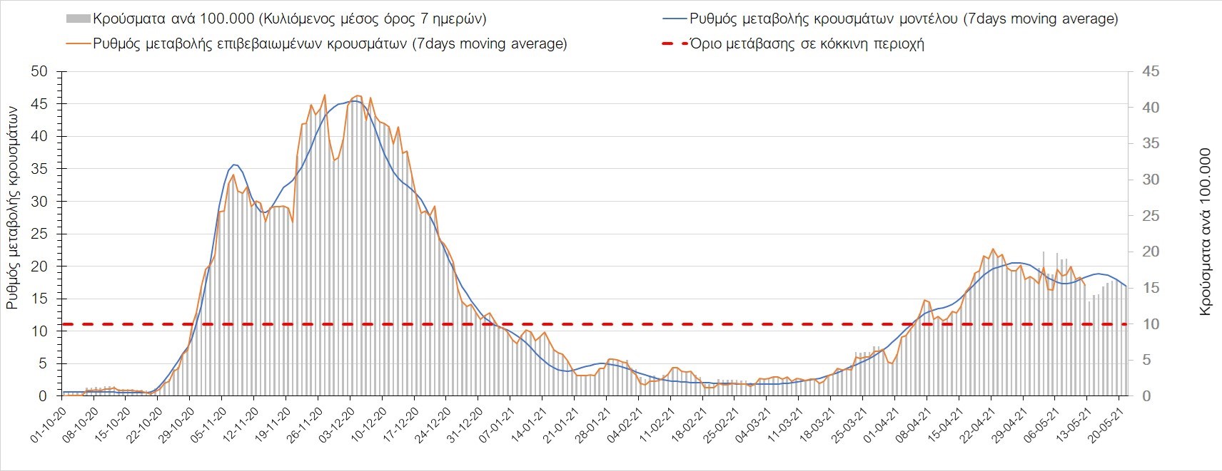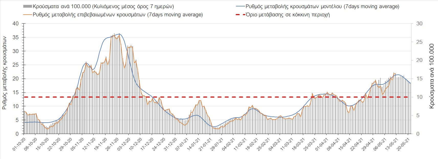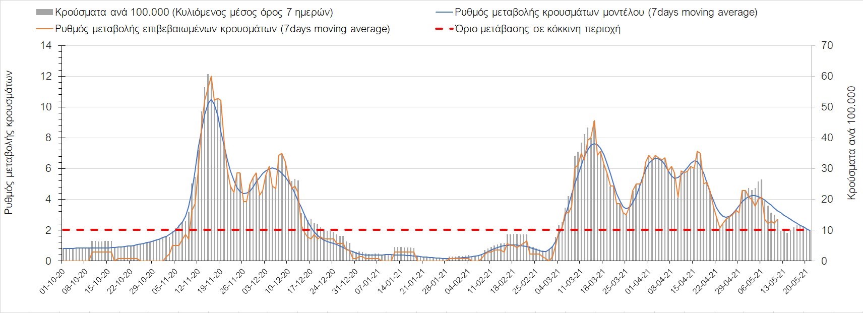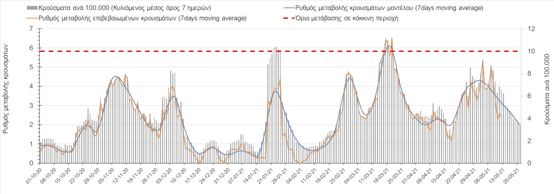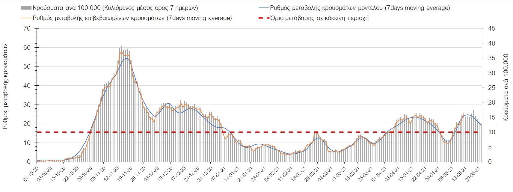 Σχήμα 44. Πορεία του ημερησίου αριθμού των κρουσμάτων (κυλιόμενος μέσος όρος 7 ημερών) στον ΈβροΣτο Ηράκλειο, όπου εντοπίστηκαν 59 κρούσματα την Τετάρτη, παρατηρείται αύξηση σε σχέση με την Τρίτη (Σχήμα 45). Λόγω των έντονων διακυμάνσεων που σημειώθηκαν στην πορεία της πανδημίας ως αποτέλεσμα του πολύ μεγάλου αριθμού φορέων του μεταλλαγμένου στελέχους Β.1.1.7, το Ηράκλειο είχε μεγάλη διασπορά του ιού και αυτή η δυναμική καθυστέρησε τον αποχαρακτηρισμό της περιοχής ως κόκκινη, όμως το επιπλέον ανοδικό κύμα που διαμορφώθηκε τις τελευταίες ημέρες και μάλλον οφείλεται σε αυξημένες συρροές λόγω του Πάσχα, θα αρχίσει να αποκλιμακώνεται στις επόμενες 3-4 ημέρες. Στα Χανιά με 25 κρούσματα την Τετάρτη (Σχήμα 46) έχουμε μείωση σε σχέση με την Τρίτη, και υπάρχουν έντονες διακυμάνσεις (με ένα επιπλέον ανοδικό κύμα που οφείλεται σε συρροές των ημερών του Πάσχα) που δυσχεραίνουν τη συστηματική αποκλιμάκωση. Τα Χανιά θα παραμείνουν ανάμεσα στις κόκκινες περιοχές και μετά τις 20 Μαΐου. Μείωση κρουσμάτων παρατηρείται στο Ρέθυμνο την Τετάρτη με 13 κρούσματα, στο οποίο η έντονα ανοδική τάση της προηγούμενης εβδομάδας, είχε περιέλθει σε πορεία ισχυρής αποκλιμάκωσης (Σχήμα 47), όμως η μικρή ανοδική που έχει διαμορφωθεί, έχει φέρει την περιοχή ξανά ελαφρά πάνω από το όριο του χαρακτηρισμού ως κόκκινη. Στο Λασίθι παρατηρείται μείωση σε σχέση με την Τρίτη, καθώς εντοπίστηκαν 4 κρούσματα, και παρατηρούνται έντονες διακυμάνσεις (Σχήμα 48), οι οποίες επανάφεραν την περιφερειακή ενότητα στο όριο της κόκκινης περιοχής.