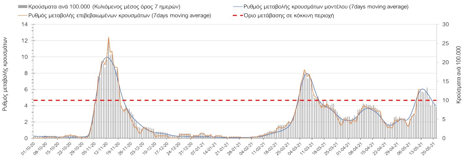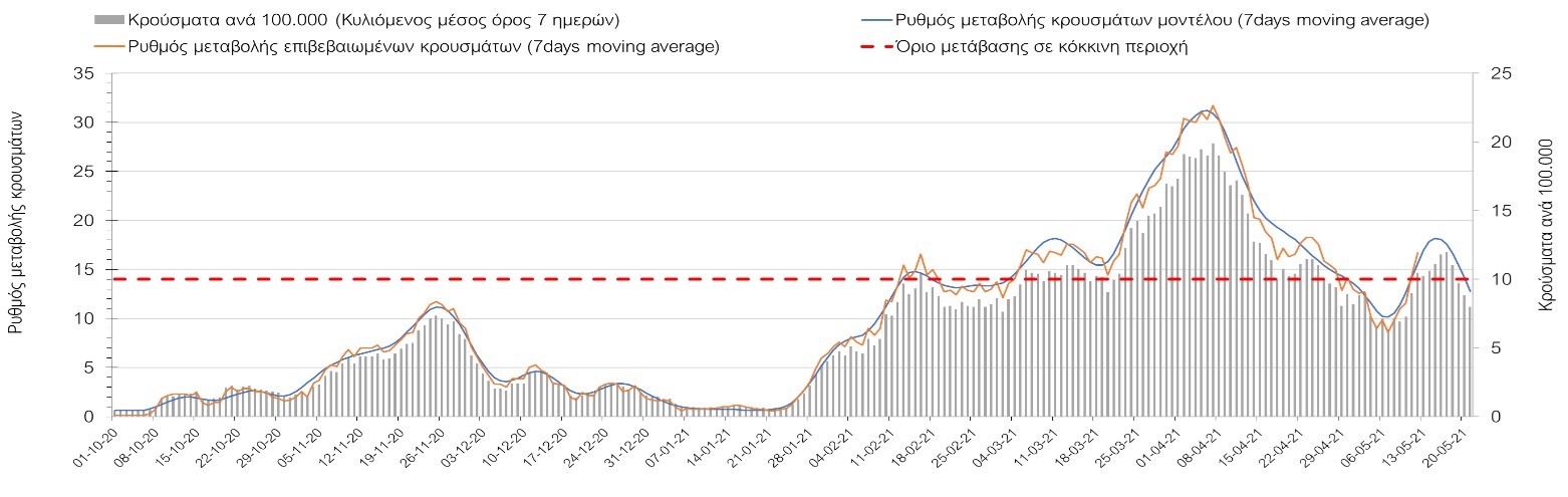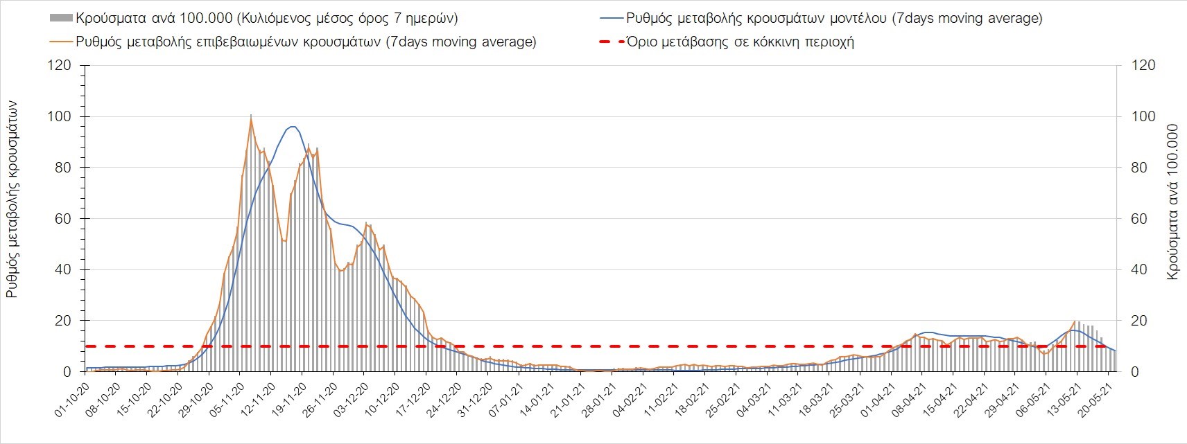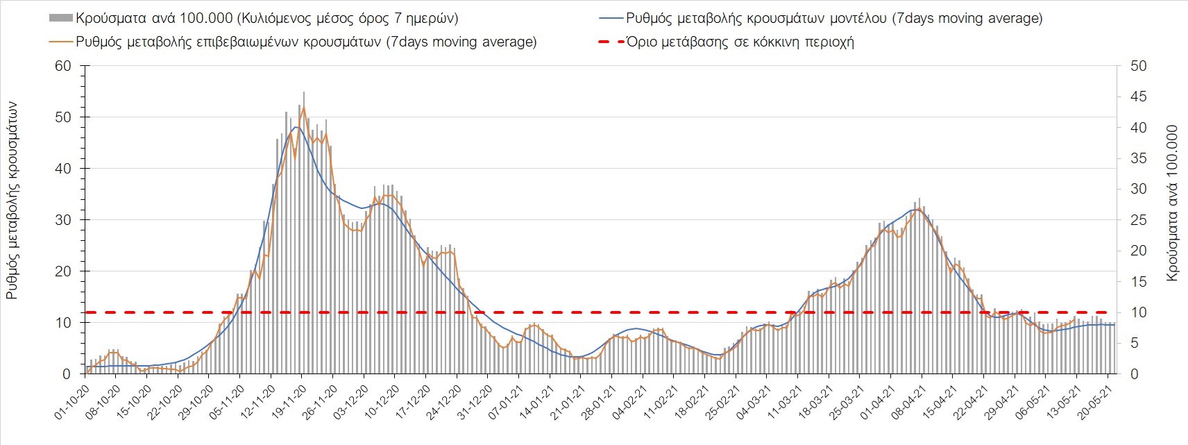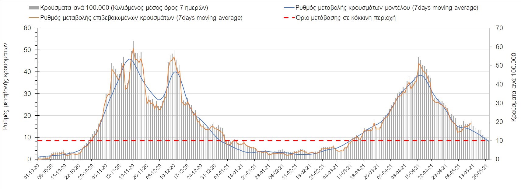 Σχήμα 44. Πορεία του ημερησίου αριθμού των κρουσμάτων (κυλιόμενος μέσος όρος 7 ημερών) στον ΈβροΣτο Ηράκλειο, όπου εντοπίστηκαν 59 κρούσματα την Τετάρτη, παρατηρείται αύξηση σε σχέση με την Τρίτη (Σχήμα 45). Λόγω των έντονων διακυμάνσεων που σημειώθηκαν στην πορεία της πανδημίας ως αποτέλεσμα του πολύ μεγάλου αριθμού φορέων του μεταλλαγμένου στελέχους Β.1.1.7, το Ηράκλειο είχε μεγάλη διασπορά του ιού και αυτή η δυναμική καθυστέρησε τον αποχαρακτηρισμό της περιοχής ως κόκκινη, όμως το επιπλέον ανοδικό κύμα που διαμορφώθηκε τις τελευταίες ημέρες και μάλλον οφείλεται σε αυξημένες συρροές λόγω του Πάσχα, θα αρχίσει να αποκλιμακώνεται στις επόμενες 3-4 ημέρες. Στα Χανιά με 25 κρούσματα την Τετάρτη (Σχήμα 46) έχουμε μείωση σε σχέση με την Τρίτη, και υπάρχουν έντονες διακυμάνσεις (με ένα επιπλέον ανοδικό κύμα που οφείλεται σε συρροές των ημερών του Πάσχα) που δυσχεραίνουν τη συστηματική αποκλιμάκωση. Τα Χανιά θα παραμείνουν ανάμεσα στις κόκκινες περιοχές και μετά τις 20 Μαΐου. Μείωση κρουσμάτων παρατηρείται στο Ρέθυμνο την Τετάρτη με 13 κρούσματα, στο οποίο η έντονα ανοδική τάση της προηγούμενης εβδομάδας, είχε περιέλθει σε πορεία ισχυρής αποκλιμάκωσης (Σχήμα 47), όμως η μικρή ανοδική που έχει διαμορφωθεί, έχει φέρει την περιοχή ξανά ελαφρά πάνω από το όριο του χαρακτηρισμού ως κόκκινη. Στο Λασίθι παρατηρείται μείωση σε σχέση με την Τρίτη, καθώς εντοπίστηκαν 4 κρούσματα, και παρατηρούνται έντονες διακυμάνσεις (Σχήμα 48), οι οποίες επανάφεραν την περιφερειακή ενότητα στο όριο της κόκκινης περιοχής.