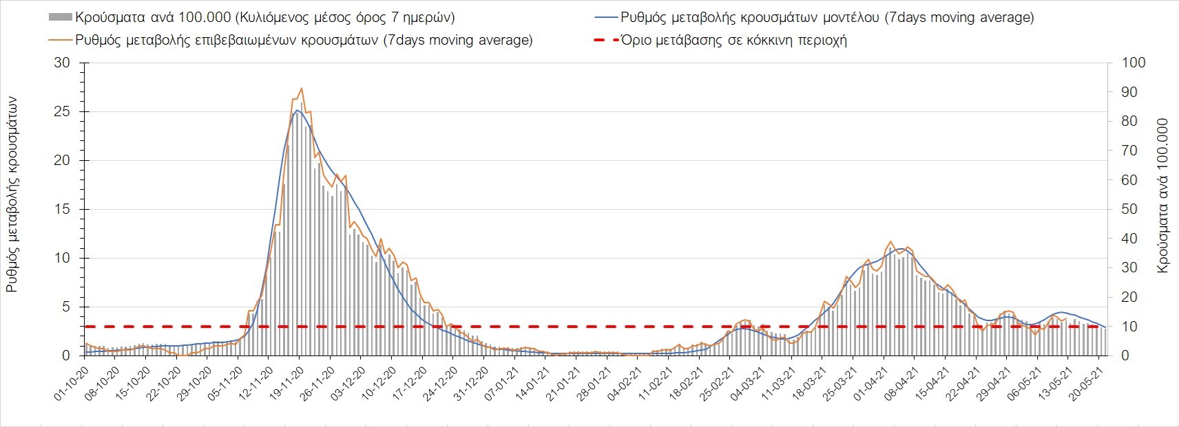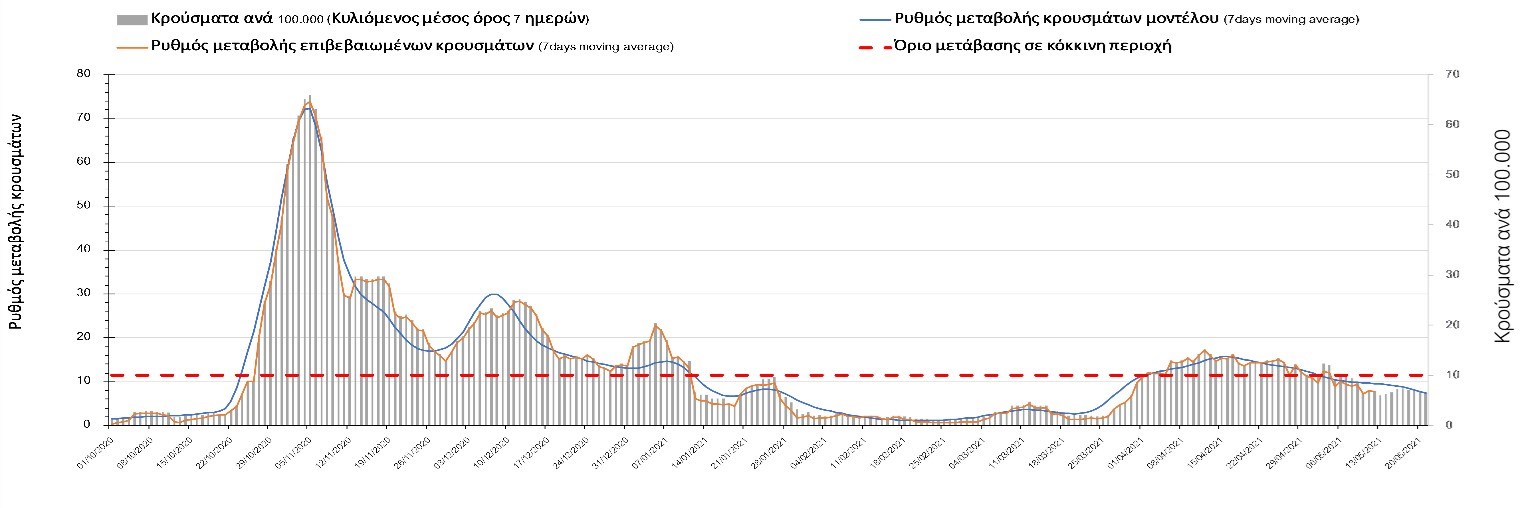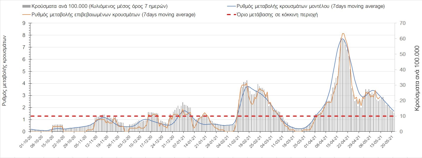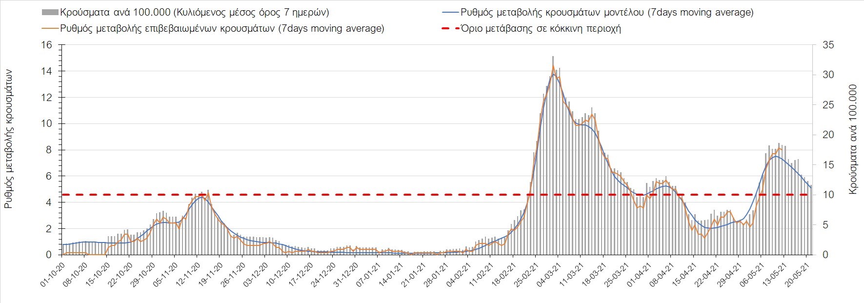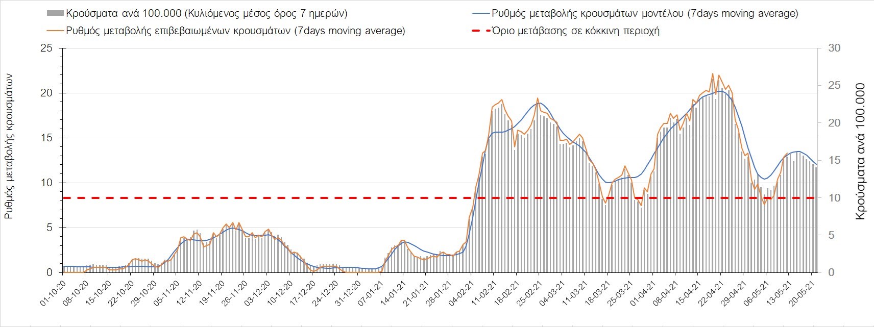 Σχήμα 44. Πορεία του ημερησίου αριθμού των κρουσμάτων (κυλιόμενος μέσος όρος 7 ημερών) στον ΈβροΣτο Ηράκλειο, όπου εντοπίστηκαν 59 κρούσματα την Τετάρτη, παρατηρείται αύξηση σε σχέση με την Τρίτη (Σχήμα 45). Λόγω των έντονων διακυμάνσεων που σημειώθηκαν στην πορεία της πανδημίας ως αποτέλεσμα του πολύ μεγάλου αριθμού φορέων του μεταλλαγμένου στελέχους Β.1.1.7, το Ηράκλειο είχε μεγάλη διασπορά του ιού και αυτή η δυναμική καθυστέρησε τον αποχαρακτηρισμό της περιοχής ως κόκκινη, όμως το επιπλέον ανοδικό κύμα που διαμορφώθηκε τις τελευταίες ημέρες και μάλλον οφείλεται σε αυξημένες συρροές λόγω του Πάσχα, θα αρχίσει να αποκλιμακώνεται στις επόμενες 3-4 ημέρες. Στα Χανιά με 25 κρούσματα την Τετάρτη (Σχήμα 46) έχουμε μείωση σε σχέση με την Τρίτη, και υπάρχουν έντονες διακυμάνσεις (με ένα επιπλέον ανοδικό κύμα που οφείλεται σε συρροές των ημερών του Πάσχα) που δυσχεραίνουν τη συστηματική αποκλιμάκωση. Τα Χανιά θα παραμείνουν ανάμεσα στις κόκκινες περιοχές και μετά τις 20 Μαΐου. Μείωση κρουσμάτων παρατηρείται στο Ρέθυμνο την Τετάρτη με 13 κρούσματα, στο οποίο η έντονα ανοδική τάση της προηγούμενης εβδομάδας, είχε περιέλθει σε πορεία ισχυρής αποκλιμάκωσης (Σχήμα 47), όμως η μικρή ανοδική που έχει διαμορφωθεί, έχει φέρει την περιοχή ξανά ελαφρά πάνω από το όριο του χαρακτηρισμού ως κόκκινη. Στο Λασίθι παρατηρείται μείωση σε σχέση με την Τρίτη, καθώς εντοπίστηκαν 4 κρούσματα, και παρατηρούνται έντονες διακυμάνσεις (Σχήμα 48), οι οποίες επανάφεραν την περιφερειακή ενότητα στο όριο της κόκκινης περιοχής.