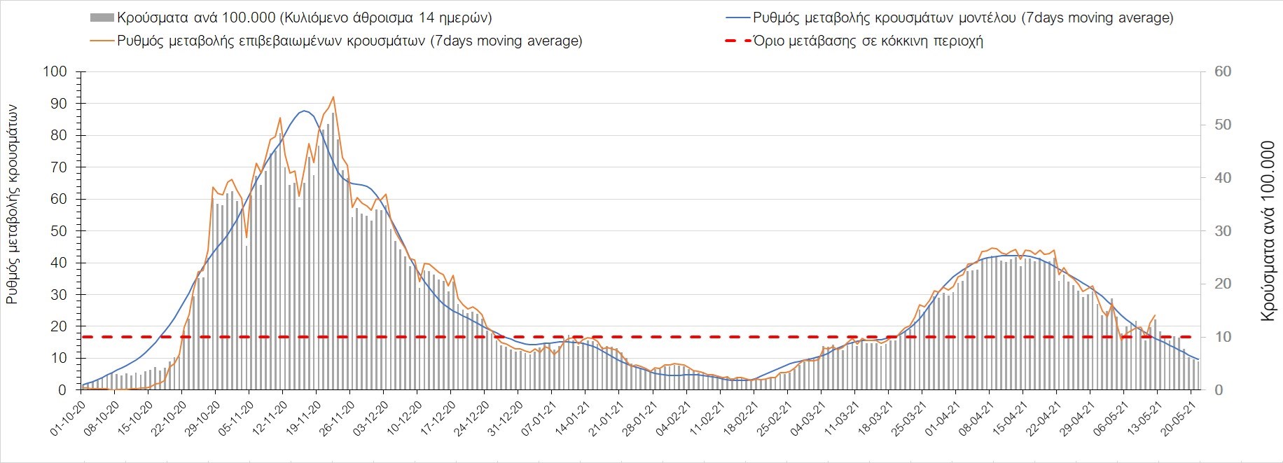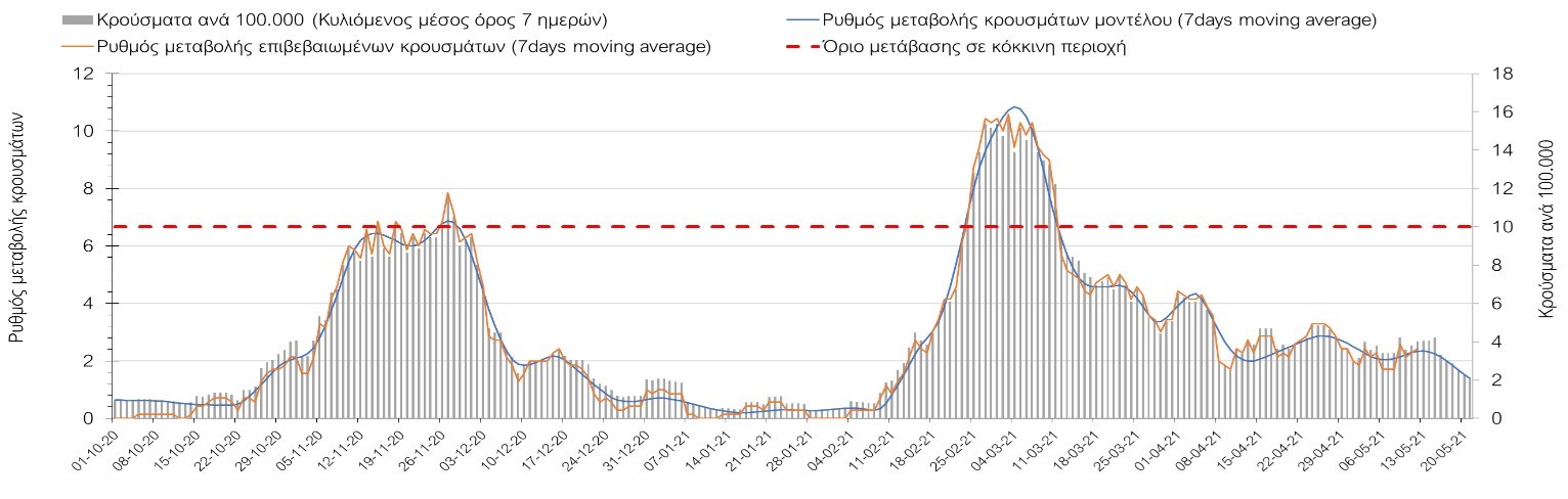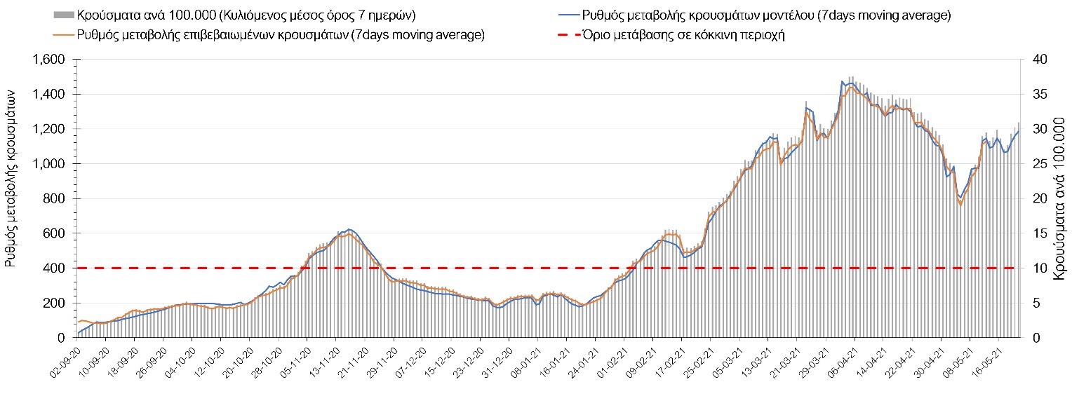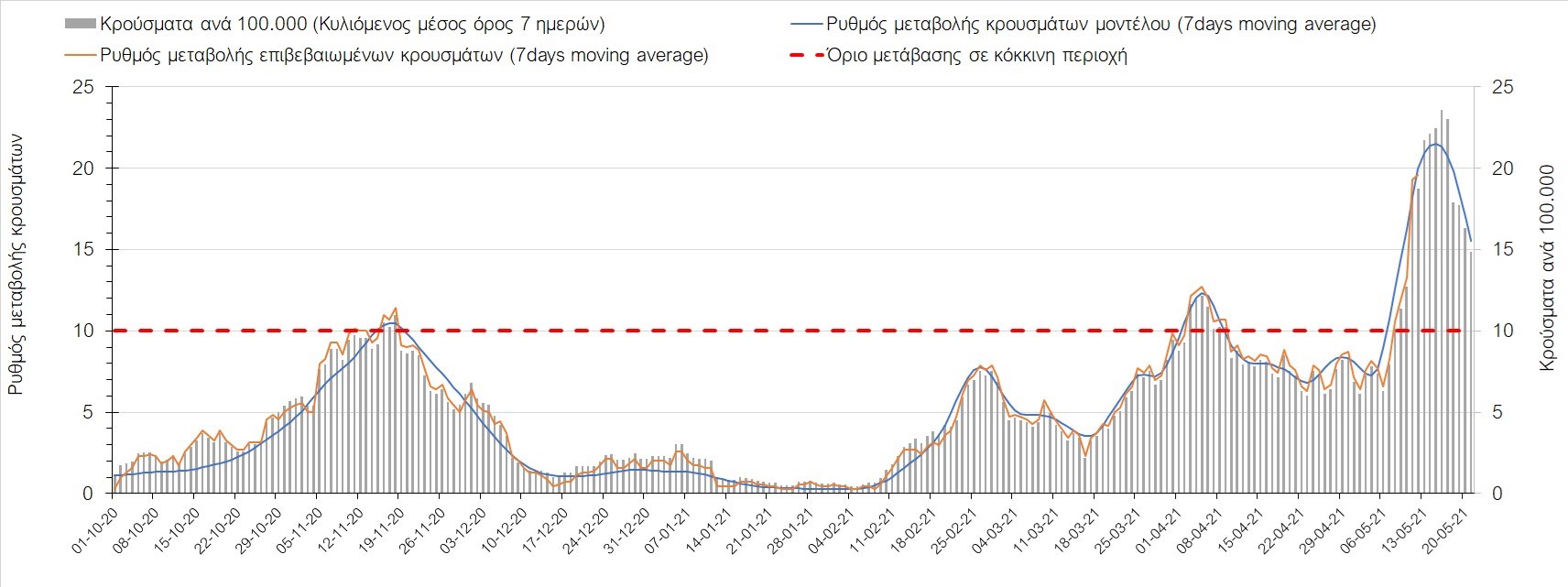 Σχήμα 52. Πορεία του ημερησίου αριθμού των κρουσμάτων (κυλιόμενος μέσος όρος 7 ημερών) στην ΘάσοΣυμπεράσματα:Με βάση τα αποτελέσματα της Τετάρτης, είχαμε σημαντική μείωση των ασθενών σε κρίσιμη κατάσταση (διασωληνωμένοι σε ΜΕΘ) σε σχέση με την Τρίτη, και διαφαίνεται ελαφρά κάμψη συνολικά, η οποία εκφράζεται και στον αριθμό των θανάτων. Οι προβλέψεις αυτές συνάδουν με τις προσομοιώσεις του μοντέλου CORE, όπως και ο αριθμός των κρουσμάτων, μετά και τις επικαιροποιημένες προβλέψεις προ 2 μηνών, όπου ελήφθη υπόψιν η μεγαλύτερη διασπορά των μεταλλαγμένων και ταχύτερα μεταδιδόμενων στελεχών. Σε πανελλαδικό επίπεδο ο κυλιόμενος εβδομαδιαίος μέσος όρος του δείκτη θετικότητας διαμορφώθηκε στο 4,8% (η ημερήσια τιμή την Τετάρτη είναι 3,9%) ενώ ο κυλιόμενος εβδομαδιαίος μέσος όρος του πραγματικού αριθμού αναπαραγωγής Rt (δηλαδή ο αριθμός των ατόμων που ένας φορέας μπορεί να επιμολύνει) διαμορφώθηκε στο 1,20 (τιμές του Rt κάτω από τη μονάδα υποδηλώνουν καθαρή μείωση της διασποράς του ιού στην κοινότητα). Η ταυτόχρονη μείωση και των δύο δεικτών, που παρατηρήθηκε τις προηγούμενες ημέρες δεν συνεχίζεται πλέον για δεύτερη εβδομάδα, υποδηλώνοντας την ανάσχεση της πτωτικής πορείας στο συνολικό αριθμό κρουσμάτων στη χώρα. Με βάση τα σημερινά αποτελέσματα, βλέπουμε ανοδικές τάσεις πλέον και σε επαρχιακές πόλεις της Βορείου Ελλάδας, οι οποίες χρονικά συνάδουν με αύξηση επαφών τις ημέρες του Πάσχα. Με βάση τις τάσεις που διαμορφώνονται, είναι σημαντικό να διατηρηθεί ο υψηλός αριθμός των τεστ ανίχνευσης, έτσι ώστε να μπορούμε να έχουμε καλή εικόνα της διασποράς της πανδημίας στις επόμενες ημέρες, όπου συνδυάζονται με τα πιο πρόσφατα ανοίγματα (εστίαση, άνοιγμα Δημοτικών και Γυμνασίων). Όπως ήδη αναφέρθηκε, αναμένεται στις επόμενες ημέρες μια προσωρινή ανάσχεση της πτωτικής πορείας, η οποία θα οδηγήσει και σε μικρής διάρκειας αύξηση του αριθμού των κρουσμάτων (με το προσωρινό μέγιστο να αναμένεται περί τα 2600 κρούσματα/ημέρα (κυλιόμενος εβδομαδιαίος μέσος όρος) στο τέλος Μαΐου, εάν τα ανοίγματα που αναφέραμε (και κυρίως η εστίαση) δεν γίνουν με τους προβλεπόμενους όρους ασφαλείας. Η ήπια αναχαίτιση του 3ου κύματος που παρατηρούνταν μέχρι και τις ημέρες του Πάσχα, οφείλονταν σε ένα συνδυασμό παραμέτρων, οι οποίες είναι η συνέχιση του lockdown, η χρήση των self-test, η αύξηση του αριθμού των τεστ από τον ΕΟΔΥ, γεγονός που συντελεί στην απομάκρυνση από τις αλυσίδες μετάδοσης των ασυμπτωματικών και προσυμπτωματικών φορέων, η προοδευτική βελτίωση του καιρού και σε μικρότερο βαθμό η πρόοδος των εμβολιασμών, η σημασία των οποίων στον έλεγχο της πανδημίας θα αρχίσει να είναι πιο εμφανής από το τέλος του επόμενου μήνα, ιδιαίτερα λαμβάνοντας υπόψιν τη σημαντική αύξηση του ρυθμού εμβολιασμού, με περίπου 110.000 εμβολιασμούς ημερησίως. Όμως, με δεδομένο το άνοιγμα του λιανικού εμπορίου και όλων των εκπαιδευτικών βαθμίδων πλέον, είναι ακόμα πιο σημαντική η τήρηση των μέτρων, ενώ ύψιστης σημασίας στις επόμενες εβδομάδες θα αποδειχθεί η ορθή και μαζική εφαρμογή των self-test, με ταυτόχρονη αύξηση της ιχνηλασίας των επαφών των ανιχνευθέντων ως θετικοί και καραντίνα 14 ημερών για τους συμπολίτες μας που θα επιβεβαιωθεί ότι είναι θετικοί στην μόλυνση με SARS-CoV-2 ακόμη και αν είναι ασυμπτωματικοί. Δεδομένου ότι τελικά ο αριθμός των self-test που πραγματοποιούνται ημερησίως δεν έχει φθάσει στα επι