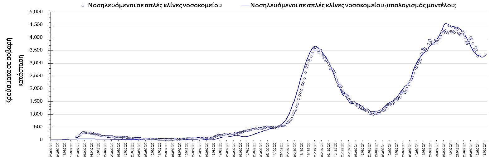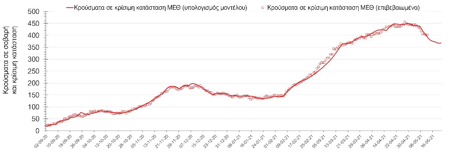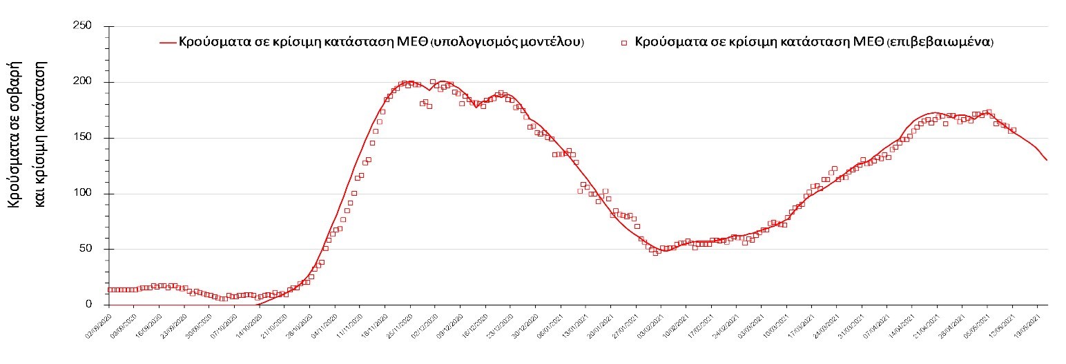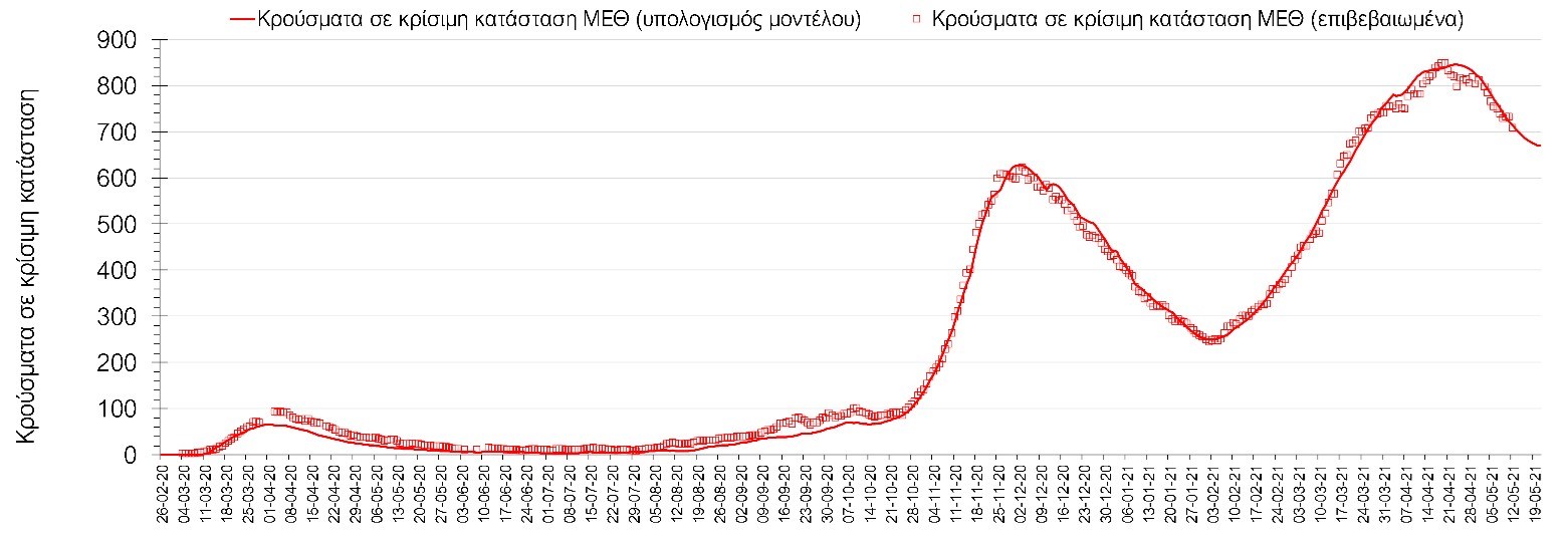 Όσον αφορά στους ασθενείς σε κρίσιμη κατάσταση (διασωληνωμένοι σε ΜΕΘ), ο αριθμός τους μειώθηκε σημαντικά σε σχέση με την Τρίτη (707 από 732). Παρά τις παρατηρούμενες διακυμάνσεις, διαφαίνεται να έχει ξεκινήσει η αποκλιμάκωση με βάση την επικαιροποιημένη πρόβλεψη (αυτό βέβαια με την παραδοχή ότι θα συνεχίσουν να τηρούνται τα ισχύοντα μέτρα, συμπεριλαμβανομένων των προβλεπόμενων self-test και ανοίγματα δραστηριοτήτων υψηλού συγχρωτισμού, όπως τα mall και η εστίαση θα γίνουν με την κατάλληλη προετοιμασία), η οποία όμως είναι αργή και έχει διακυμάνσεις. Αξίζει να σημειωθεί ότι ο αριθμός των ασθενών σε κρίσιμη κατάσταση όπως και των θανάτων είναι αναλογικά χαμηλότερος σε σχέση με τα αντίστοιχα μεγέθη στο δεύτερο κύμα, τόσο λόγω των εμβολιασμών ευπαθών ομάδων, όσο και του υψηλότερου αριθμού τεστ ανίχνευσης, που συντελεί στον εντοπισμό περισσότερων ασυμπτωματικών ή ήπια συμπτωματικών κρουσμάτων. Επίσης, η διασπορά των μεταλλαγμένων στελεχών που έχουν μεγαλύτερη μεταδοτικότητα από το στέλεχος του SARS-CoV-2 που κυριαρχούσε μέχρι το τέλος Φεβρουαρίου και η αυξημένη κινητικότητα του πληθυσμού έχουν μεγαλώσει το ποσοστό των νεότερων ηλικιών που μολύνονται με αποτέλεσμα η μέση ηλικία των μολύνσεων να έχει πέσει σημαντικά. Η καμπύλη εξέλιξης του αριθμού των ασθενών που νοσηλεύονται σε κλίνες ΜΕΘ με βάση τις προσομοιώσεις της πλατφόρμας CORE, όπως αυτή παρουσιάζεται στο Σχήμα 1, των ασθενών που νοσηλεύονται σε απλές κλίνες στο Σχήμα 2, ενώ μια εκτίμηση για την πορεία των θανάτων ανά ημέρα παρουσιάζεται στο Σχήμα 3.