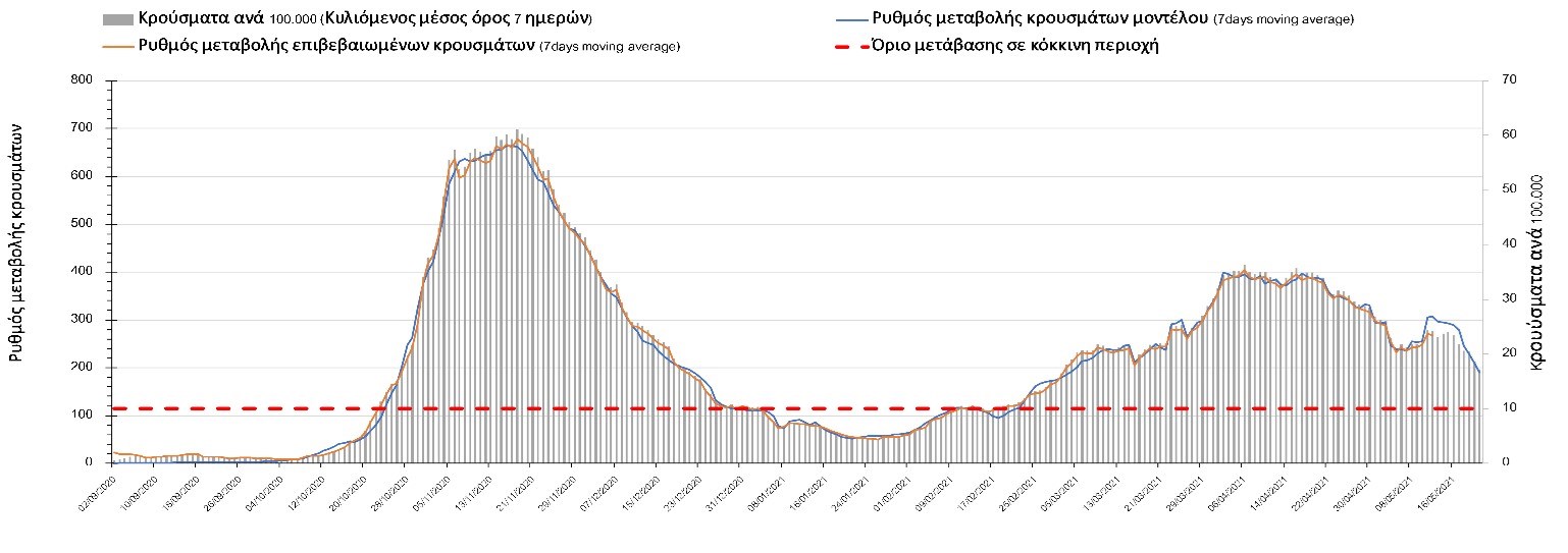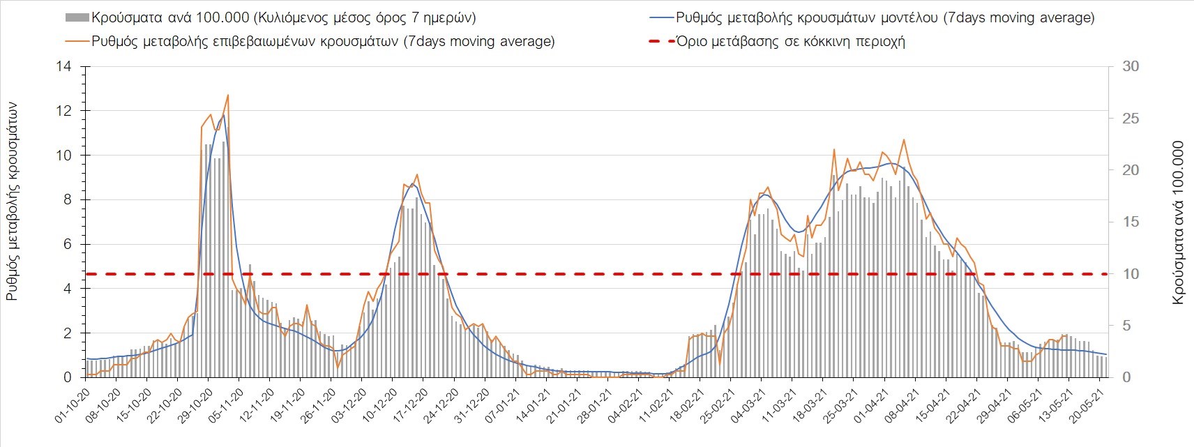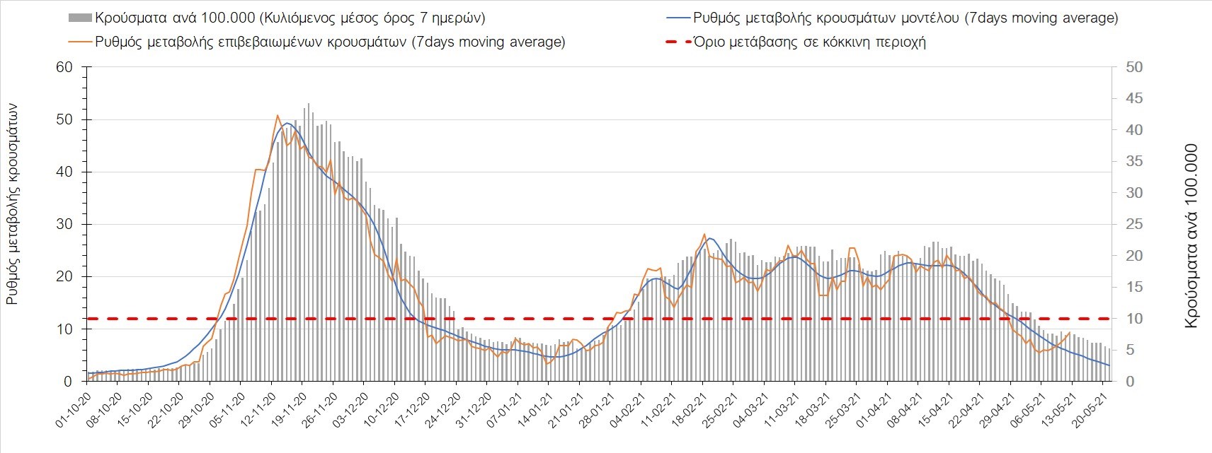 Με δεδομένη την αβεβαιότητα που αφορά κυρίως τις δύο πρώτες παραδοχές, οι προβλέψεις μας θα επαναεπικαιροποιούνται εάν παρατηρήσουμε αποκλίσεις που δε θα επιβεβαιώνουν την αναμενόμενη πορεία.Όπως φαίνεται από το διάγραμμα, από τις 8 Απριλίου, έχει ξεκινήσει αποκλιμάκωση του αριθμού των κρουσμάτων, η οποία επιταχύνθηκε μετά τις 19 Απριλίου, ως αποτέλεσμα του συνδυασμού των self-test, του αυξημένου αριθμού των τεστ ανίχνευσης που πραγματοποιούνται από τον ΕΟΔΥ, την αύξηση της θερμοκρασίας και φυσικά της συνέχισης του lockdown. Όπως ήδη αναφέραμε, λόγω του ανοίγματος δραστηριοτήτων, παρατηρείται ήδη η προσωρινή ανάσχεση της πτωτικής πορείας, όπως είχε προβλεφθεί από το μοντέλο CORE. Πάντως, αξίζει για άλλη μια φορά να αναφερθεί, ότι για να μπορέσουμε να προχωρήσουμε σε σταδιακή άρση των περιοριστικών μέτρων για οικονομικές, εκπαιδευτικές και πολιτιστικές/αθλητικές δραστηριότητες, θα πρέπει να δημιουργήσουμε την κατάλληλη υποδομή ώστε να μπορέσουμε να αναχαιτίσουμε την υπερμετάδοση των μεταλλαγμένων στελεχών εκεί όπου συμβαίνει κατά το μάλλον, δηλαδή στους τόπους εργασίας και τα μέσα μαζικής μεταφοράς, ενώ πλέον με τα υπάρχοντα και διαφαινόμενα ανοίγματα ιδιαίτερη προσοχή χρειάζεται να δοθεί και στους χώρους εστίασης αλλά και στα σχολεία. Στα συμπεράσματα προτείνονται σχετικές λύσεις.