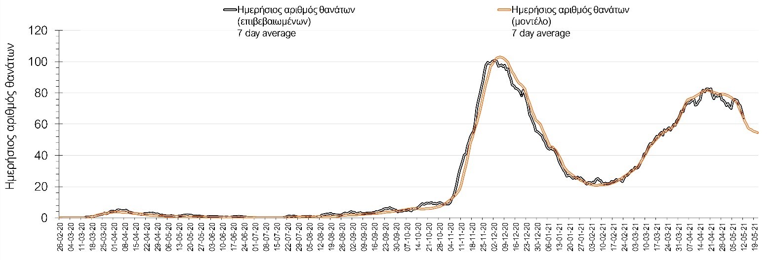 Σχήμα 3. Αριθμός θανάτων (κυλιόμενος μέσος όρος 7 ημερών) σύμφωνα με τα στοιχεία του ΕΟΔΥ και τις προβλέψεις της υπολογιστικής πλατφόρμας CORE.Η πορεία της μέσης εβδομαδιαίας τιμής των κρουσμάτων, καθώς και του κυλιόμενου μέσου όρου 7 ημερών του αριθμού των κρουσμάτων ανά 100.000 πληθυσμού, όπως έχουν καταγραφεί από τον ΕΟΔΥ και η αναμενόμενη πορεία τους όπως προδιαγράφεται από την υπολογιστική πλατφόρμα CORE για την Ελληνική επικράτεια μέχρι τις 15 Μαΐου, αποτυπώνονται στο Σχήμα 4. Με βάση το συνδυασμένο άνοιγμα της εστίασης στις 2 Μαΐου, και των προβλεπόμενων βαθμίδων εκπαίδευσης (Δημοτικά και Γυμνάσια) στις 10 Μαΐου, αναμένουμε την επιβράδυνση της πορεία αποκλιμάκωσης, με σημαντική πιθανότητα να υπάρξει και ένα μικρό ανοδικό κύμα το τελευταίο δεκαήμερο του Μαΐου. Με βάση την επικαιροποιημένη πρόβλεψη που πραγματοποιήσαμε, σύμφωνα με τον αριθμό των κρουσμάτων που παρατηρείται αυτές τις ημέρες, το ύψος του ανοδικού κύματος υπολογίζεται να επαναφέρει τον ημερήσιο αριθμό των κρουσμάτων ίσως και λίγο πάνω από τα 2500 πριν την αποκλιμάκωση του. Αυτό θα εξαρτηθεί από το βαθμό συμμόρφωσης στα μέτρα περιορισμού της πανδημίας. Πρέπει επίσης να σημειωθεί, ότι με βάση την επικαιροποιημένη ανάλυση των δεδομένων διασποράς της πανδημίας στη χώρα, παρατηρήθηκε αύξηση των ενεργών επαφών τις τελευταίες ημέρες του Απριλίου. Αυτές μπορούν να οφείλονται στο άνοιγμα των μεγάλων εμπορικών κέντρων (να σημειωθεί ότι έγινε χωρίς την εγκατάσταση συσκευών απολύμανσης του αέρα αν και πρόκειται για εσωτερικούς χώρους με ανάγκη τεχνητού εξαερισμού) και στην κίνηση της αγοράς λόγω του Πάσχα, αλλά και στις αυξημένες κοινωνικές επαφές κατά τη διάρκεια των εορτών του Πάσχα. Αυτή η προβλεπόμενη πορεία, που αφορά τα κρούσματα, τους νοσηλευόμενους σε απλές κλίνες, όσο και σε ΜΕΘ, καθώς επίσης και τους θανάτους, βασίζεται στις ακόλουθες παραδοχές: