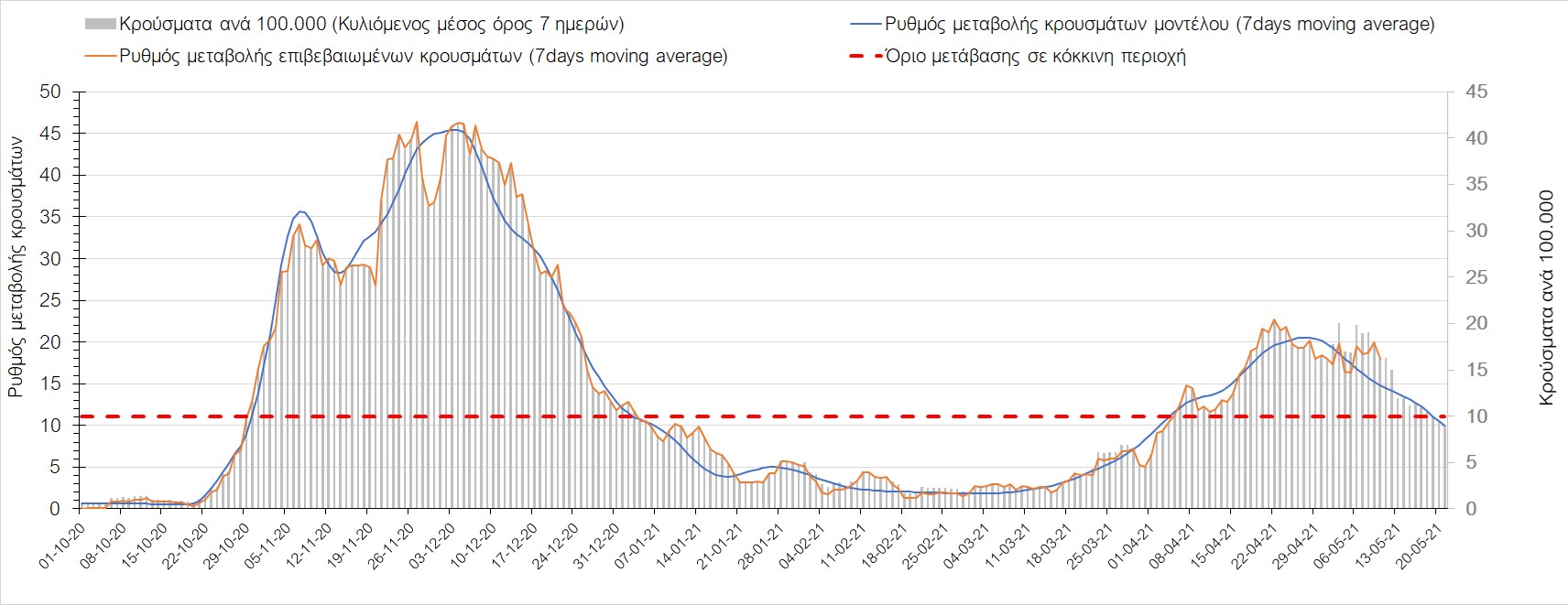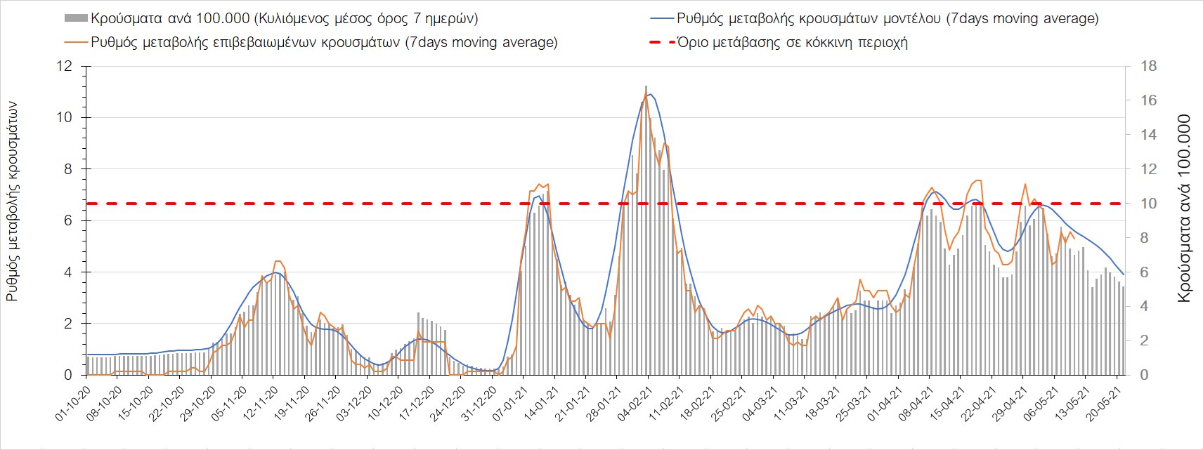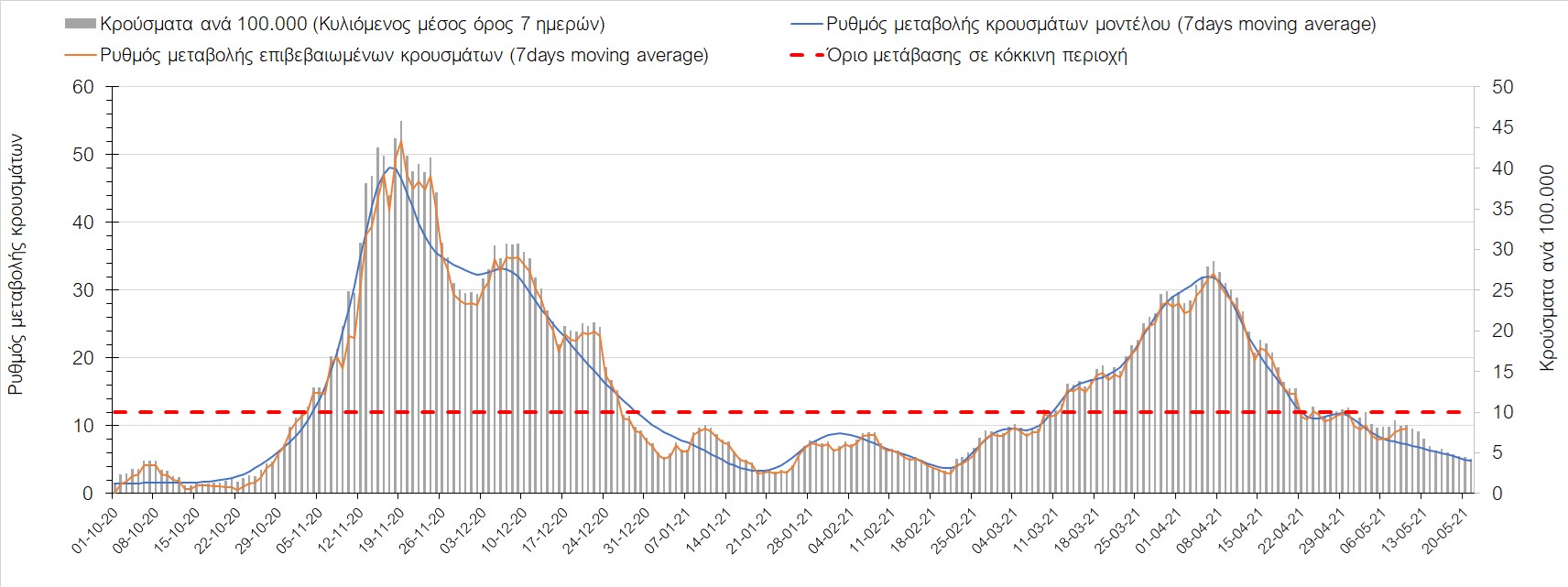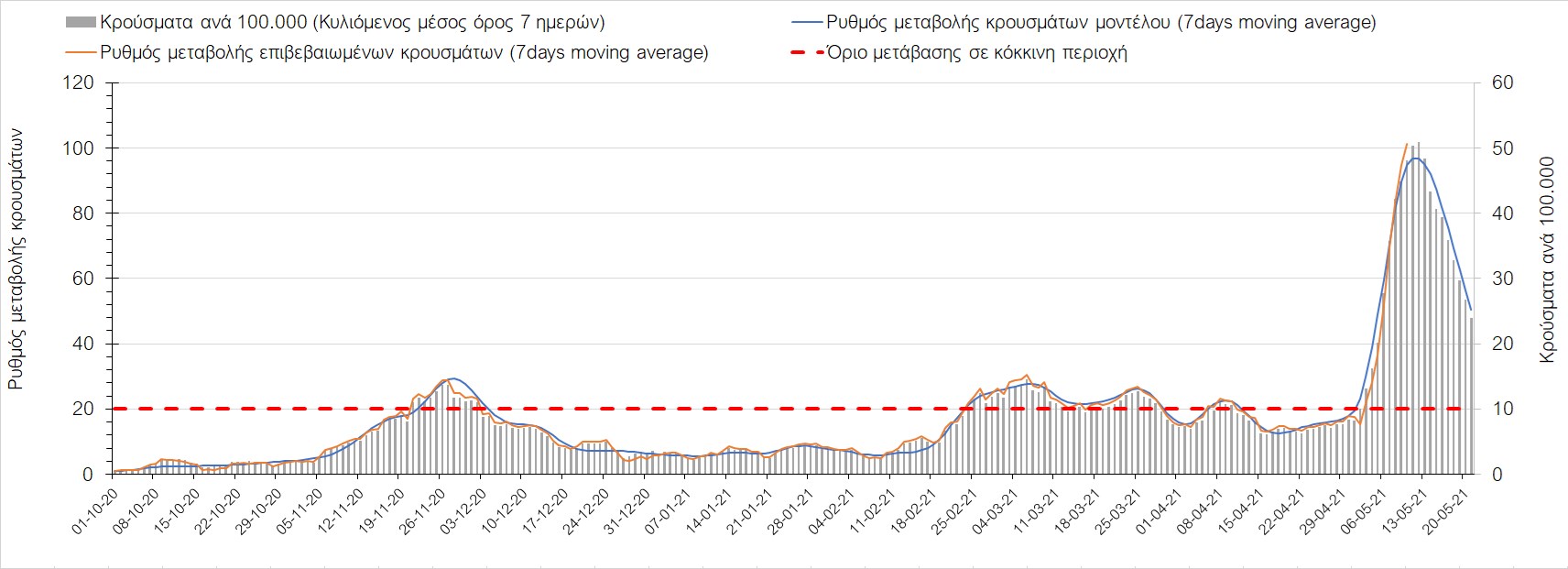 Σχήμα 44. Πορεία του ημερησίου αριθμού των κρουσμάτων (κυλιόμενος μέσος όρος 7 ημερών) στον ΈβροΣτο Ηράκλειο, όπου εντοπίστηκαν 52 κρούσματα παρατηρείται αύξηση σε σχέση με προχθές (Σχήμα 45). Λόγω των έντονων διακυμάνσεων που σημειώθηκαν στην πορεία της πανδημίας ως αποτέλεσμα του πολύ μεγάλου αριθμού φορέων του μεταλλαγμένου στελέχους Β.1.1.7, το Ηράκλειο είχε μεγάλη διασπορά του ιού και αυτή η δυναμική καθυστέρησε τον αποχαρακτηρισμό της περιοχής ως κόκκινη, όμως το επιπλέον ανοδικό κύμα που διαμορφώθηκε τις τελευταίες ημέρες και μάλλον οφείλεται σε αυξημένες συρροές λόγω του Πάσχα, θα αρχίσει να αποκλιμακώνεται στις επόμενες 4-5 ημέρες. Στα Χανιά με 26 κρούσματα (Σχήμα 46) έχουμε αύξηση σε σχέση με προχθές, και υπάρχουν έντονες διακυμάνσεις (με ένα επιπλέον ανοδικό κύμα που οφείλεται σε συρροές των ημερών του Πάσχα) που δυσχεραίνουν τη συστηματική αποκλιμάκωση. Τα Χανιά θα παραμείνουν ανάμεσα στις κόκκινες περιοχές και μετά τις 20 Μαΐου. Αύξηση κρουσμάτων παρατηρείται στο Ρέθυμνο με 15 κρούσματα, στο οποίο η έντονα ανοδική τάση της προηγούμενης εβδομάδας, είχε περιέλθει σε πορεία ισχυρής αποκλιμάκωσης (Σχήμα 47), όπως η μικρή ανοδική που έχει διαμορφωθεί, έχει φέρει την περιοχή ξανά ελαφρά πάνω από το όριο του χαρακτηρισμού ως κόκκινη. Στο Λασίθι παρατηρείται μείωση σε σχέση με προχθές, καθώς εντοπίστηκαν 2 κρούσματα και παρατηρούνται έντονες διακυμάνσεις (Σχήμα 48), οι οποίες όμως διατηρούνται κάτω από το όριο της κόκκινης περιοχής.