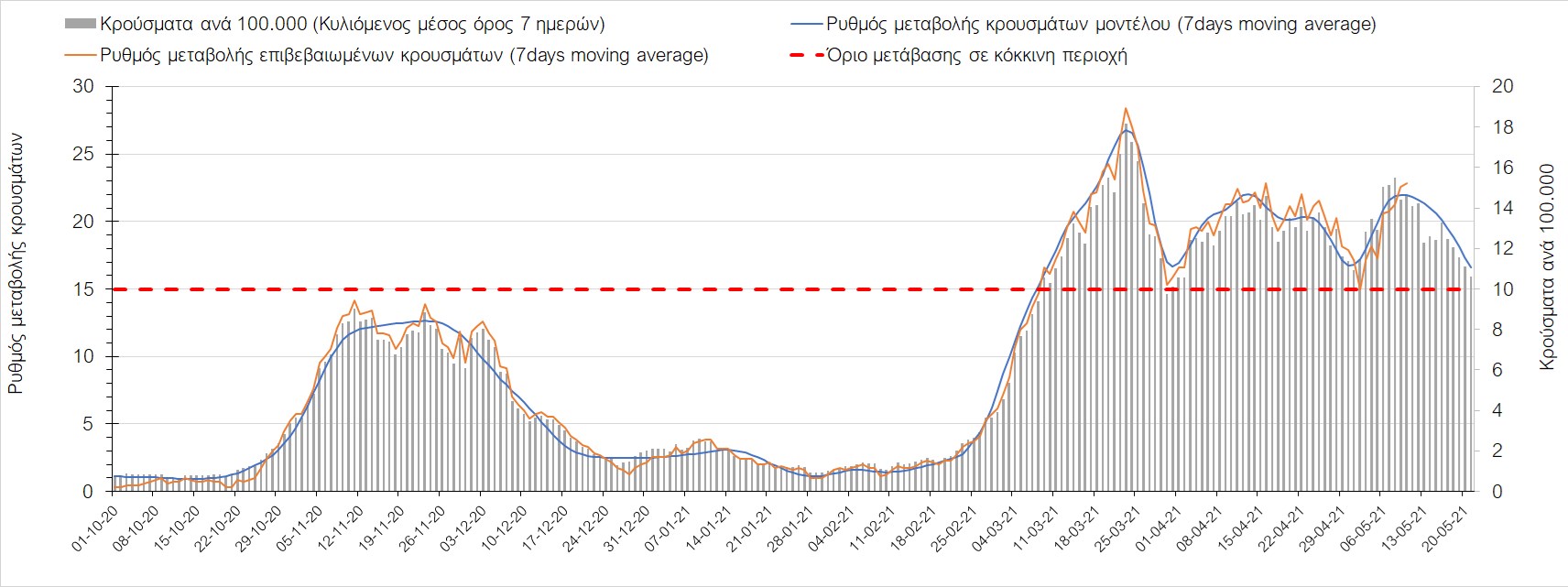 Σχήμα 52. Πορεία του ημερησίου αριθμού των κρουσμάτων (κυλιόμενος μέσος όρος 7 ημερών) στην ΘάσοΣυμπεράσματα:Με βάση τα αποτελέσματα της Δευτέρας είχαμε μείωση στον αριθμό των ασθενών σε κρίσιμη κατάσταση (διασωληνωμένοι σε ΜΕΘ) σε σχέση με προχθές, και διαφαίνεται πολύ ελαφρά κάμψη συνολικά, η οποία εκφράζεται και στον αριθμό των θανάτων. Οι προβλέψεις αυτές συνάδουν με τις προσομοιώσεις του μοντέλου CORE, όπως και ο αριθμός των κρουσμάτων, μετά και τις επικαιροποιημένες προβλέψεις προ 2 μηνών, όπου ελήφθη υπόψιν η μεγαλύτερη διασπορά των μεταλλαγμένων και ταχύτερα μεταδιδόμενων στελεχών. Σε πανελλαδικό επίπεδο ο κυλιόμενος εβδομαδιαίος μέσος όρος του δείκτη θετικότητας διαμορφώθηκε στο 5,5% (η ημερήσια τιμή είναι 6,8%) ενώ ο κυλιόμενος εβδομαδιαίος μέσος όρος του πραγματικού αριθμού αναπαραγωγής Rt (δηλαδή ο αριθμός των ατόμων που ένας φορέας μπορεί να επιμολύνει) διαμορφώθηκε στο 1,06 (τιμές του Rt κάτω από τη μονάδα υποδηλώνουν καθαρή μείωση της διασποράς του ιού στην κοινότητα). Η ταυτόχρονη μείωση και των δύο δεικτών, που παρατηρήθηκε τις προηγούμενες ημέρες δεν συνεχίζεται και αυτή την εβδομάδα, υποδηλώνοντας την ανάσχεση της πτωτικής πορείας στο συνολικό αριθμό κρουσμάτων στη χώρα. Με δεδομένες τις συνεχόμενες αργίες και τον χαμηλό αριθμό τεστ ανίχνευσης για 5 μέρες, είναι δύσκολο να φανεί ακριβώς σε ποιο βαθμό η αύξηση των δεικτών οφείλεται στην ανάσχεση της πτωτικής πορείας και στη διαμόρφωση του ανοδικού κύματος που παρατηρούμε στον αριθμό των κρουσμάτων στο σύνολο της χώρας, και σε ποιο βαθμό αποτελεί διόρθωση των ημερών που πραγματοποιήθηκε μικρός αριθμός τεστ ανίχνευσης. Επίσης, είναι σημαντικό να διατηρηθεί ο υψηλός αριθμός των τεστ ανίχνευσης, έτσι ώστε να μπορούμε να έχουμε καλή εικόνα της διασποράς της πανδημίας στις επόμενες ημέρες, όπου συνδυάζονται με ανοίγματα που είτε ξεκίνησαν (εστίαση) είτε αναμένονται (άνοιγμα Δημοτικών και Γυμνασίων). Όπως ήδη αναφέρθηκε, αναμένεται στις επόμενες ημέρες μια προσωρινή ανάσχεση της πτωτικής πορείας, η οποία θα οδηγήσει και σε μικρής διάρκειας αύξηση του αριθμού των κρουσμάτων (με το προσωρινό μέγιστο να αναμένεται περί τα 2600 κρούσματα/ημέρα (κυλιόμενος εβδομαδιαίος μέσος όρος) στο τέλος Μαΐου, εάν τα ανοίγματα που αναφέραμε (και κυρίως η εστίαση) δεν γίνουν με τους προβλεπόμενους όρους ασφαλείας. Η ήπια αναχαίτιση του 3ου κύματος που παρατηρούνταν μέχρι και τις ημέρες του Πάσχα, οφείλεται σε ένα συνδυασμό παραμέτρων, οι οποίες είναι η συνέχιση του lockdown, η χρήση των self-test, η αύξηση του αριθμού των τεστ από τον ΕΟΔΥ, γεγονός που συντελεί στην απομάκρυνση από τις αλυσίδες μετάδοσης των ασυμπτωματικών και προσυμπτωματικών φορέων, η προοδευτική βελτίωση του καιρού και σε μικρότερο βαθμό η πρόοδος των εμβολιασμών, η σημασία των οποίων στον έλεγχο της πανδημίας θα αρχίσει να είναι πιο εμφανής από το τέλος του επόμενου μήνα, ιδιαίτερα λαμβάνοντας υπόψιν τη σημαντική αύξηση του ρυθμού εμβολιασμού, με περίπου 110.000 εμβολιασμούς ημερησίως. Όμως, με δεδομένο το άνοιγμα του λιανικού εμπορίου και όλων των εκπαιδευτικών βαθμίδων πλέον, είναι ακόμα πιο σημαντική η τήρηση των μέτρων, ενώ ύψιστης σημασίας στις επόμενες εβδομάδες θα αποδειχθεί η ορθή και μαζική εφαρμογή των self-test, με ταυτόχρονη αύξηση της ιχνηλασίας των επαφών των ανιχνευθέντων ως θετικοί και καραντίνα 14 ημερών για τους συμπ