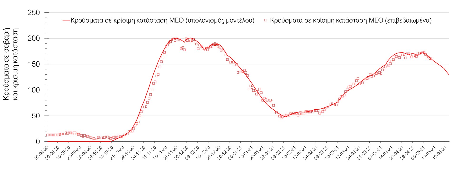 Σχήμα 1. Αριθμός κρουσμάτων σε κρίσιμη κατάσταση (ΜΕΘ) σύμφωνα με τα στοιχεία του ΕΟΔΥ και τις προβλέψεις της υπολογιστικής πλατφόρμας CORE.