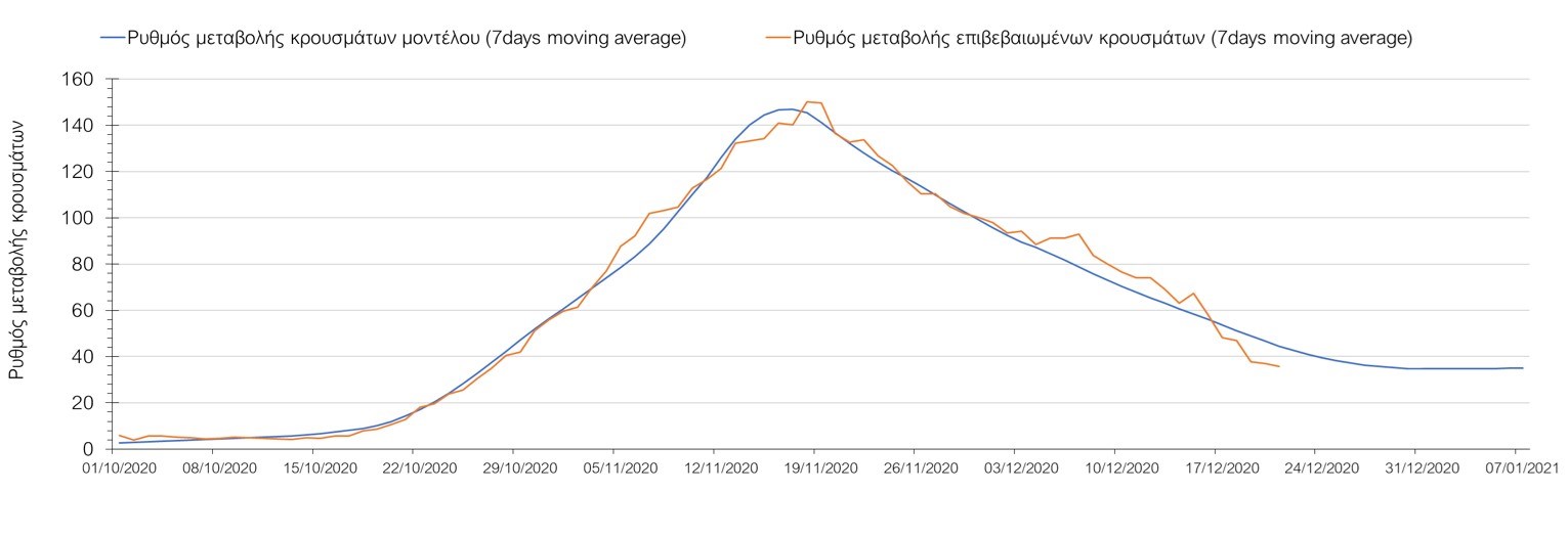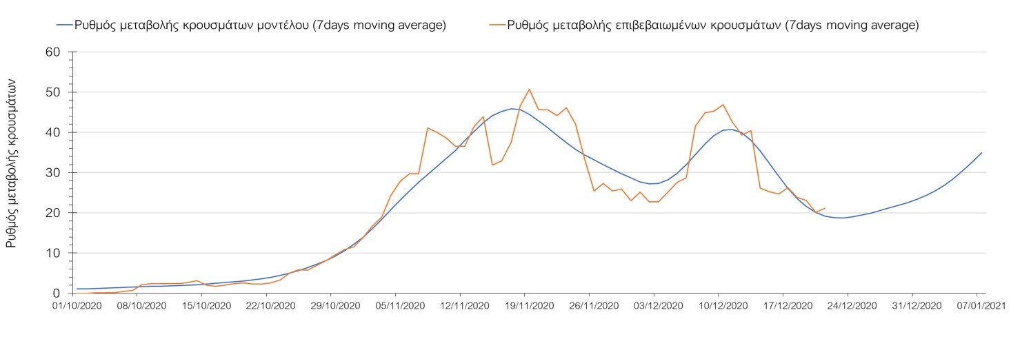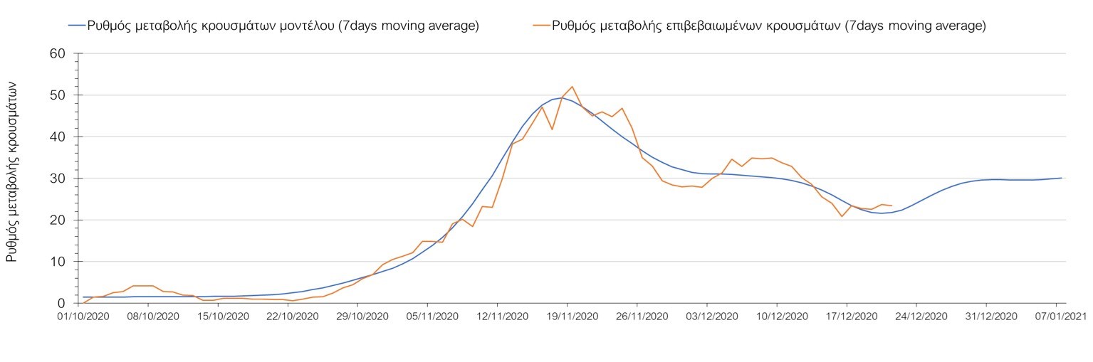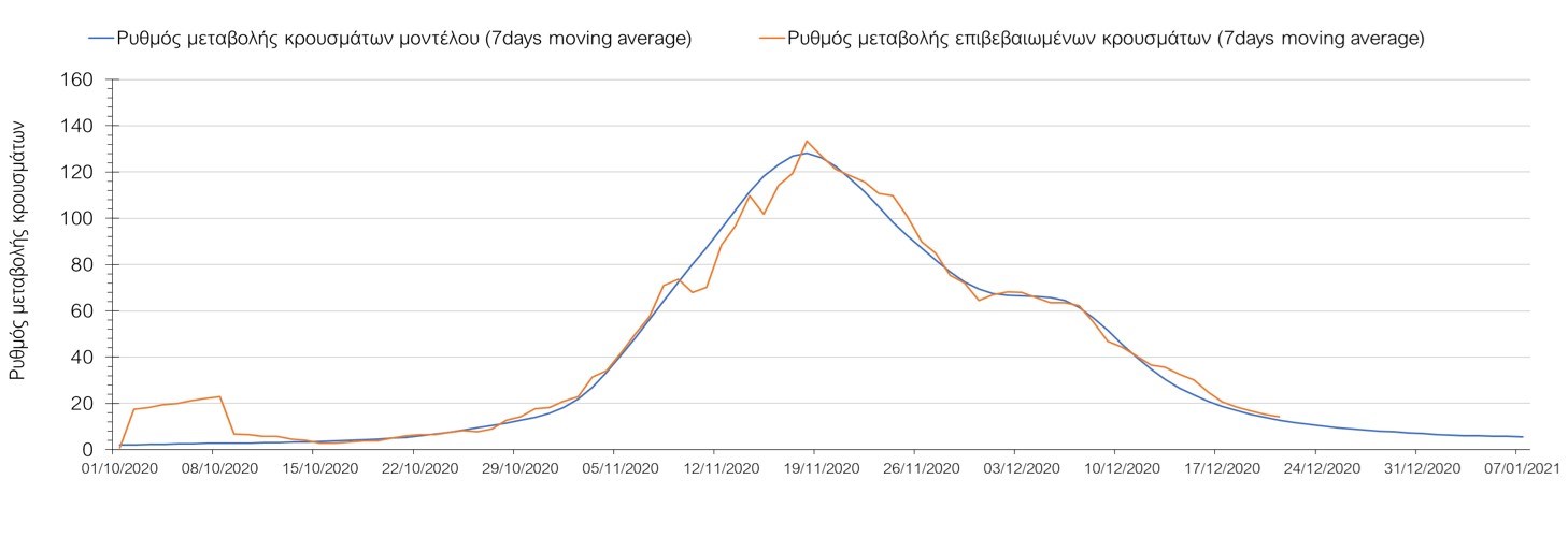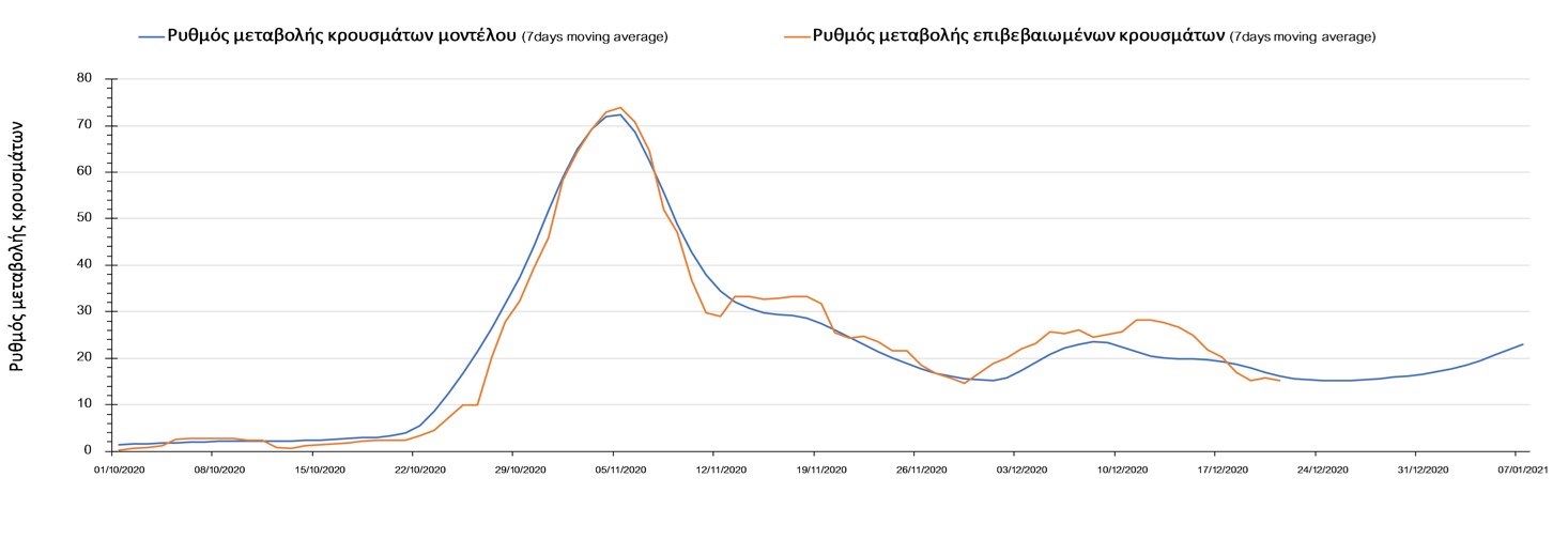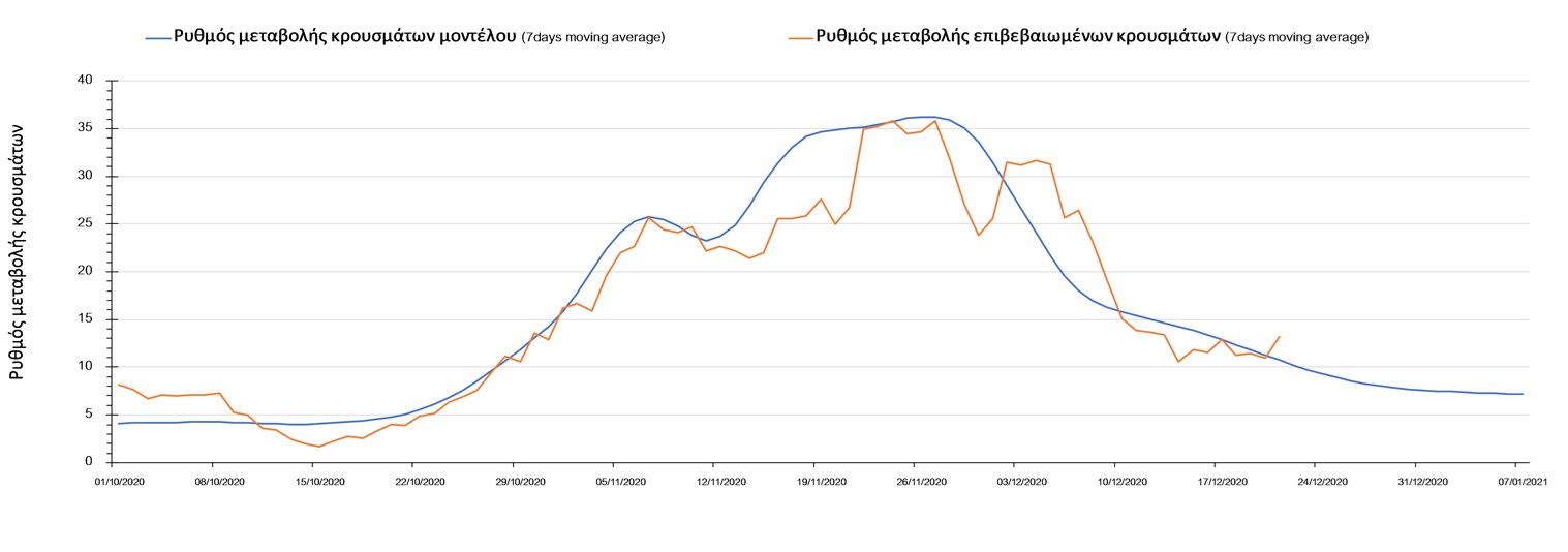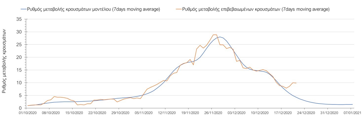 Η πορεία της μέσης εβδομαδιαίας τιμής των κρουσμάτων όπως έχουν καταγραφεί από τον ΕΟΔΥ και η αναμενόμενη πορεία τους μέχρι το τέλος του χρόνου, σύμφωνα με την υπάρχουσα κατάσταση και την απόφαση παράτασης του lockdown μέχρι και τις 7 Ιανουαρίου, όπως προδιαγράφεται από την υπολογιστική πλατφόρμα CORE για την Ελληνική επικράτεια, αποτυπώνονται στο Σχήμα 3.