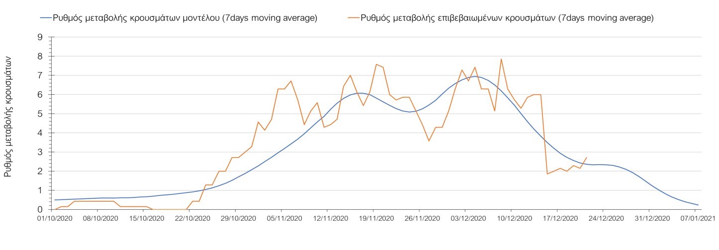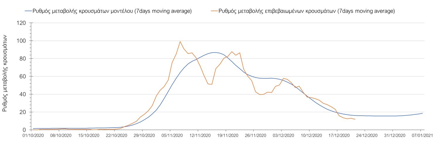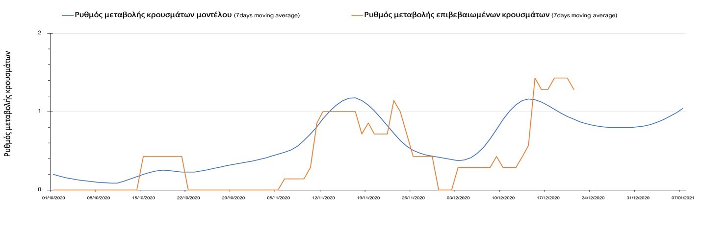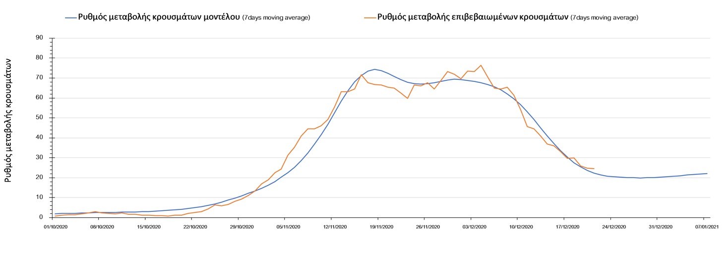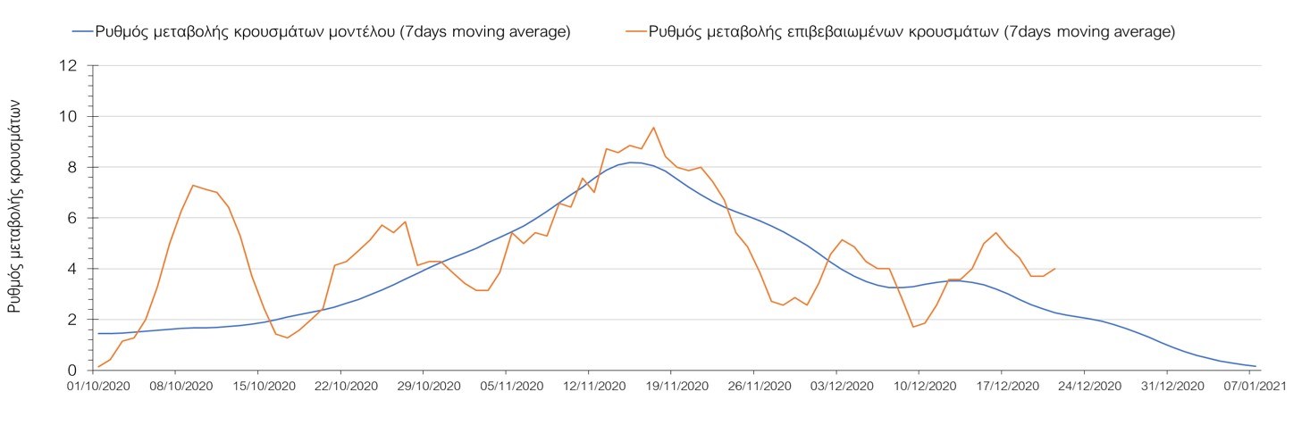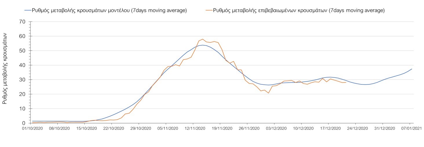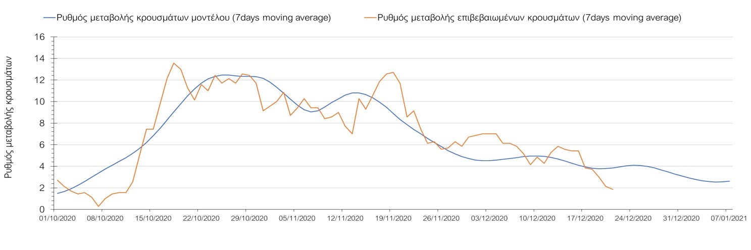 Η πορεία της μέσης εβδομαδιαίας τιμής των κρουσμάτων όπως έχουν καταγραφεί από τον ΕΟΔΥ και η αναμενόμενη πορεία τους μέχρι το τέλος του χρόνου, σύμφωνα με την υπάρχουσα κατάσταση και την απόφαση παράτασης του lockdown μέχρι και τις 7 Ιανουαρίου, όπως προδιαγράφεται από την υπολογιστική πλατφόρμα CORE για την Ελληνική επικράτεια, αποτυπώνονται στο Σχήμα 3.