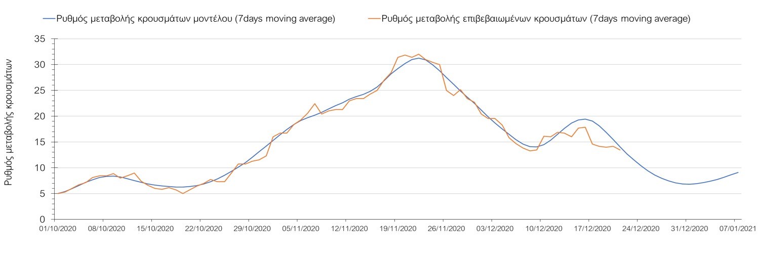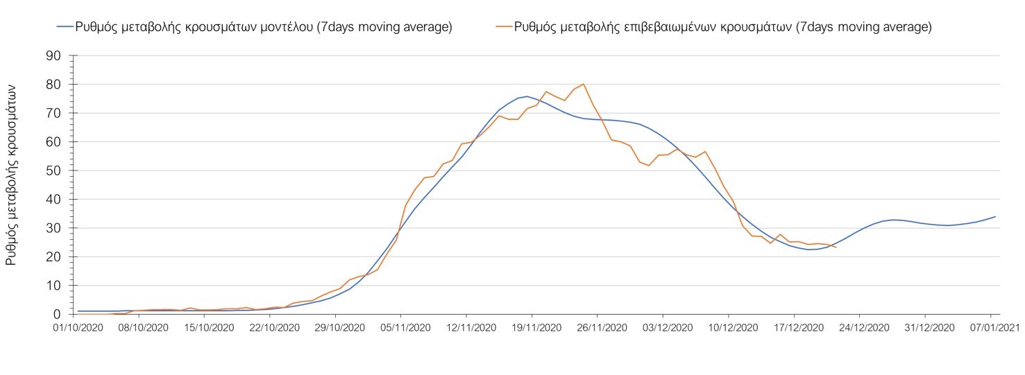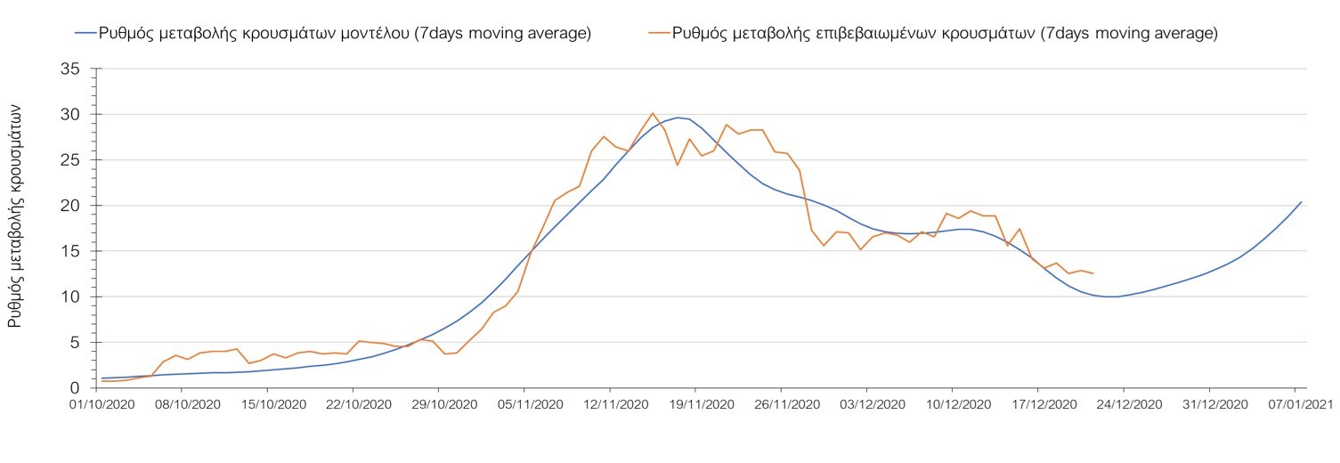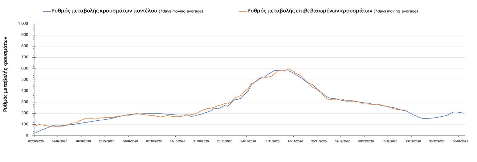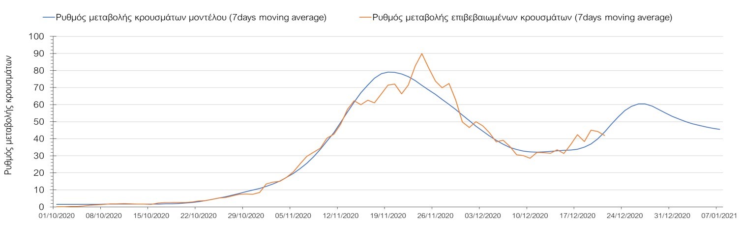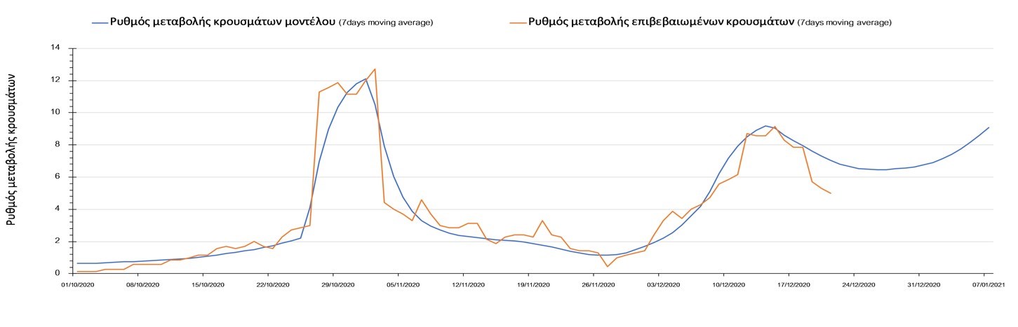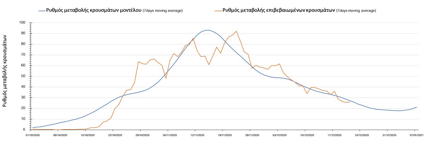 Η πορεία της μέσης εβδομαδιαίας τιμής των κρουσμάτων όπως έχουν καταγραφεί από τον ΕΟΔΥ και η αναμενόμενη πορεία τους μέχρι το τέλος του χρόνου, σύμφωνα με την υπάρχουσα κατάσταση και την απόφαση παράτασης του lockdown μέχρι και τις 7 Ιανουαρίου, όπως προδιαγράφεται από την υπολογιστική πλατφόρμα CORE για την Ελληνική επικράτεια, αποτυπώνονται στο Σχήμα 3.