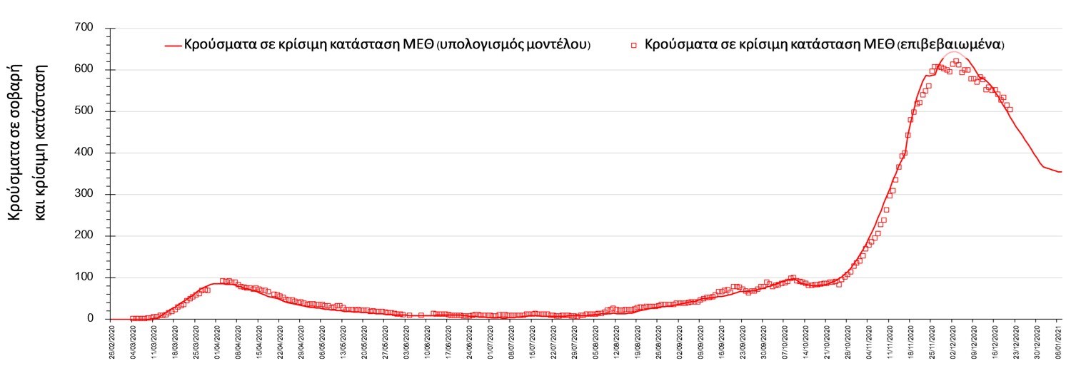Σχήμα 1. Αριθμός κρουσμάτων σε κρίσιμη κατάσταση (ΜΕΘ) σύμφωνα με τα στοιχεία του ΕΟΔΥ και τις προβλέψεις της υπολογιστικής πλατφόρμας CORE.