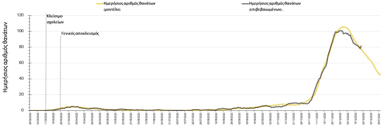 Ο αριθμός θανάτων (85) είναι αυξημένος σε σχέση με την Κυριακή (70), και ακολουθεί με υστέρηση δύο εβδομάδων την καμπύλη αποκλιμάκωσης σε ό,τι αφορά τα επιβεβαιωμένα κρούσματα. Ο γενικά υψηλός αριθμός των θανάτων που καταγράφεται ακόμα και αυτή την εβδομάδα σε συνδυασμό με την παρατηρούμενη μείωση των επιβεβαιωμένων κρουσμάτων σε σχέση με την προηγούμενη εβδομάδα μπορεί να ερμηνευθεί από το γεγονός ότι έγινε πιο συνεπής εφαρμογή του lockdown μετά τις 17-18 Νοεμβρίου, περίπου 10 μέρες μετά την ανακοίνωση του.