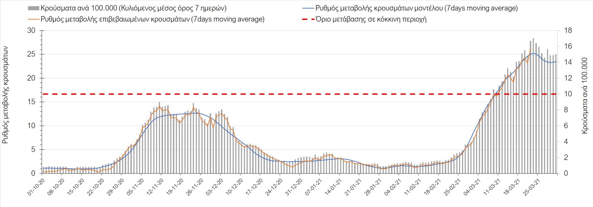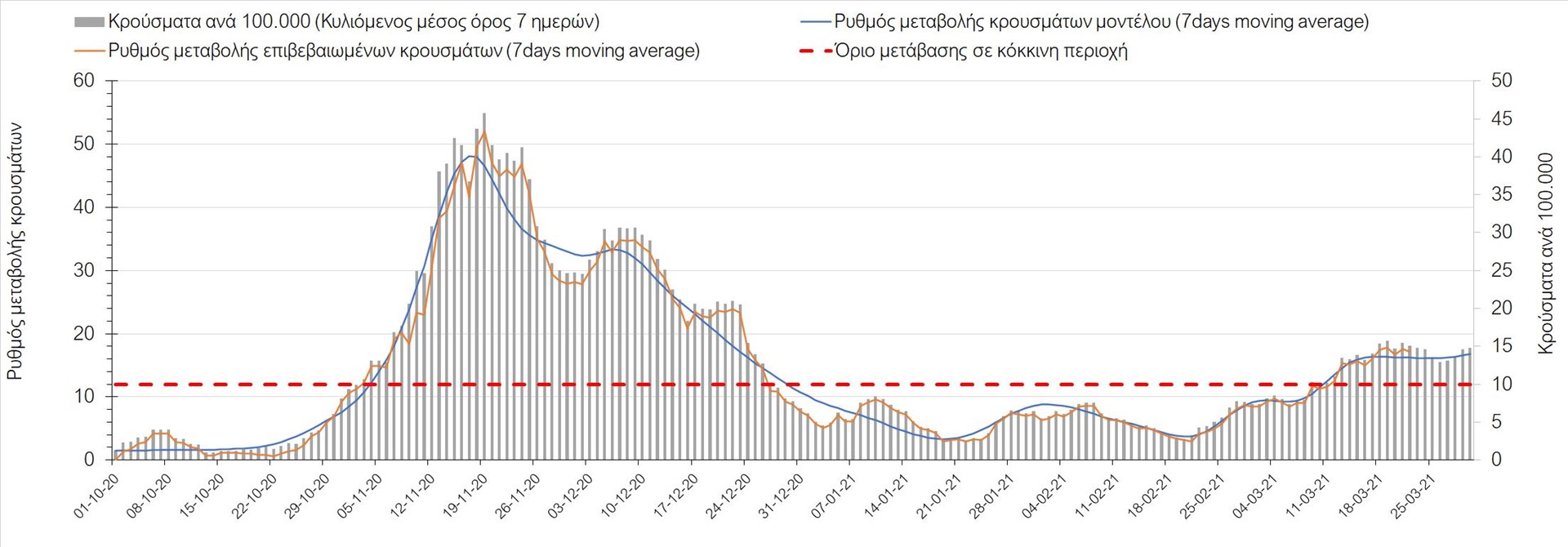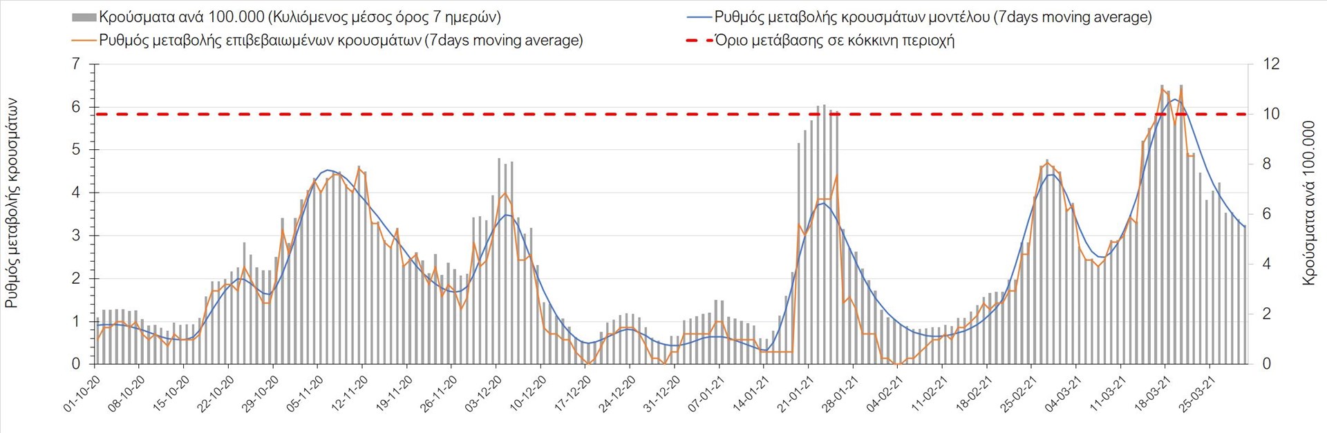 Σχήμα 3. Πορεία του ημερησίου αριθμού των κρουσμάτων (κυλιόμενος μέσος όρος 7 ημερών) στην Ελληνική επικράτεια