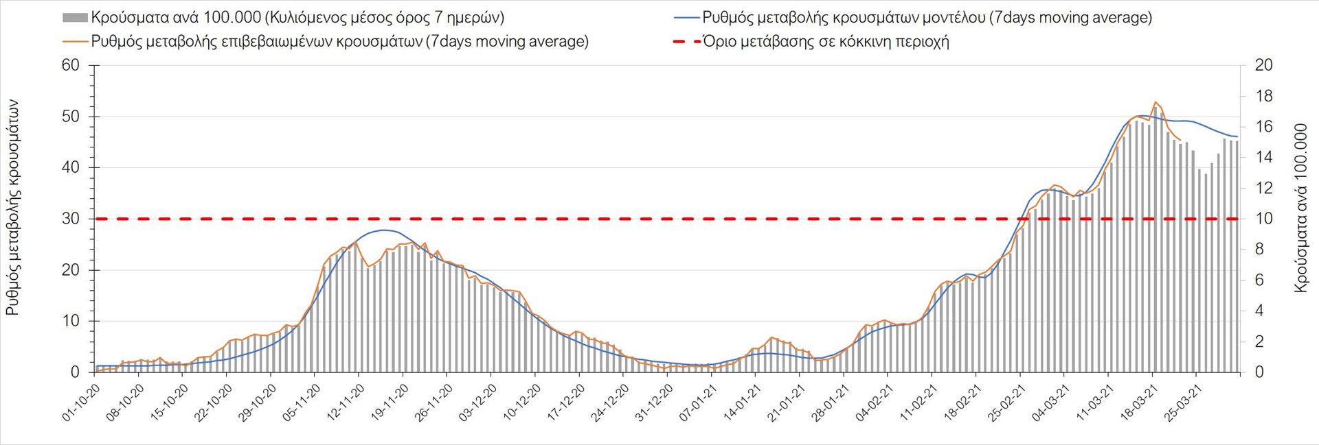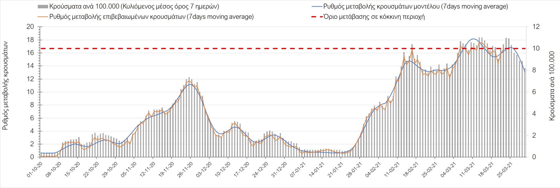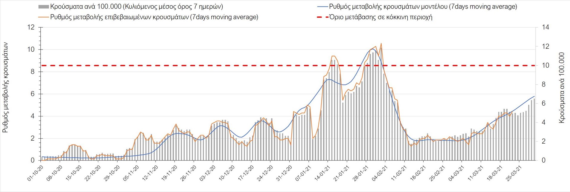 Σχήμα 3. Πορεία του ημερησίου αριθμού των κρουσμάτων (κυλιόμενος μέσος όρος 7 ημερών) στην Ελληνική επικράτεια