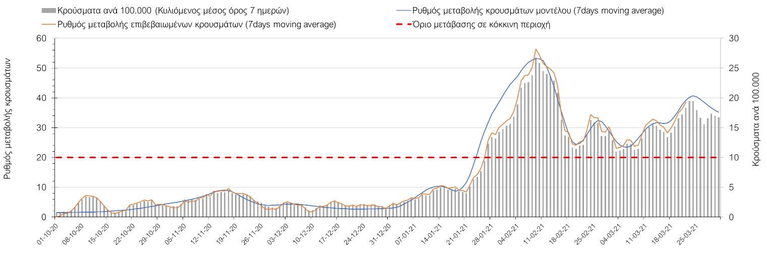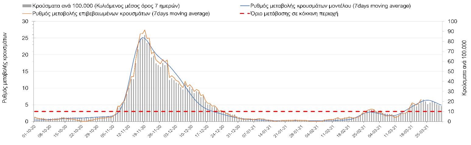 Όσον αφορά τις πόλεις της Βορείου Ελλάδας, αύξηση κρουσμάτων παρουσιάζεται στην Ημαθία με 20 κρούσματα (Σχήμα 27), στο Κιλκίς με 7 κρούσματα (Σχήμα 32), στην Καβάλα με 19 κρούσματα (Σχήμα 33), στην Κοζάνη με 40 κρούσματα (Σχήμα 29), στη Φλώρινα με 3 κρούσματα (Σχήμα 30), στην Καστοριά με 9 κρούσματα (Σχήμα 37) και στα Γρεβενά με 9 κρούσματα (Σχήμα 35). Αντίθετα καθοδική είναι η πορεία της πανδημίας στην Πέλλα με 17 κρούσματα (Σχήμα 28), στην Πιερία με 5 κρούσματα (Σχήμα 29) και στις Σέρρες με 8 κρούσματα (Σχήμα 36). Στην Κοζάνη έχει διαμορφωθεί σταθερά ανοδικής τάσης και στην Καστοριά η συνολική πορεία της επιδημικής καμπύλης είναι αυξητική και η κορύφωση προβλέπεται να επέλθει σε 3-4 ημέρες. Παρά την εφαρμογή των περιοριστικών μέτρων η Χαλκιδική προβλέπεται να παραμείνει «κόκκινη» και μετά το τέλος του μήνα. Εντούτοις και άλλες περιοχές πλέον είτε βρίσκονται τις τελευταίες ημέρες πάνω από το όριο (Καβάλα, Ημαθία, Πέλλα, Καστοριά, Κιλκίς, Πιερία, Γρεβενά, Σέρρες, Καστοριά). Από αυτές όμως περισσότερο ανησυχεί και πάλι η Κοζάνη, στην οποία έχει διαμορφωθεί έντονη αυξητική τάση τις τελευταίες ημέρες, η οποία εάν ακολουθήσει την προβλεπόμενη τροχιά θα αρχίσει να αποκλιμακώνεται μετά τις 25 Μαρτίου, όπως και η Καστοριά, η οποία έχει για την ώρα έχει εμφανίσει πτωτική τάση, η οποία όμως θα φανεί εάν έχει σταθεροποιηθεί στις επόμενες ημέρες όπου θα πραγματοποιηθεί υψηλός αριθμός των τεστ ανίχνευσης.