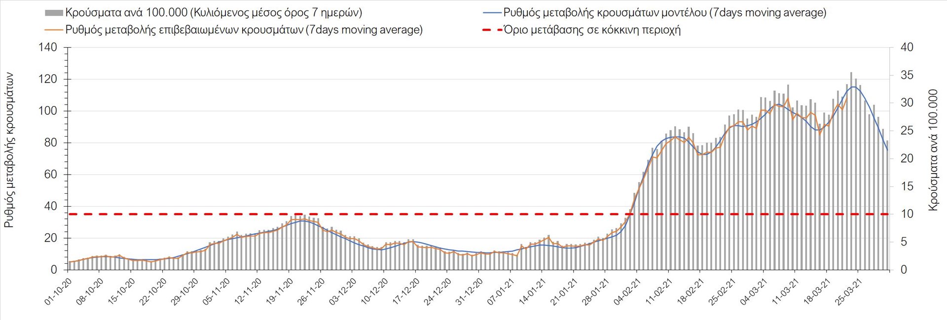 Σχήμα 34. Πορεία του ημερησίου αριθμού των κρουσμάτων (κυλιόμενος μέσος όρος 7 ημερών) στην Πιερία