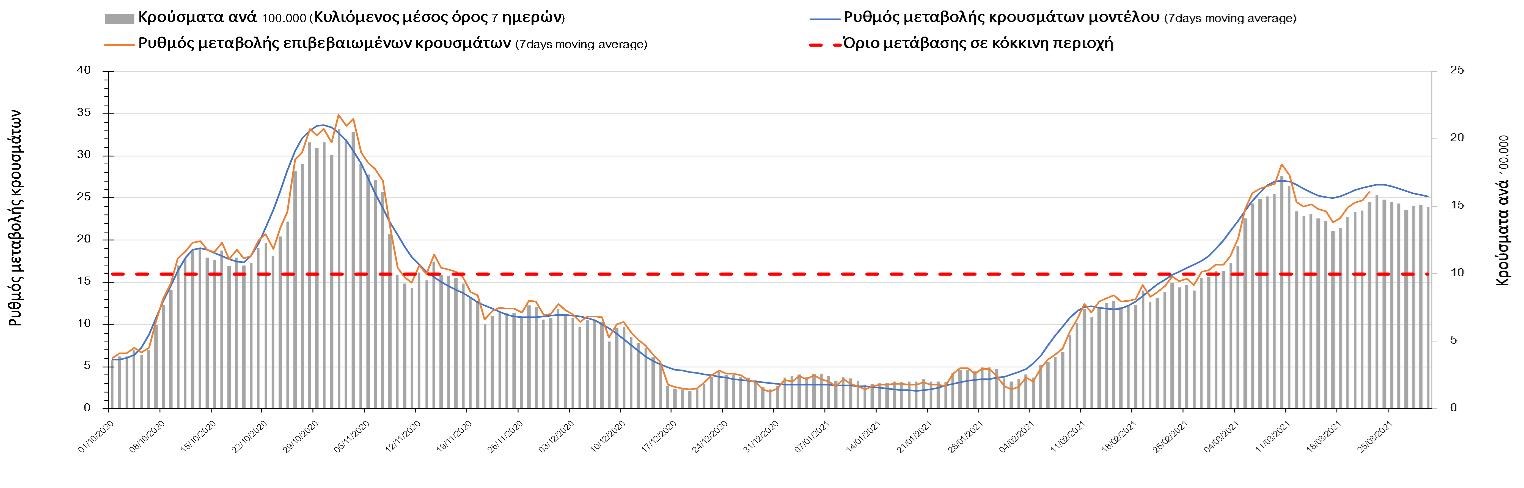 Όπως φαίνεται από το διάγραμμα, από τις 8 Ιανουαρίου έχουμε μια αύξηση κρουσμάτων μέχρι τις 11 Ιανουαρίου η οποία οφείλεται στη μείωση της περιστολής που σημειώθηκε στις γιορτές. Από τις 11 μέχρι τις 18 Ιανουαρίου προβλεπόταν μια μείωση κρουσμάτων λόγω της εφαρμογής του lockdown και η οποία όντως παρατηρήθηκε. Εντούτοις, όπως είχαμε προβλέψει, από τις 23 Ιανουαρίου και έπειτα διαφαίνεται αύξηση στον κυλιόμενο μέσο όρο των κρουσμάτων, η οποία έγινε ιδιαίτερα έντονη μετά τις 17/2, η οποία και συνεχίζεται μέχρι τώρα. Λόγω της ισχυρής παρουσία των μεταλλαγμένων στελεχών, πιστεύουμε ότι για να επιτευχθεί κάμψη της επιδημικής καμπύλης, θα πρέπει να γίνει αυστηρή εφαρμογή των μέτρων, έτσι ώστε σε συνδυασμό με την επικρατούσα μετεωρολογία να επέλθει επιβράδυνση της ανόδου ή και σταθεροποίηση των κρουσμάτων προς το τέλος του μήνα. Πάντως για να μπορέσουμε να προχωρήσουμε σε σταδιακή άρση των περιοριστικών μέτρων για οικονομικές, εκπαιδευτικές και πολιτιστικές/αθλητικές δραστηριότητες, θα πρέπει να δημιουργήσουμε την κατάλληλη υποδομή ώστε να μπορέσουμε να αναχαιτίσουμε την υπερμετάδοση των μεταλλαγμένων στελεχών εκεί όπου συμβαίνει κατά το μάλλον, δηλαδή στους τόπους εργασίας και τα μέσα μαζικής μεταφοράς. Στα συμπεράσματα προτείνονται σχετικές λύσεις.