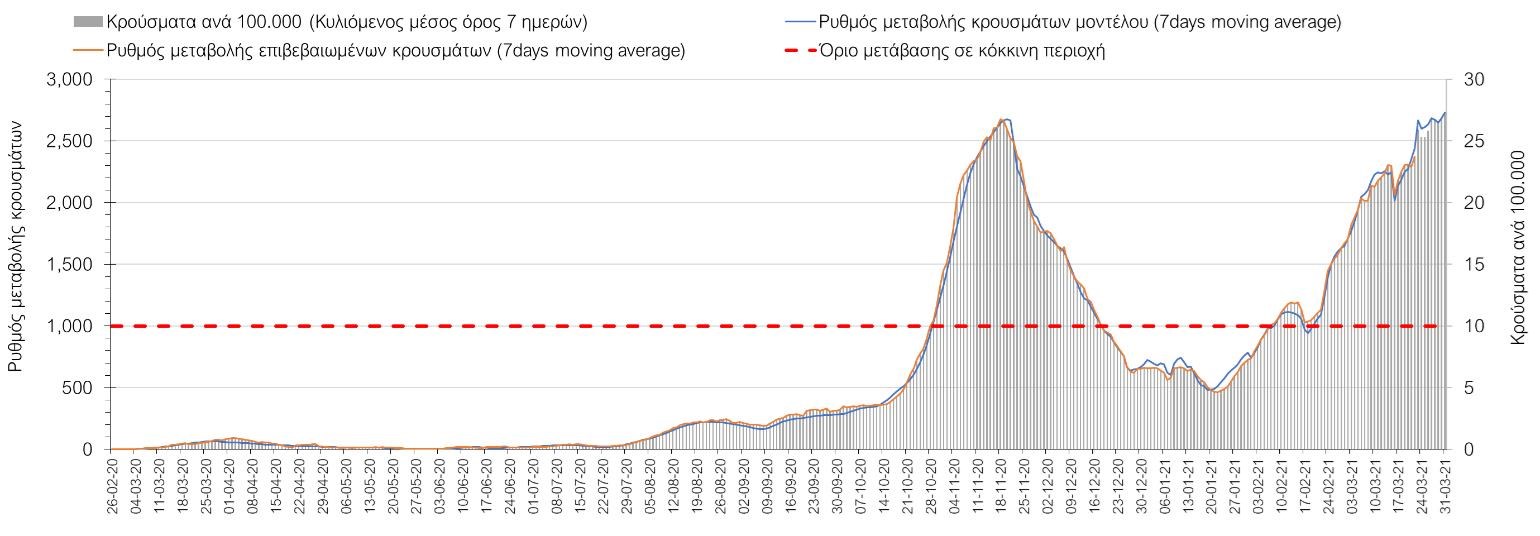 Ο αριθμός θανάτων (69) είναι σημαντικά αυξημένος σε σχέση με την Κυριακή (41) και όπως είχαμε προβλέψει από την προηγούμενη εβδομάδα, ο κυλιόμενος εβδομαδιαίος μέσος όρος που είναι 56, αναμένεται να αυξηθεί περαιτέρω μέχρι και κοντά στα 70 μέχρι το τέλος Μαρτίου (σε επίπεδο μέσης εβδομαδιαίας τιμής), με δεδομένη την αύξηση του αριθμού των κρουσμάτων και την αύξηση του αριθμού των διασωληνωμένων.