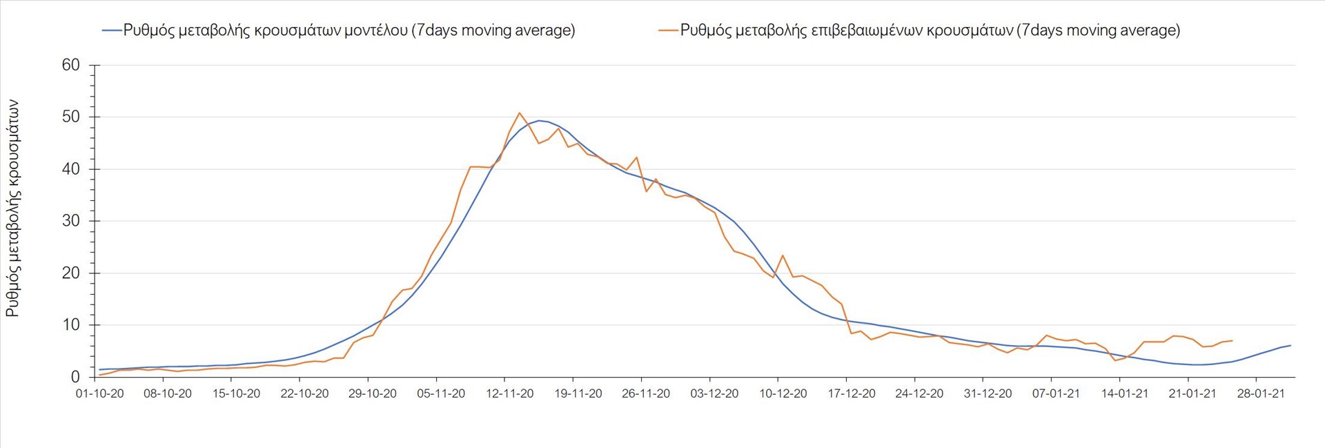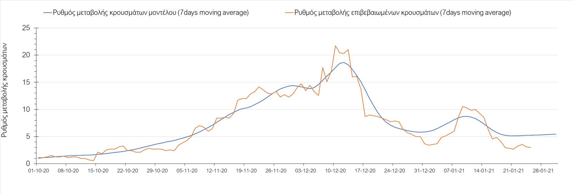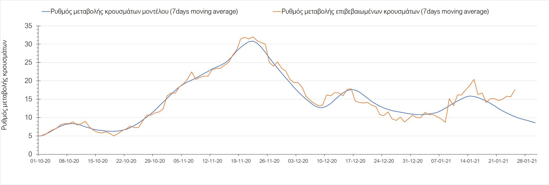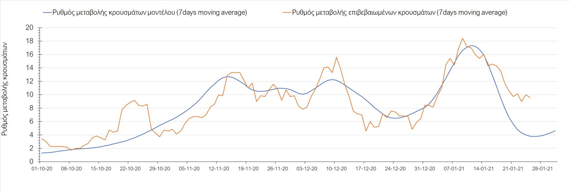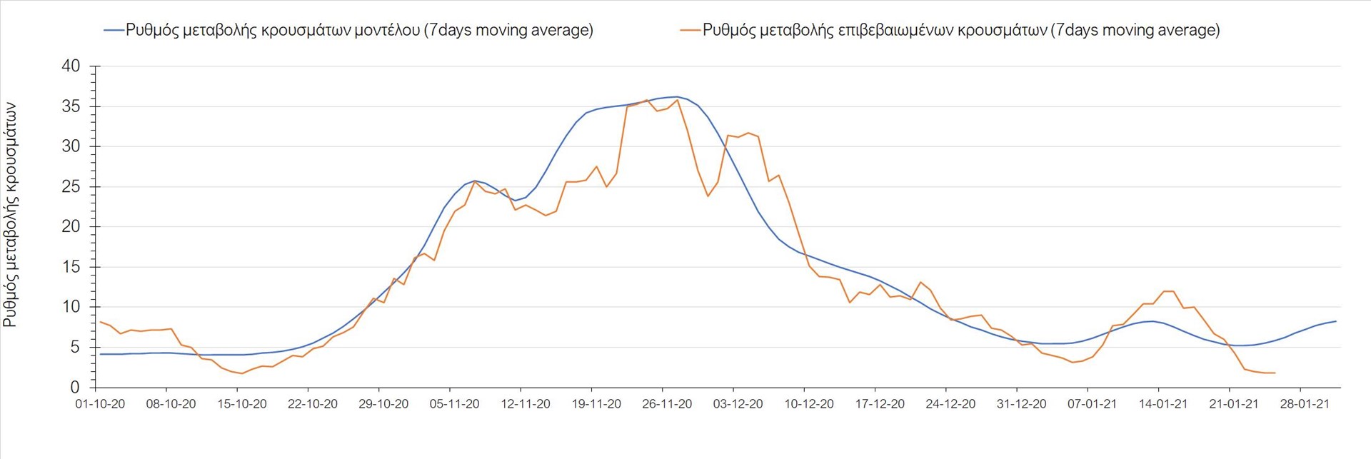 Όπως φαίνεται από το διάγραμμα, από τις 8 Ιανουαρίου έχουμε μια αύξηση κρουσμάτων μέχρι τις 11 Ιανουαρίου η οποία οφείλεται στη μείωση της περιστολής που σημειώθηκε στις γιορτές. Από τις 11 μέχρι τις 18 Ιανουαρίου προβλεπόταν μια μείωση κρουσμάτων λόγω της εφαρμογής του lockdown που είναι σε ισχύ και αυτήν την εβδομάδα και η οποία όντως παρατηρήθηκε. Από τις 23 Ιανουαρίου και έπειτα διαφαίνεται μια ελαφρά αύξηση στον κυλιόμενο μέσο όρο των κρουσμάτων που θα συνεχιστεί μέχρι το τέλος του μήνα.