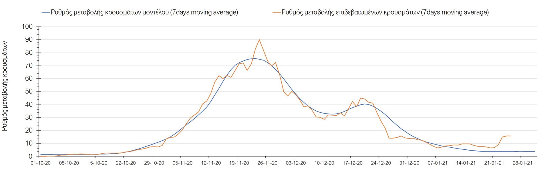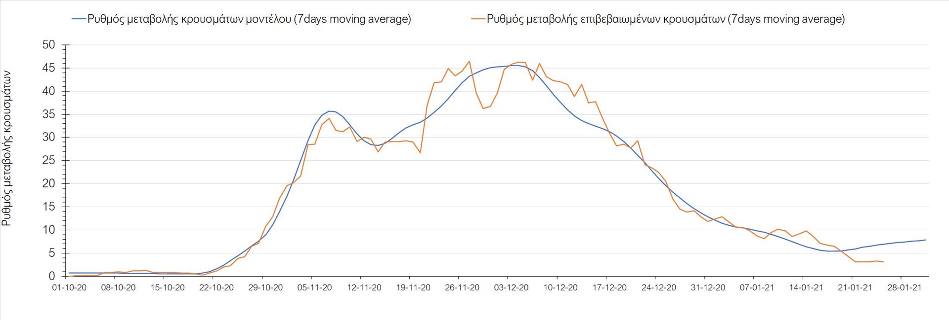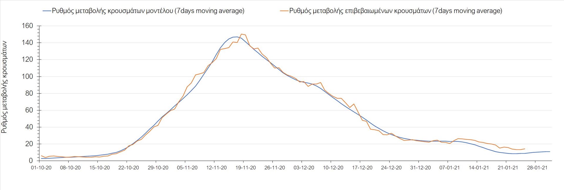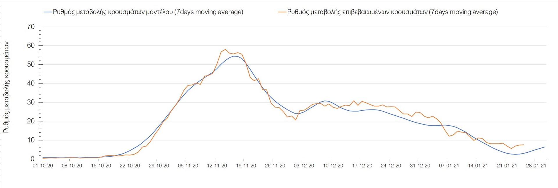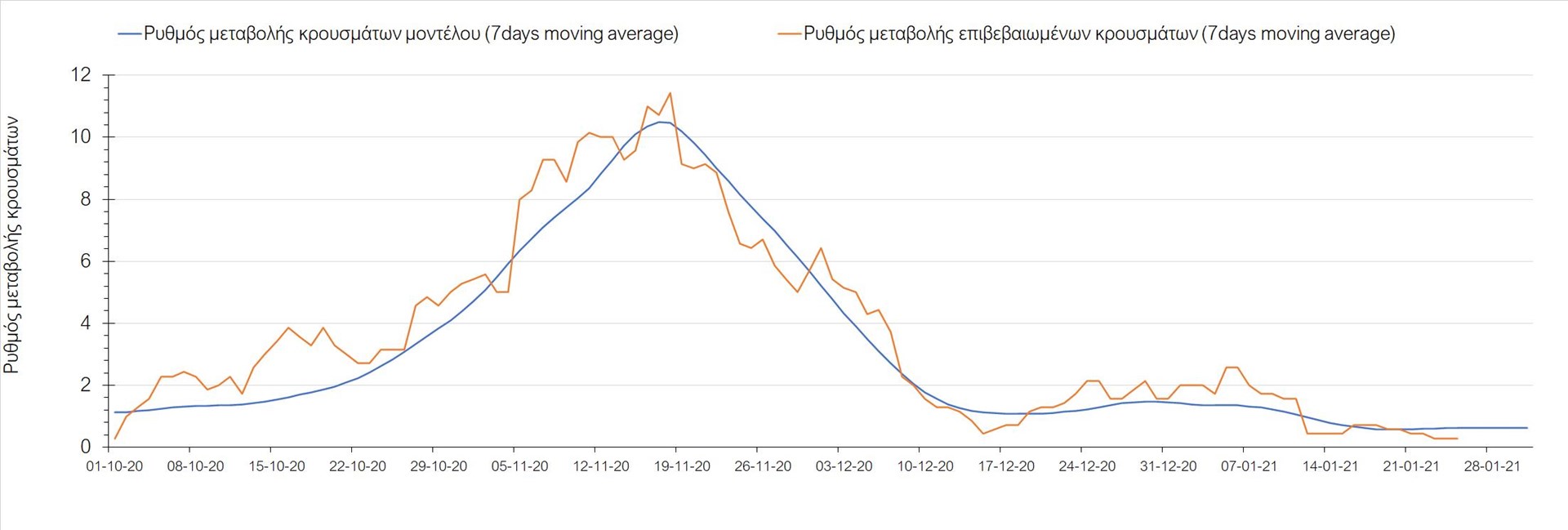 Όπως φαίνεται από το διάγραμμα, από τις 8 Ιανουαρίου έχουμε μια αύξηση κρουσμάτων μέχρι τις 11 Ιανουαρίου η οποία οφείλεται στη μείωση της περιστολής που σημειώθηκε στις γιορτές. Από τις 11 μέχρι τις 18 Ιανουαρίου προβλεπόταν μια μείωση κρουσμάτων λόγω της εφαρμογής του lockdown που είναι σε ισχύ και αυτήν την εβδομάδα και η οποία όντως παρατηρήθηκε. Από τις 23 Ιανουαρίου και έπειτα διαφαίνεται μια ελαφρά αύξηση στον κυλιόμενο μέσο όρο των κρουσμάτων που θα συνεχιστεί μέχρι το τέλος του μήνα.