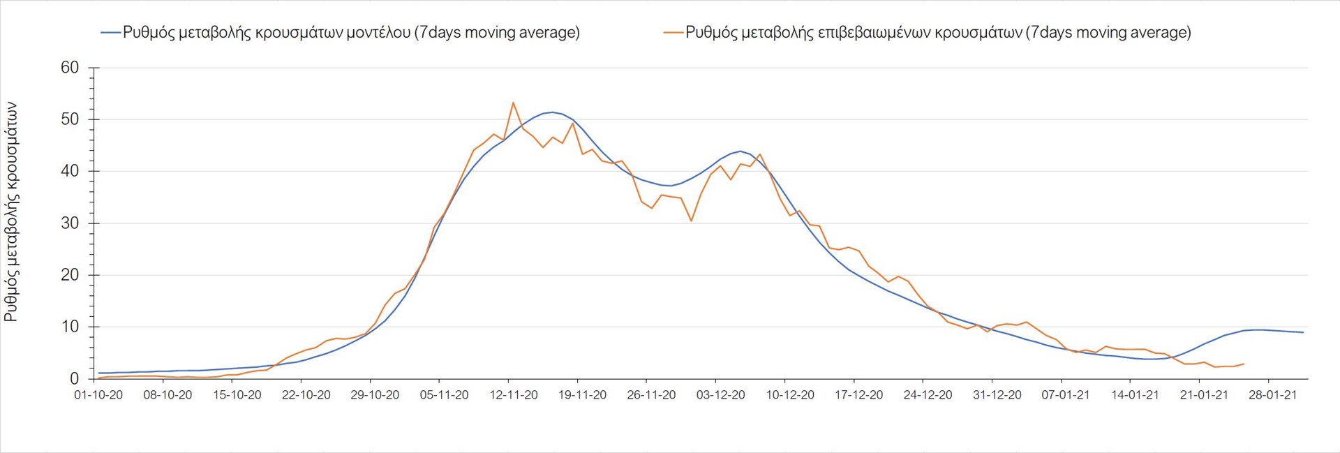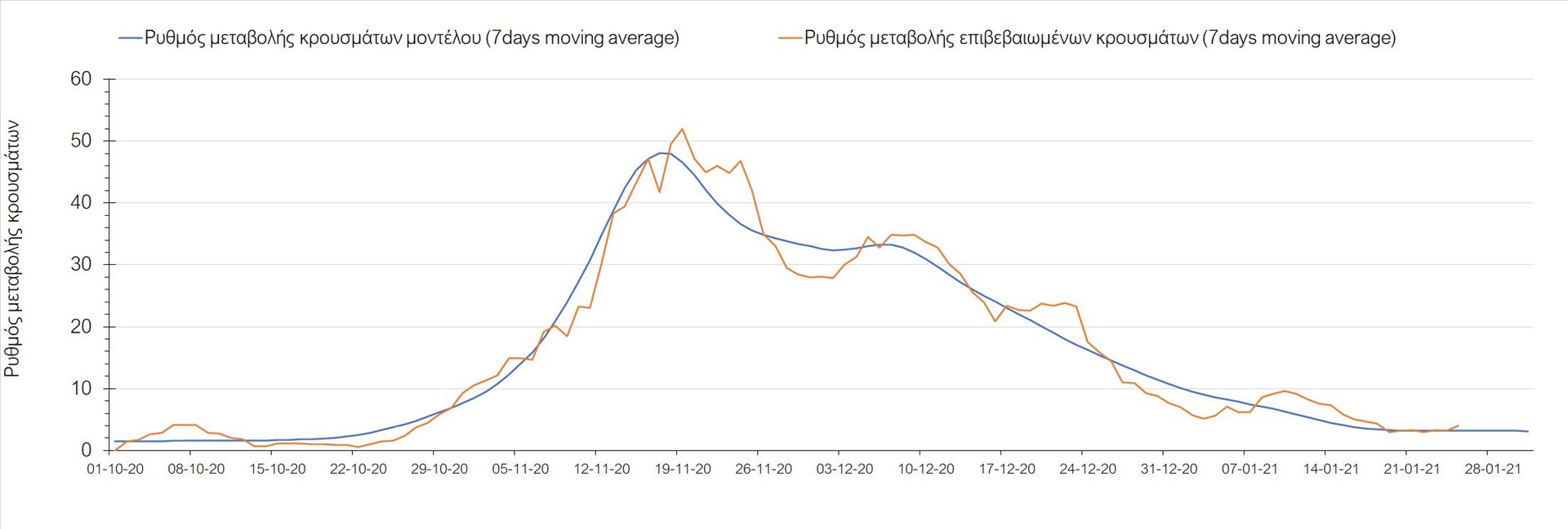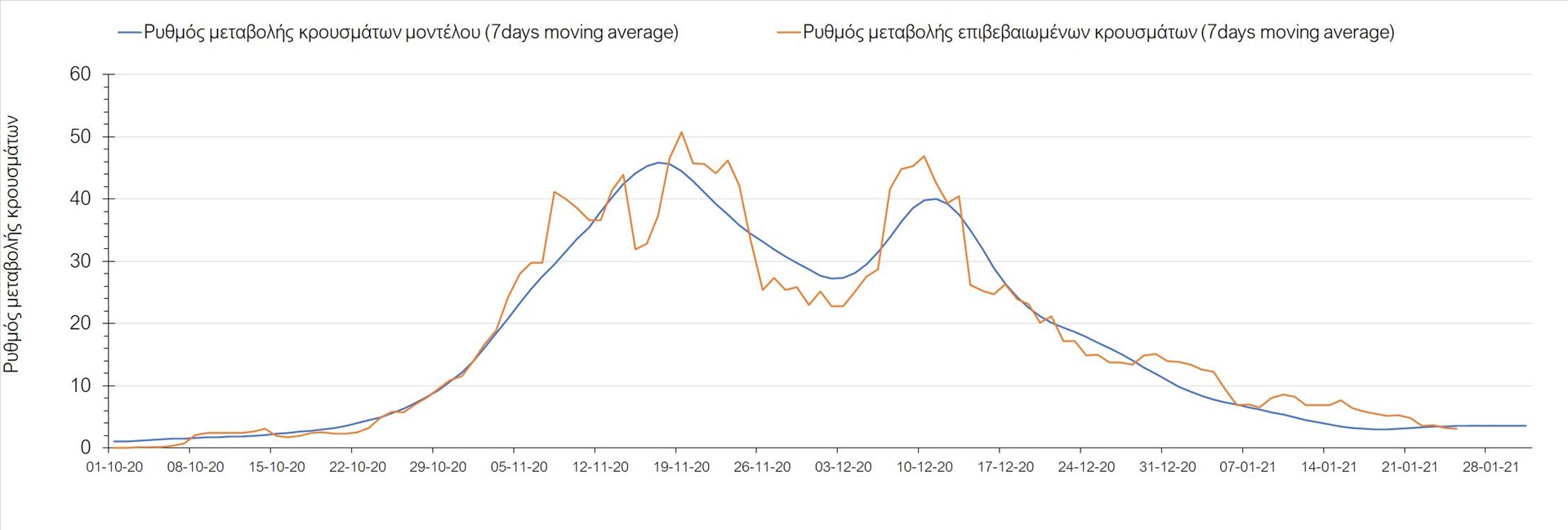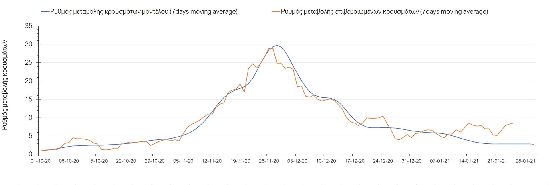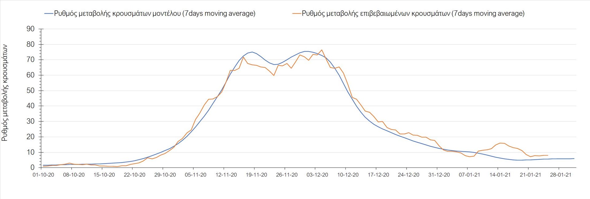 Όπως φαίνεται από το διάγραμμα, από τις 8 Ιανουαρίου έχουμε μια αύξηση κρουσμάτων μέχρι τις 11 Ιανουαρίου η οποία οφείλεται στη μείωση της περιστολής που σημειώθηκε στις γιορτές. Από τις 11 μέχρι τις 18 Ιανουαρίου προβλεπόταν μια μείωση κρουσμάτων λόγω της εφαρμογής του lockdown που είναι σε ισχύ και αυτήν την εβδομάδα και η οποία όντως παρατηρήθηκε. Από τις 23 Ιανουαρίου και έπειτα διαφαίνεται μια ελαφρά αύξηση στον κυλιόμενο μέσο όρο των κρουσμάτων που θα συνεχιστεί μέχρι το τέλος του μήνα.
