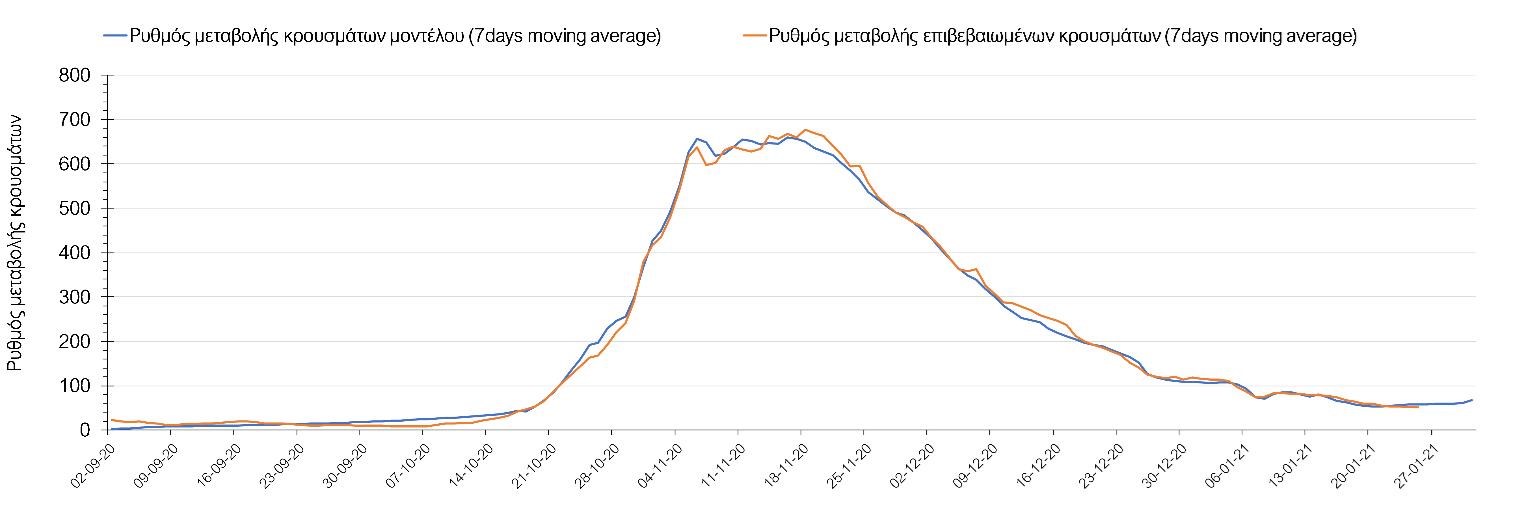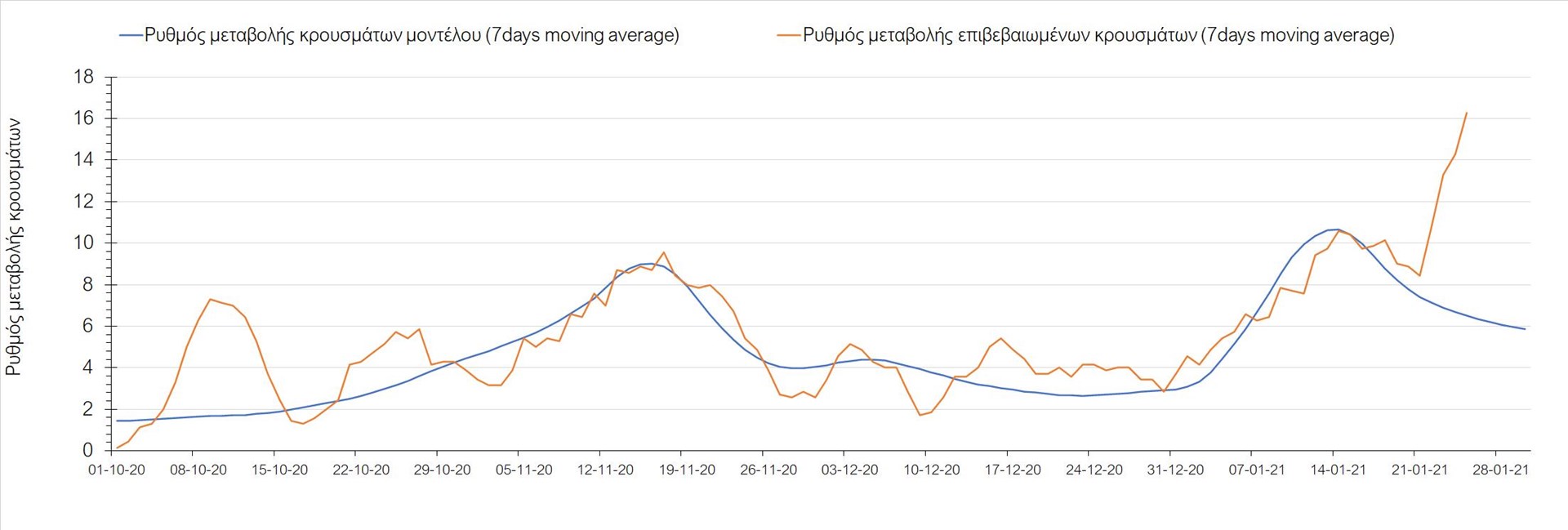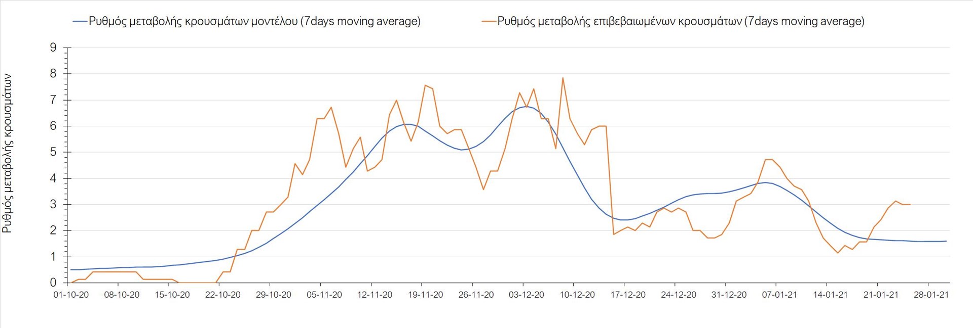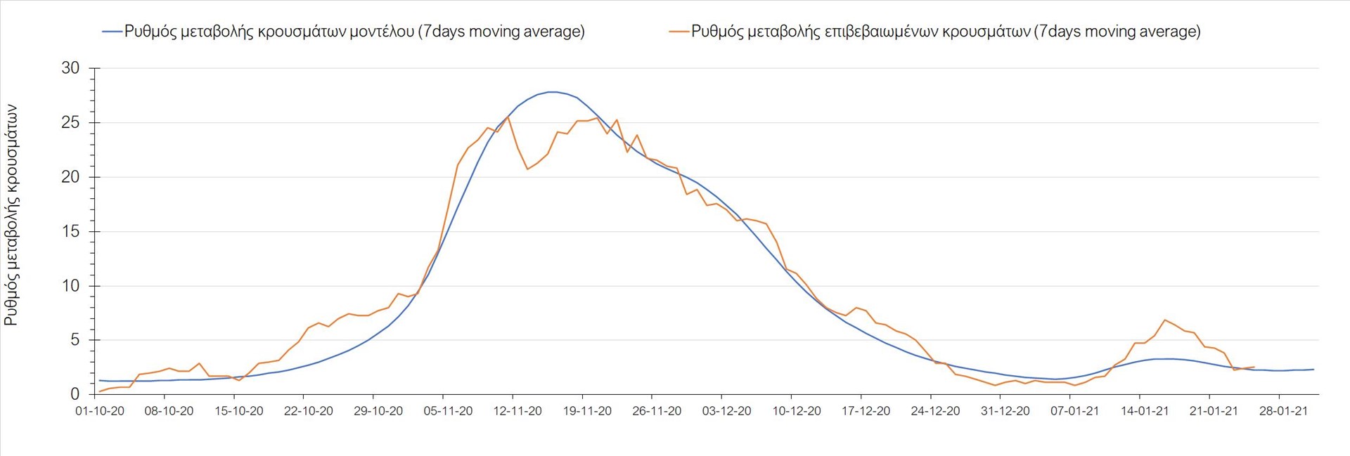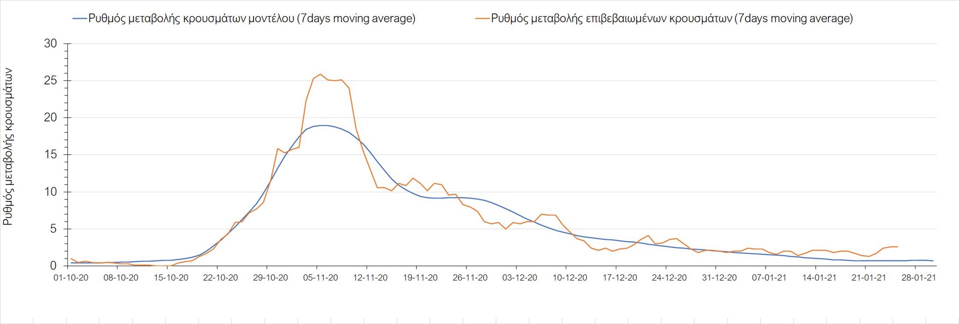 Όπως φαίνεται από το διάγραμμα, από τις 8 Ιανουαρίου έχουμε μια αύξηση κρουσμάτων μέχρι τις 11 Ιανουαρίου η οποία οφείλεται στη μείωση της περιστολής που σημειώθηκε στις γιορτές. Από τις 11 μέχρι τις 18 Ιανουαρίου προβλεπόταν μια μείωση κρουσμάτων λόγω της εφαρμογής του lockdown που είναι σε ισχύ και αυτήν την εβδομάδα και η οποία όντως παρατηρήθηκε. Από τις 23 Ιανουαρίου και έπειτα διαφαίνεται μια ελαφρά αύξηση στον κυλιόμενο μέσο όρο των κρουσμάτων που θα συνεχιστεί μέχρι το τέλος του μήνα.