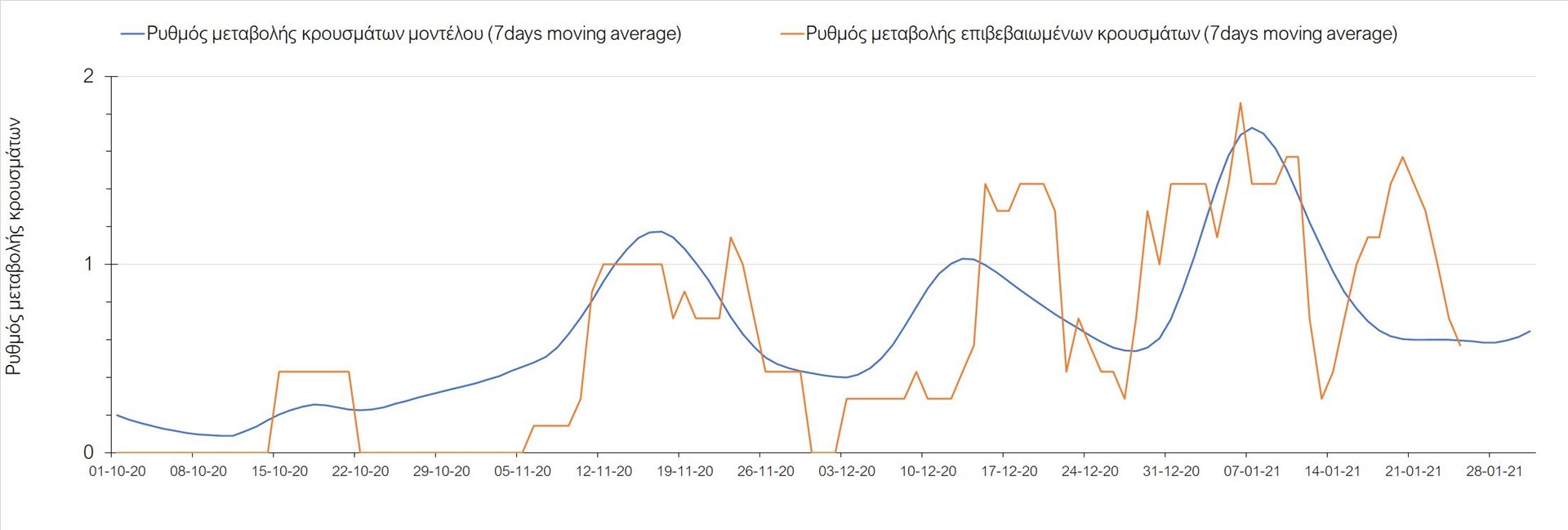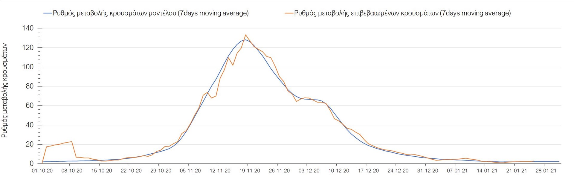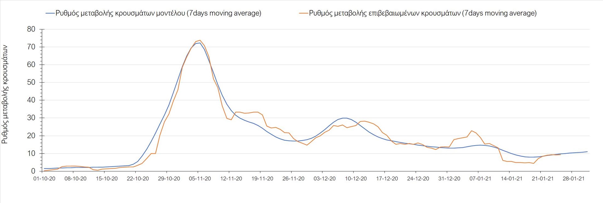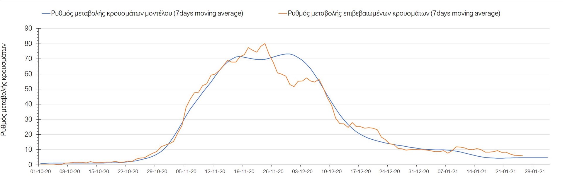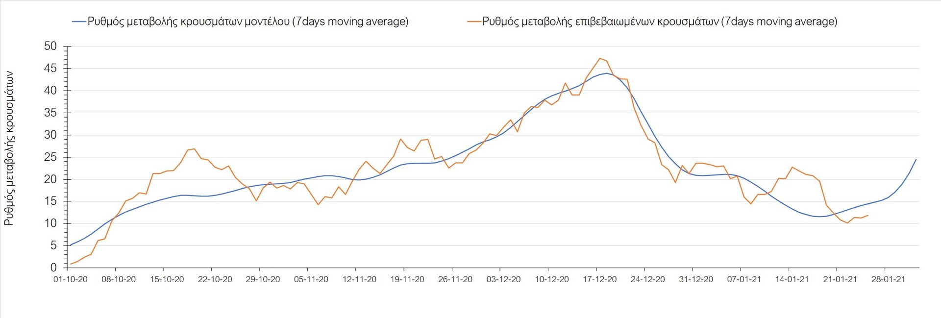 Όπως φαίνεται από το διάγραμμα, από τις 8 Ιανουαρίου έχουμε μια αύξηση κρουσμάτων μέχρι τις 11 Ιανουαρίου η οποία οφείλεται στη μείωση της περιστολής που σημειώθηκε στις γιορτές. Από τις 11 μέχρι τις 18 Ιανουαρίου προβλεπόταν μια μείωση κρουσμάτων λόγω της εφαρμογής του lockdown που είναι σε ισχύ και αυτήν την εβδομάδα και η οποία όντως παρατηρήθηκε. Από τις 23 Ιανουαρίου και έπειτα διαφαίνεται μια ελαφρά αύξηση στον κυλιόμενο μέσο όρο των κρουσμάτων που θα συνεχιστεί μέχρι το τέλος του μήνα.