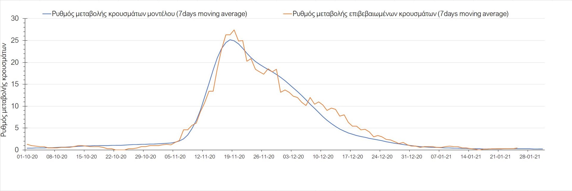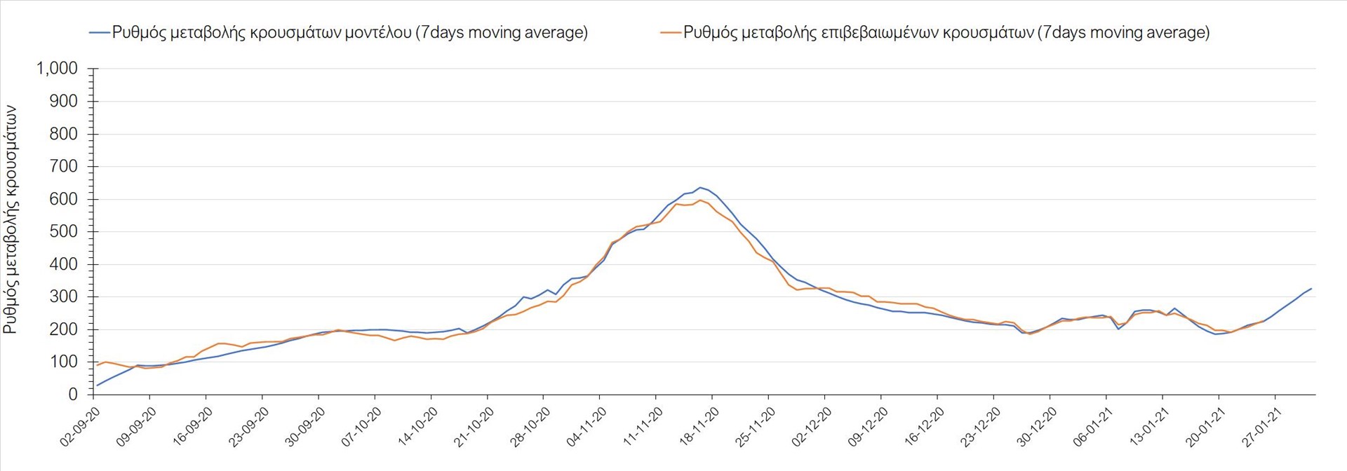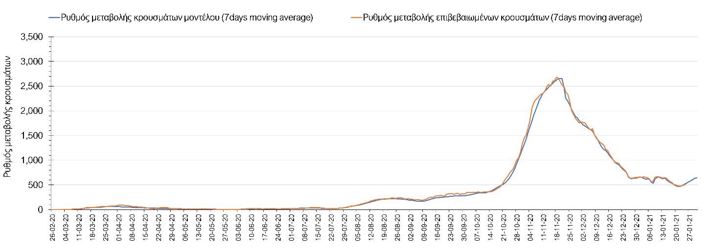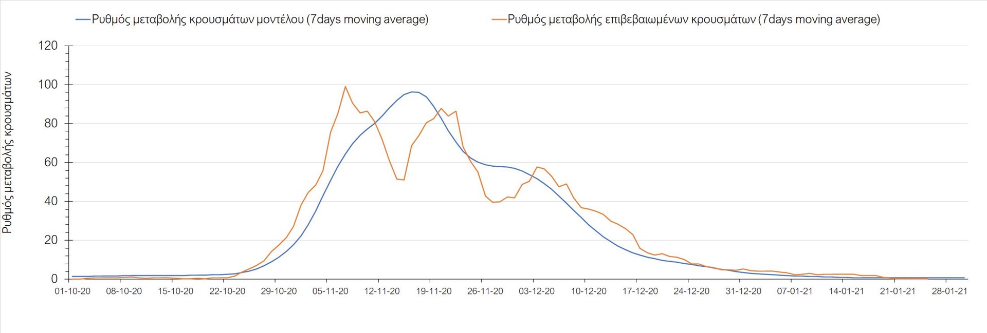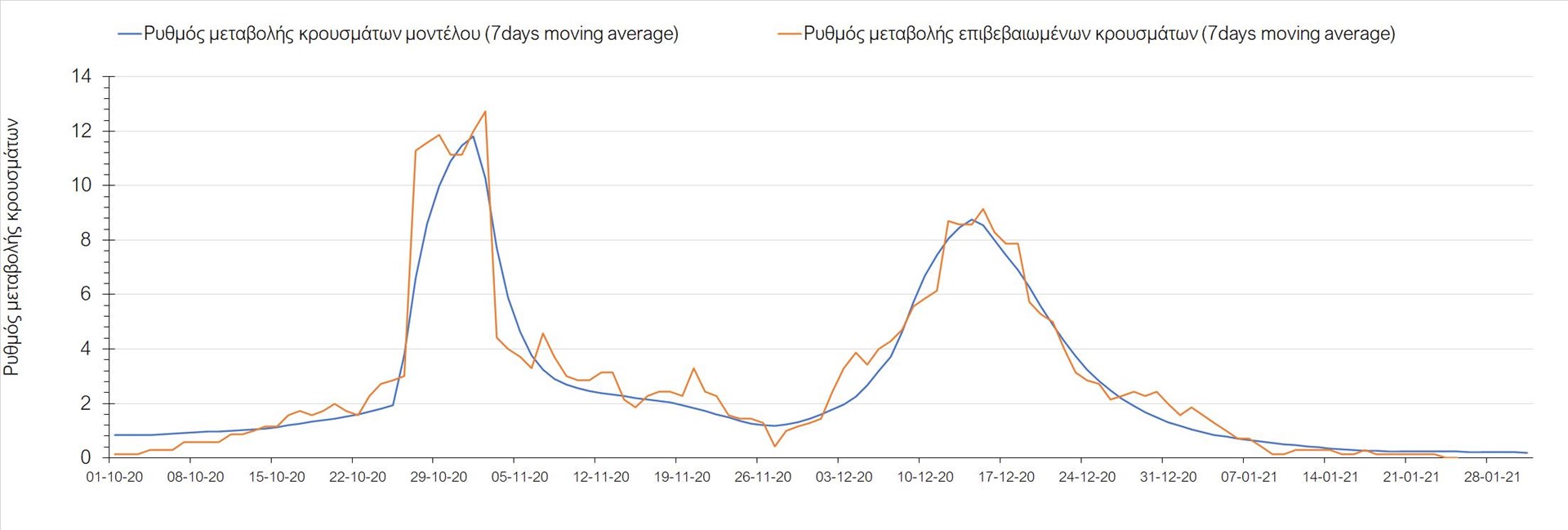 Όπως φαίνεται από το διάγραμμα, από τις 8 Ιανουαρίου έχουμε μια αύξηση κρουσμάτων μέχρι τις 11 Ιανουαρίου η οποία οφείλεται στη μείωση της περιστολής που σημειώθηκε στις γιορτές. Από τις 11 μέχρι τις 18 Ιανουαρίου προβλεπόταν μια μείωση κρουσμάτων λόγω της εφαρμογής του lockdown που είναι σε ισχύ και αυτήν την εβδομάδα και η οποία όντως παρατηρήθηκε. Από τις 23 Ιανουαρίου και έπειτα διαφαίνεται μια ελαφρά αύξηση στον κυλιόμενο μέσο όρο των κρουσμάτων που θα συνεχιστεί μέχρι το τέλος του μήνα.