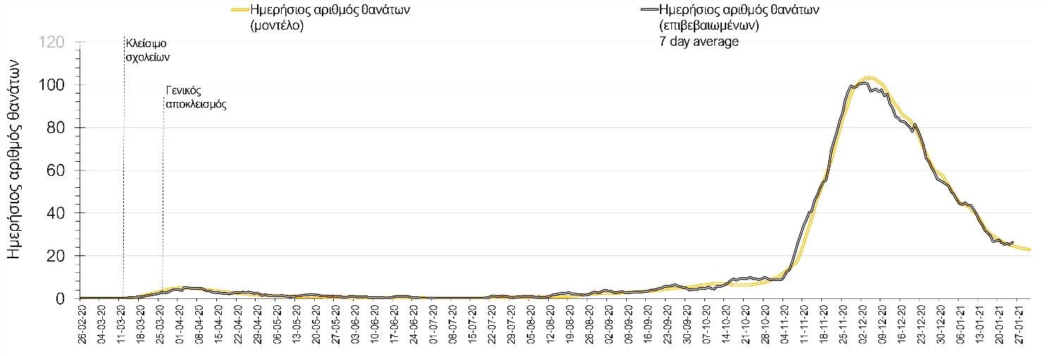 Ο αριθμός θανάτων (25) είναι ελαφρά αυξημένος σε σχέση με την Κυριακή (24), ενώ είναι ιδιαίτερα θετικό το γεγονός ότι εδώ και πλέον των 4 εβδομάδων παρέμεινε σε πτωτική πορεία, αν και ακολουθεί με υστέρηση δύο εβδομάδων την καμπύλη αποκλιμάκωσης σε ό,τι αφορά στα επιβεβαιωμένα κρούσματα.