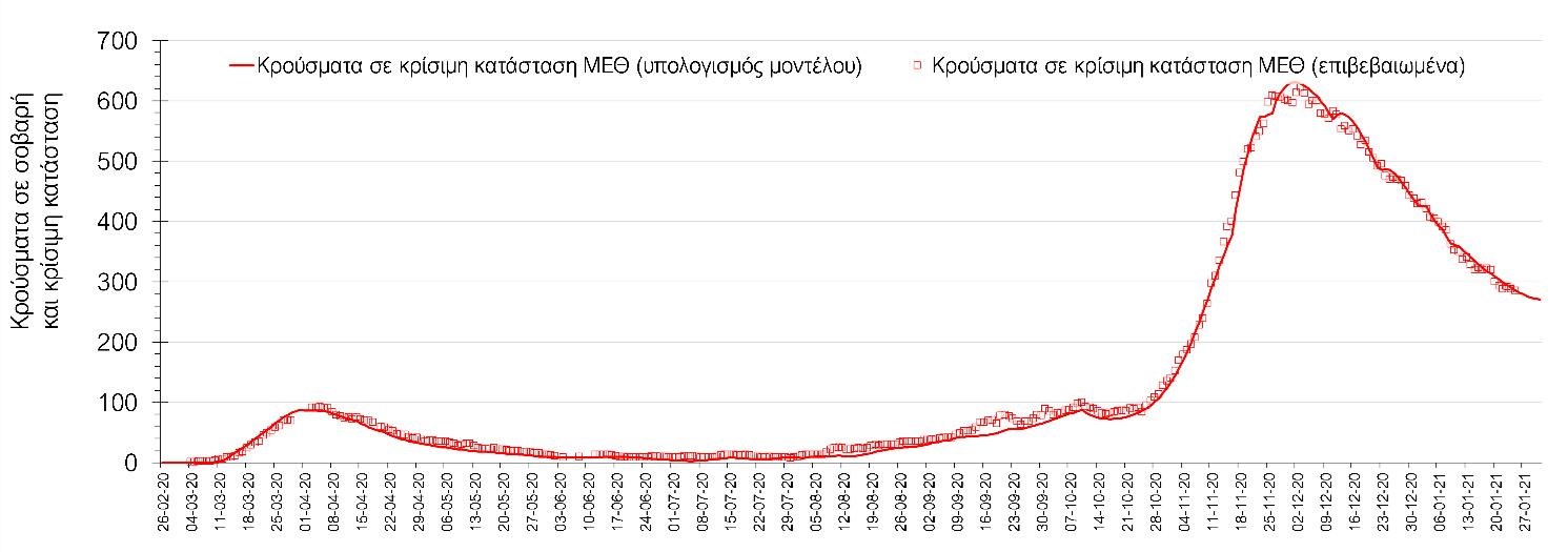 Όσον αφορά στους ασθενείς σε κρίσιμη κατάσταση (διασωληνομένοι σε ΜΕΘ), ο αριθμός μειώθηκε πολύ ελαφρά σε σχέση με της Κυριακή (286 από 288), και παραμένει στα αναμενόμενα επίπεδα. Η καμπύλη εξέλιξης του αριθμού των ασθενών που χρειάζονται διασωλήνωση φαίνεται να ακολουθεί αργά την πορεία που διαφαίνονταν και από την υπολογιστική πλατφόρμα CORE, όπως αυτή παρουσιάζεται στο Σχήμα 1, ενώ μια εκτίμηση για την πορεία των θανάτων παρουσιάζεται στο Σχήμα 2.