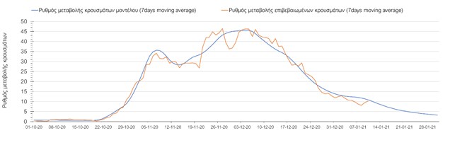 Σχήμα 11. Πορεία του ημερησίου αριθμού των κρουσμάτων (κυλιόμενος μέσος όρος 7 ημερών) στην
