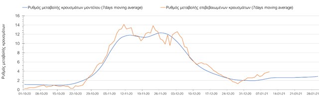 Όπως φαίνεται από το σχήμα, από τις 8 Ιανουαρίου προβλέπεται μια αύξηση κρουσμάτων η οποία θα κορυφωθεί στις 11 Ιανουαρίου και η οποία θα οφείλεται στη μείωση της περιστολής που σημειώθηκε στις γιορτές. Από τις 11 μέχρι τις 18 Ιανουαρίου προβλέπεται μια μείωση κρουσμάτων λόγω της εφαρμογής του lockdown που είναι σε ισχύ αυτήν την εβδομάδα. Από τις 19 Ιανουαρίου και έπειτα προβλέπεται να διαφανεί μια αύξηση κρουσμάτων που θα συνεχιστεί μέχρι το τέλος του μήνα, φτάνοντας στο επίπεδο ημερήσιων κρουσμάτων που ήταν η χώρα στις 29 Οκτωβρίου.