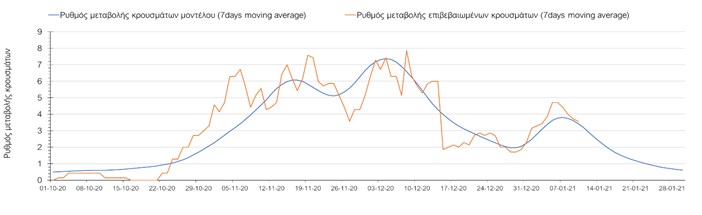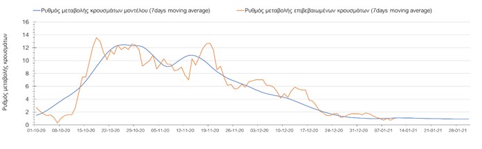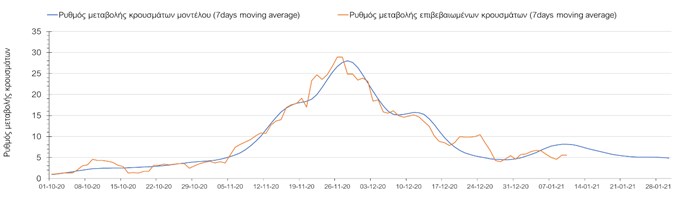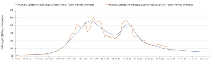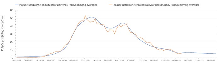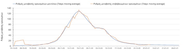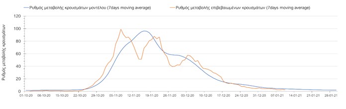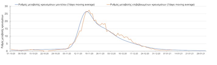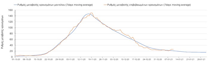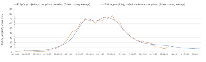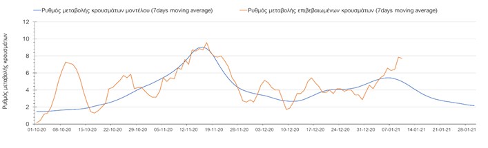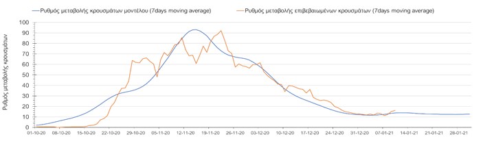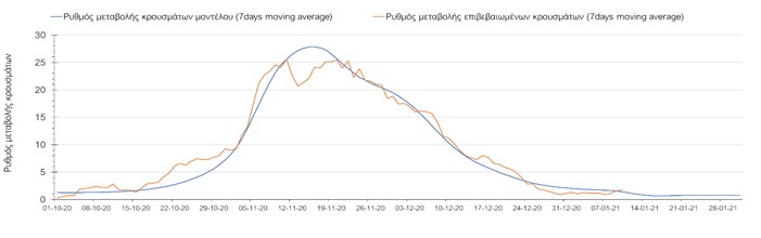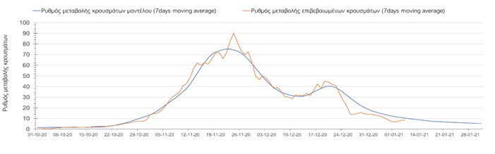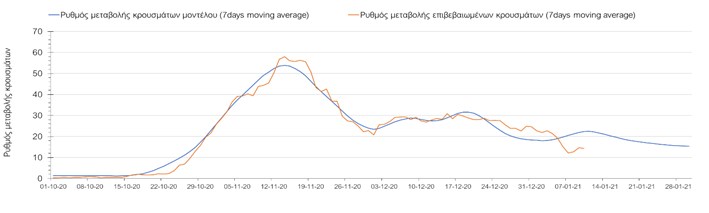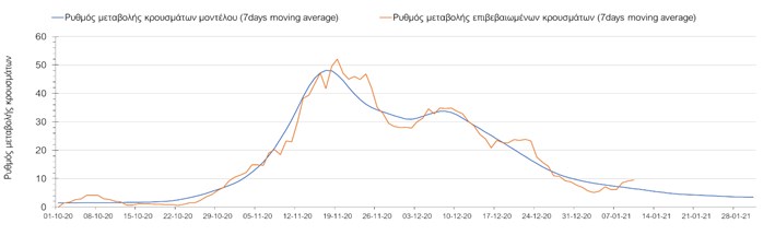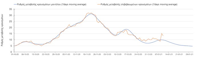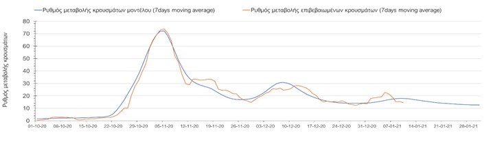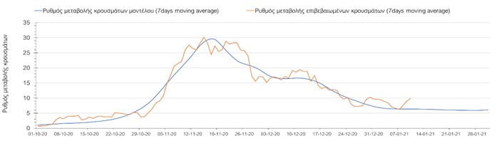 Όπως φαίνεται από το σχήμα, από τις 8 Ιανουαρίου προβλέπεται μια αύξηση κρουσμάτων η οποία θα κορυφωθεί στις 11 Ιανουαρίου και η οποία θα οφείλεται στη μείωση της περιστολής που σημειώθηκε στις γιορτές. Από τις 11 μέχρι τις 18 Ιανουαρίου προβλέπεται μια μείωση κρουσμάτων λόγω της εφαρμογής του lockdown που είναι σε ισχύ αυτήν την εβδομάδα. Από τις 19 Ιανουαρίου και έπειτα προβλέπεται να διαφανεί μια αύξηση κρουσμάτων που θα συνεχιστεί μέχρι το τέλος του μήνα, φτάνοντας στο επίπεδο ημερήσιων κρουσμάτων που ήταν η χώρα στις 29 Οκτωβρίου.