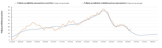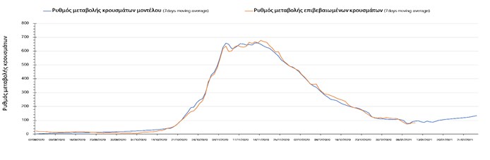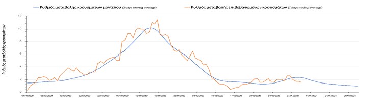Σε πανελλαδικό επίπεδο ο κυλιόμενος εβδομαδιαίος μέσος όρος του δείκτη θετικότητας μειώθηκε στο 3,3% (η ημερήσια τιμή σήμερα είναι 2,3%) ενώ ο κυλιόμενος εβδομαδιαίος μέσος όρος του πραγματικού αριθμού αναπαραγωγής Rt (δηλαδή ο αριθμός των ατόμων που ένας φορέας μπορεί να επιμολύνει) είναι 0,77 (τιμές του Rt κάτω από τη μονάδα υποδηλώνουν καθαρή μείωση της διασποράς του ιού στην κοινότητα).