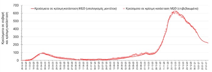 Όσον αφορά στους ασθενείς σε κρίσιμη κατάσταση (διασωληνωμένοι σε ΜΕΘ), την Κυριακή ο αριθμός μειώθηκε σε σχέση με το Σάββατο (353 από 362), και παραμένει στα αναμενόμενα επίπεδα. Η καμπύλη εξέλιξης του αριθμού των ασθενών που χρειάζονται διασωλήνωση φαίνεται να ακολουθεί αργά την πορεία που διαφαίνονταν και από την υπολογιστική πλατφόρμα CORE, όπως αυτή παρουσιάζεται στο Σχήμα 1, ενώ μια εκτίμηση για την πορεία των θανάτων παρουσιάζεται στο Σχήμα 2.