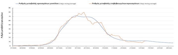 Σχήμα 11. Πορεία του ημερησίου αριθμού των κρουσμάτων (κυλιόμενος μέσος όρος 7 ημερών) στην