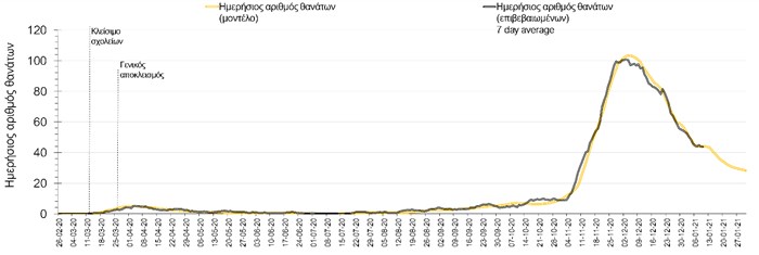 Σχήμα 2. Αριθμός θανάτων (κυλιόμενος μέσος όρος 7 ημερών) σύμφωνα με τα στοιχεία του ΕΟΔΥ και τις προβλέψεις της υπολογιστικής πλατφόρμας CORE.Και στις δύο περιπτώσεις φαίνεται ότι βρισκόμαστε περίπου γύρω στο 65% της αποκλιμάκωσης όπως είχαμε προβλέψει (βλέπε σχήματα 1 και 2). Περιμένουμε ότι αυτή η αποκλιμάκωση θα συνεχιστεί αλλά με χαμηλότερο ρυθμό στις επόμενες ημέρες και σε ό,τι αφορά στον αριθμό των ασθενών που είναι διασωληνωμένοι σε ΜΕΘ και στους θανάτους από COVID-19 και με δεδομένη την άρση των μέτρων περιστολής που ισχύουν αυτή την εβδομάδα αναμένεται μια αργή αναστροφή της αποκλιμακωτικής πορείας από τις 27 Ιανουαρίου και έπειτα.