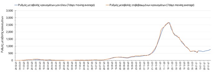 Η πορεία της μέσης εβδομαδιαίας τιμής των κρουσμάτων όπως έχουν καταγραφεί από τον ΕΟΔΥ και η αναμενόμενη πορεία τους όπως προδιαγράφεται από την υπολογιστική πλατφόρμα CORE για την Ελληνική επικράτεια μέχρι το τέλος του Ιανουαρίου, αποτυπώνονται στο Σχήμα 3. Στις προβλέψεις έχει συμπεριληφθεί η απόφαση εφαρμογής αυστηρού lockdown από την Κυριακή 3 Ιανουαρίου μέχρι και τις 17 Ιανουαρίου. Στις 11 Ιανουαρίου προβλέπεται άνοιγμα της πρωτοβάθμιας εκπαίδευσης, ενώ το άνοιγμα των βιβλιοπωλείων, κομμωτηρίων αλλά και λιανικού εμπορίου με τη μέθοδο click-away, καθώς και δια ζώσης δευτεροβάθμια εκπαίδευση προβλέπεται να λειτουργήσει στις 25 Ιανουαρίου.